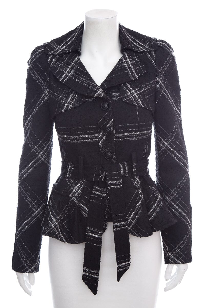 Nanette Lepore Black/ White Plaid Button Up Jacket with Belt. This item is in good condition.