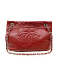 Textured red caviar leather tote has a colossal interlocking CC tonally stitched on the roomy front slip pocket. Quilted and footed bottom. Silver chain and leather entwined straps lace through CHANEL engraved grommets and allow for easy expansion. May be carried comfortably on the shoulder, single or double. Made in France. Intact hologram and dust bag included.