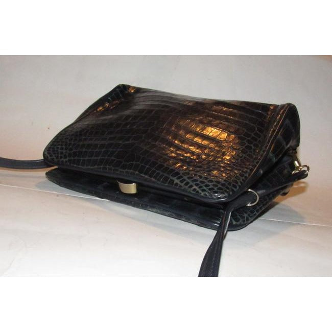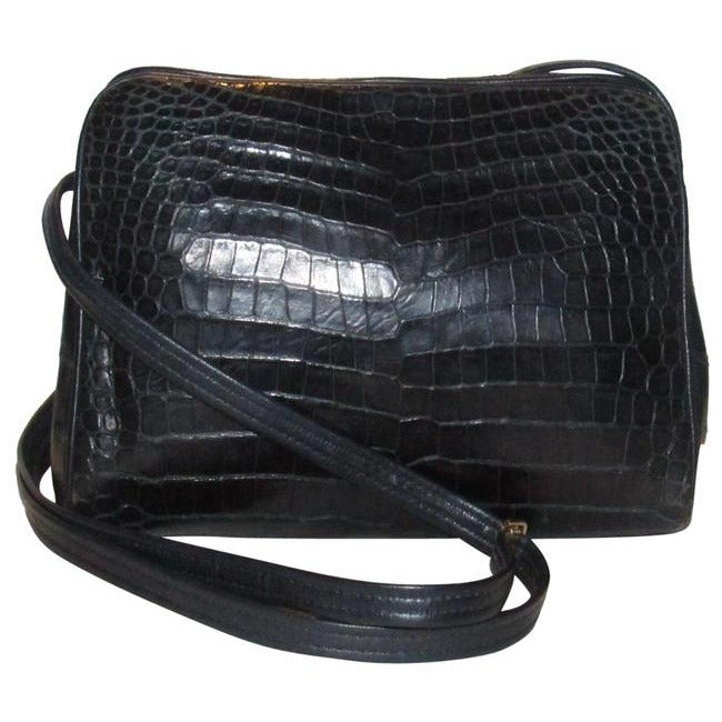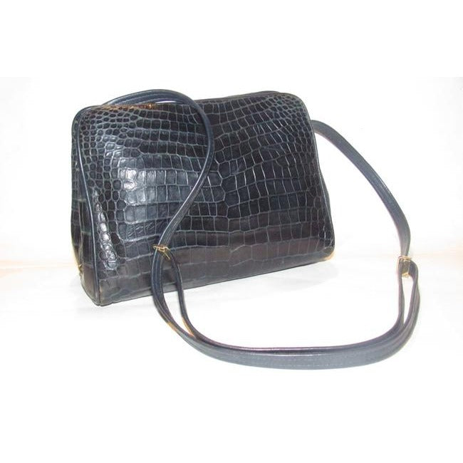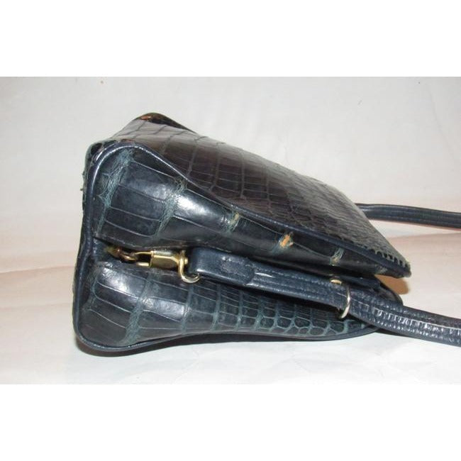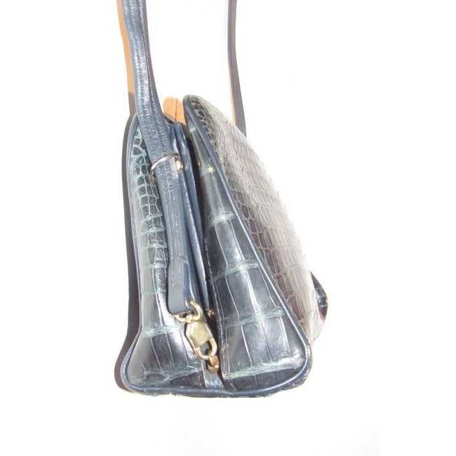 ^For sale is a vintage, Neiman Marcus, navy crocodile leather cross body or shoulder purse with bold gold hardware, an adjustable leather strap, expandable sides/bottom, a hinged, top snap closure, and Italian made quality! This vintage purse from Neiman Marcus has an edgy, modern, European look that is always in style!