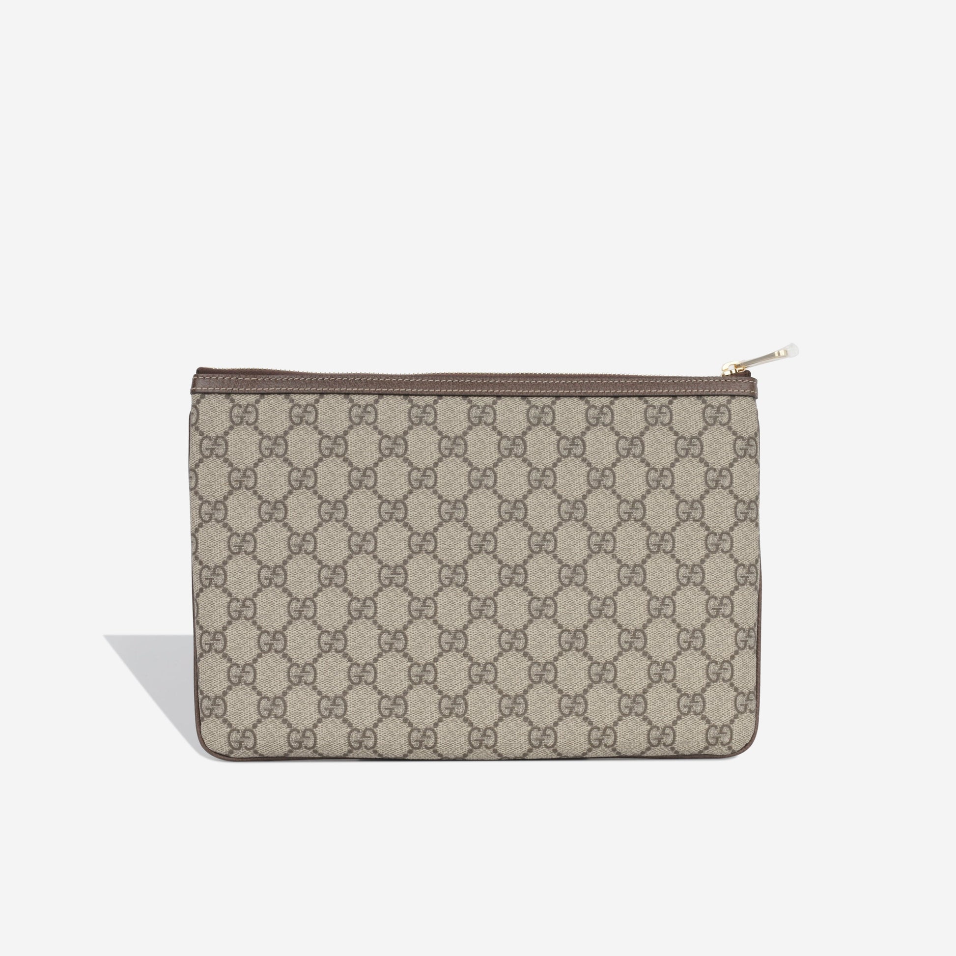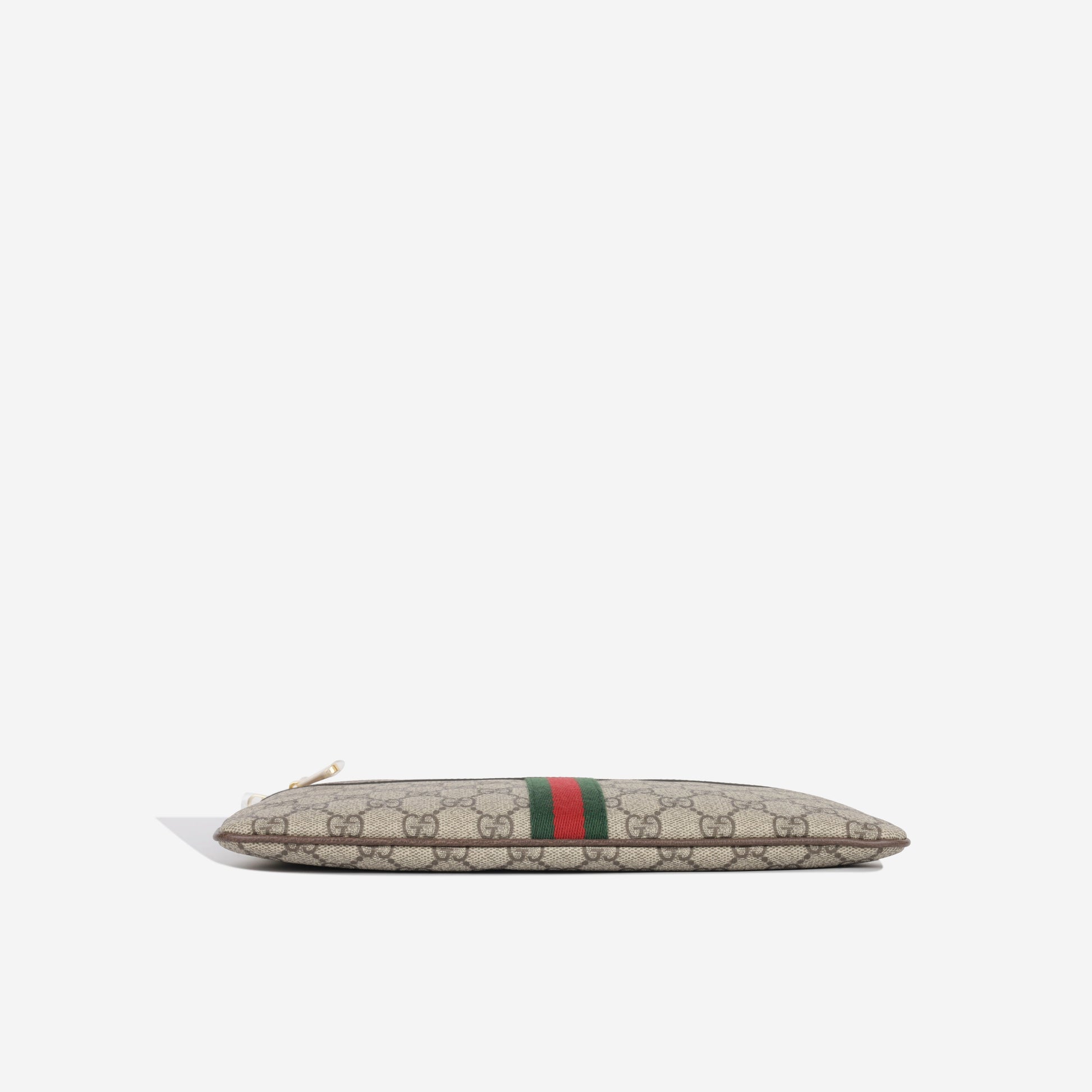 Crafted from the brand's signature GG Supreme monogram canvas, Gucci presents their Ophidia pouch. Accented with gold-tone hardware, brown leather trimming and Gucci's classic red and green fabric strip down the front, the Ophidia is an absolute must-have for any woman with a love for luxury and a soft spot for timepieces.