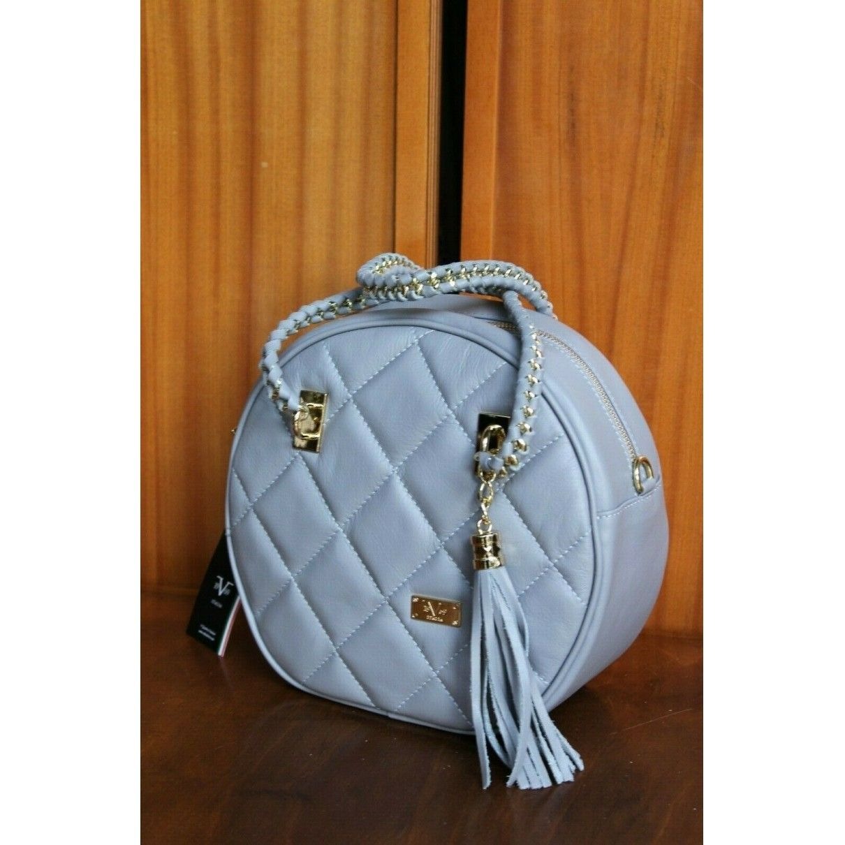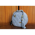 For sale is an NWT, Versace, dove gray quilted leather, round, canteen style, satchel, shoulder or cross body bag with two chain and leather handles, a detachable leather shoulder strap, gold hardware, leather tassel accent and a top zip closure! It's a chic and edgy style from Versace that will quickly become a wardrobe essential!
