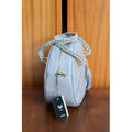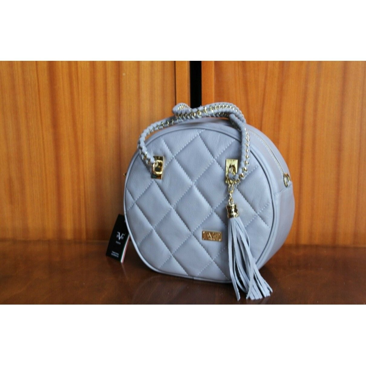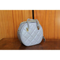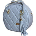 NWT, Versace, dove gray quilted leather, round, canteen style, satchel, shoulder or cross body bag with two chain and leather handles
