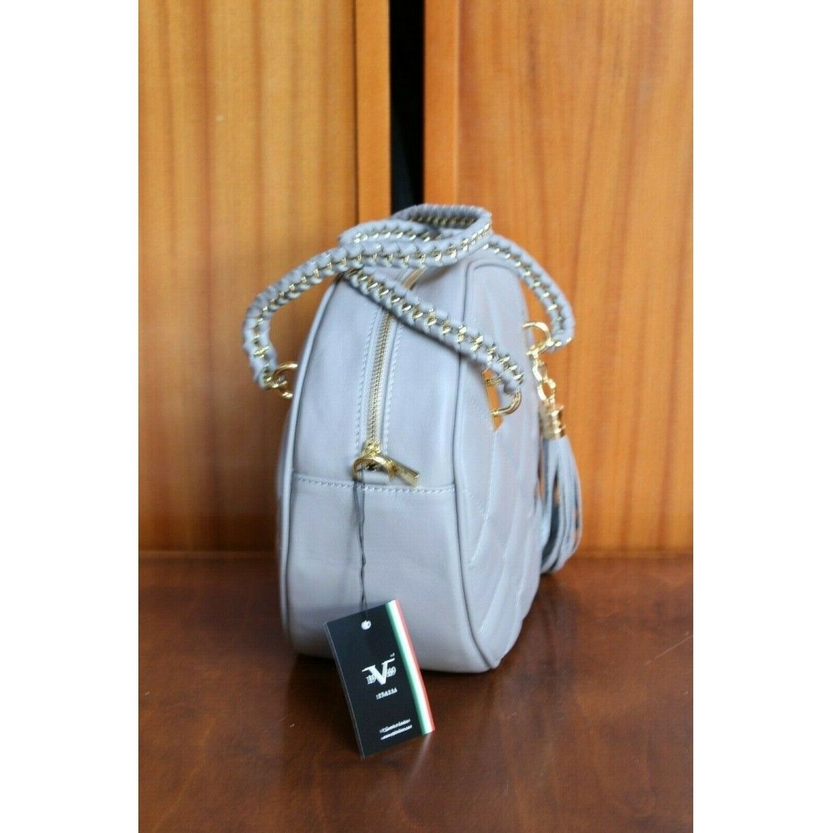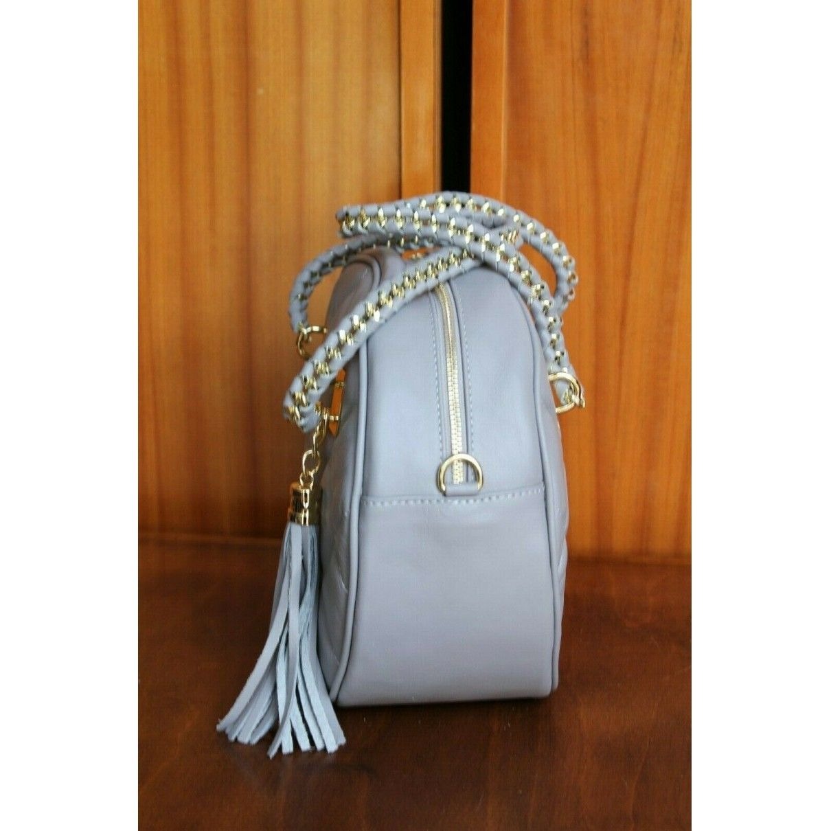 The two-way style handbag is in dove gray leather with a quilted design and has two gold chains and braided leather pocket straps, as well as a removable leather strap that is attached on both sides. It has a top zip closure and a matching XL leather tassel holder. It has an engraved plaque on the front with the Versace logo. It has its original tags attached and has never been used.