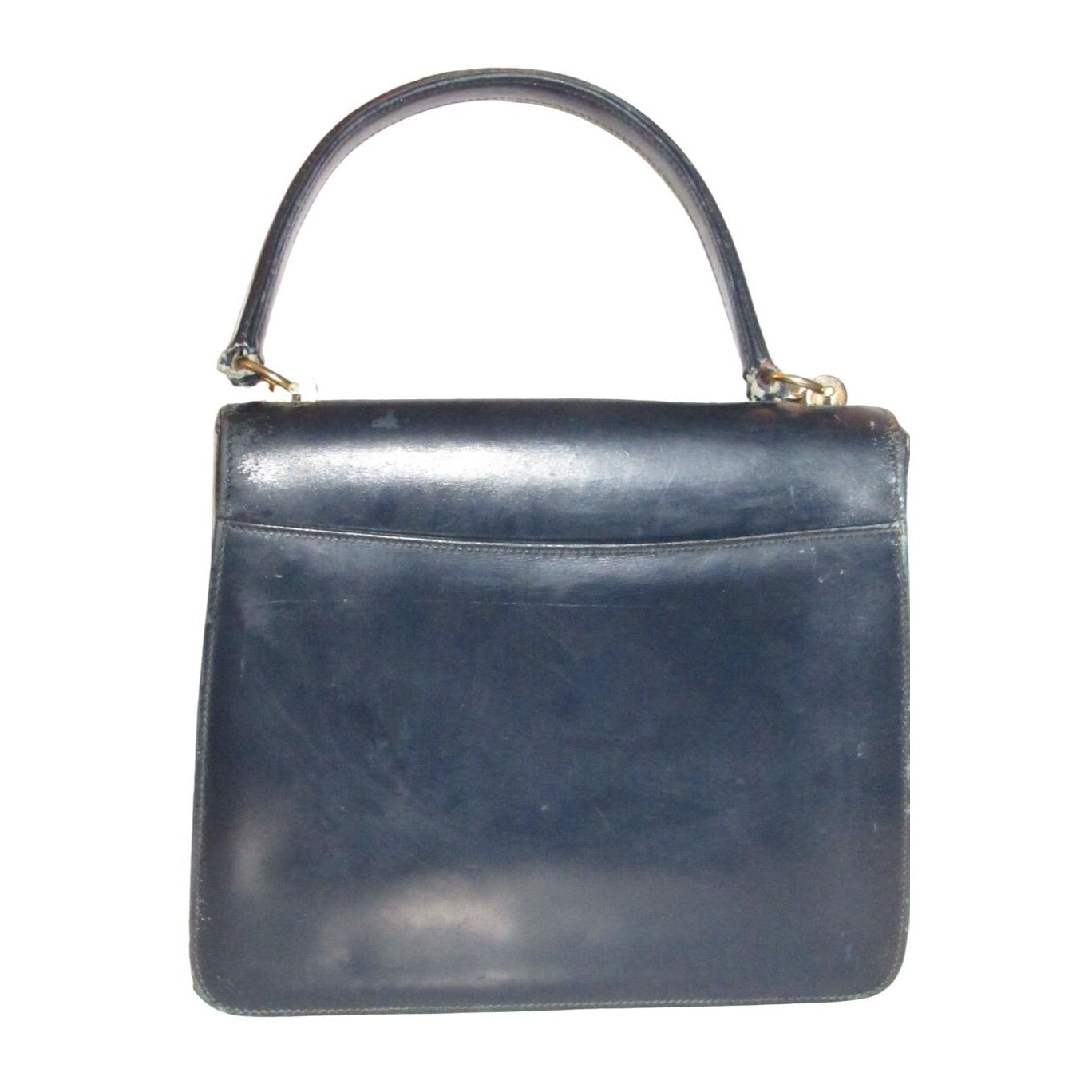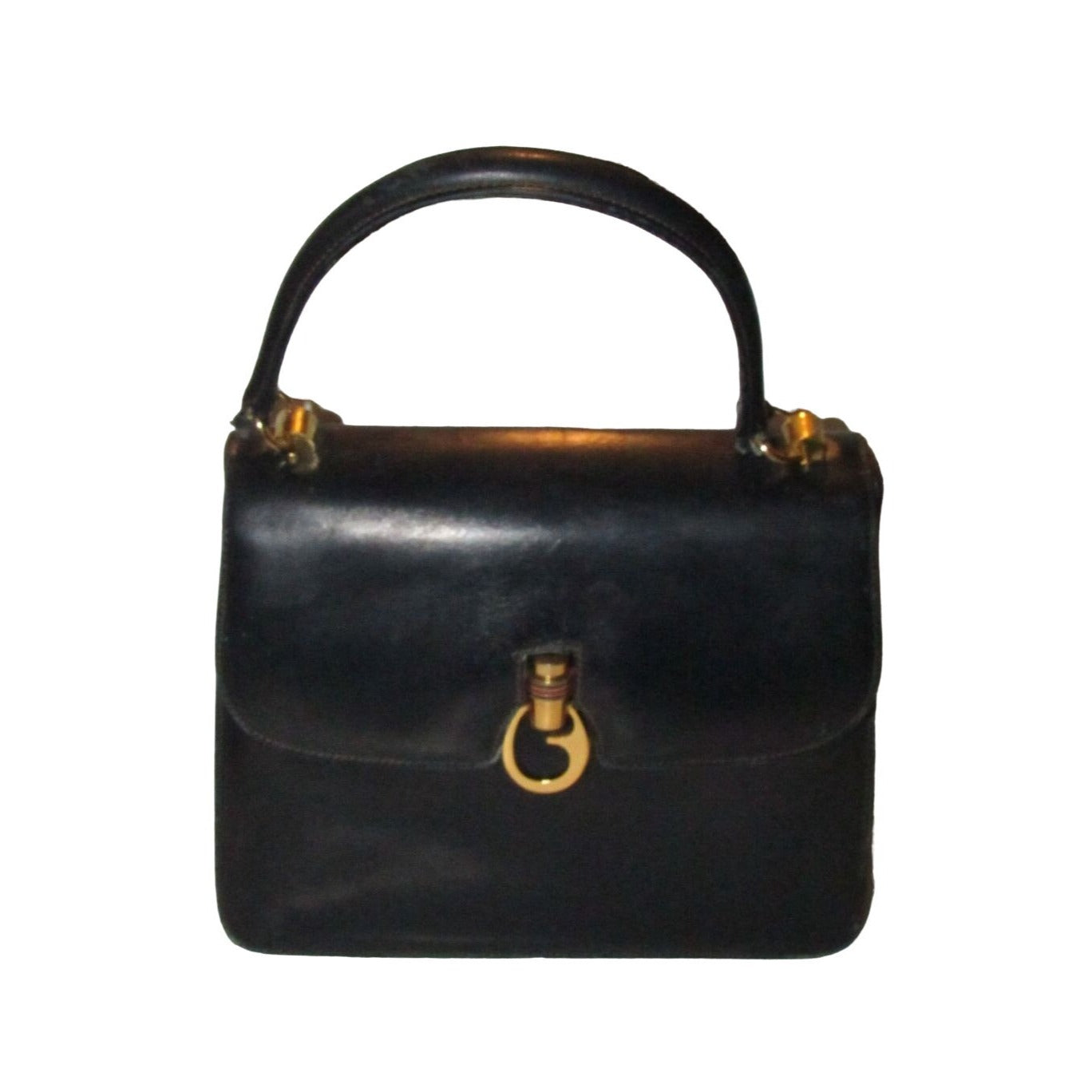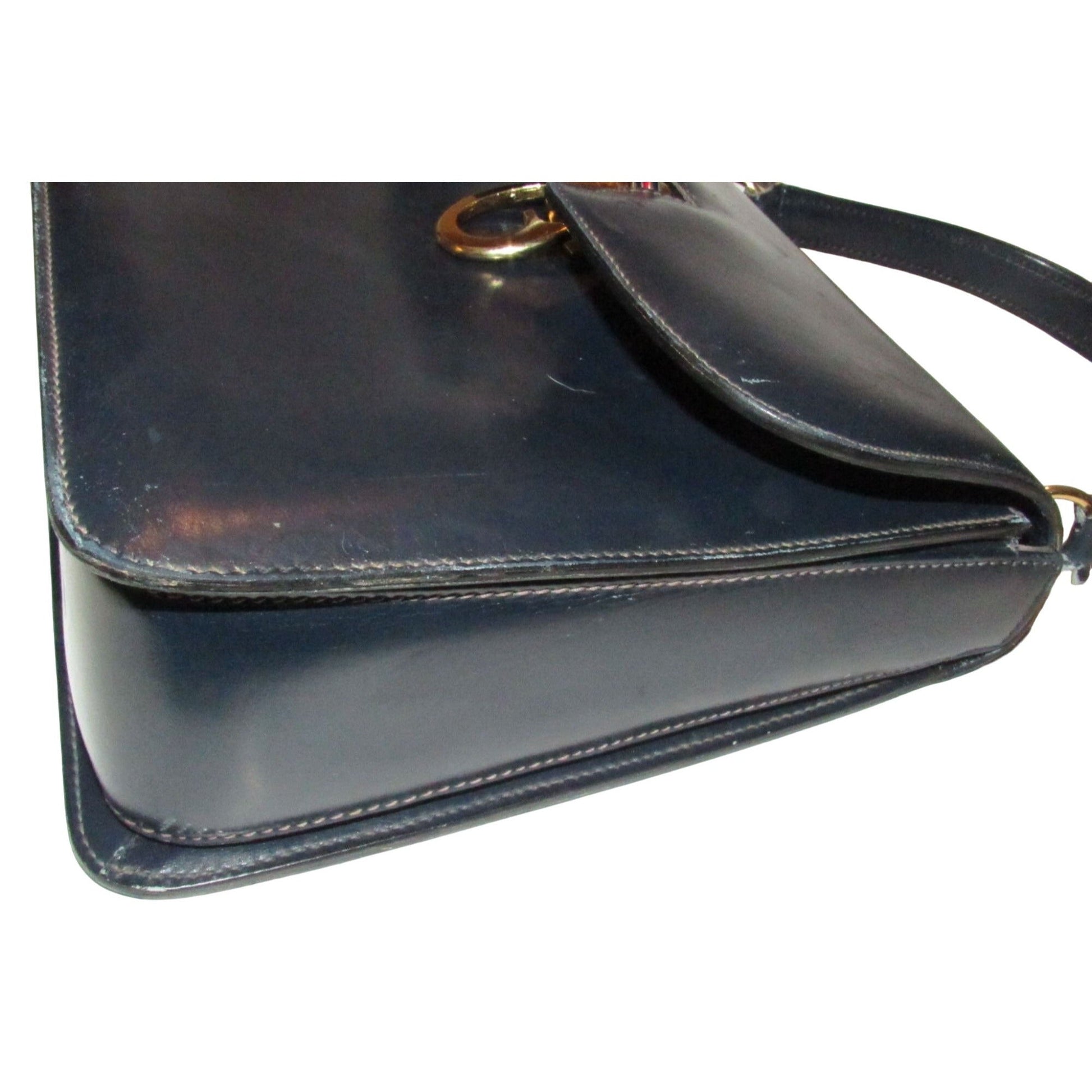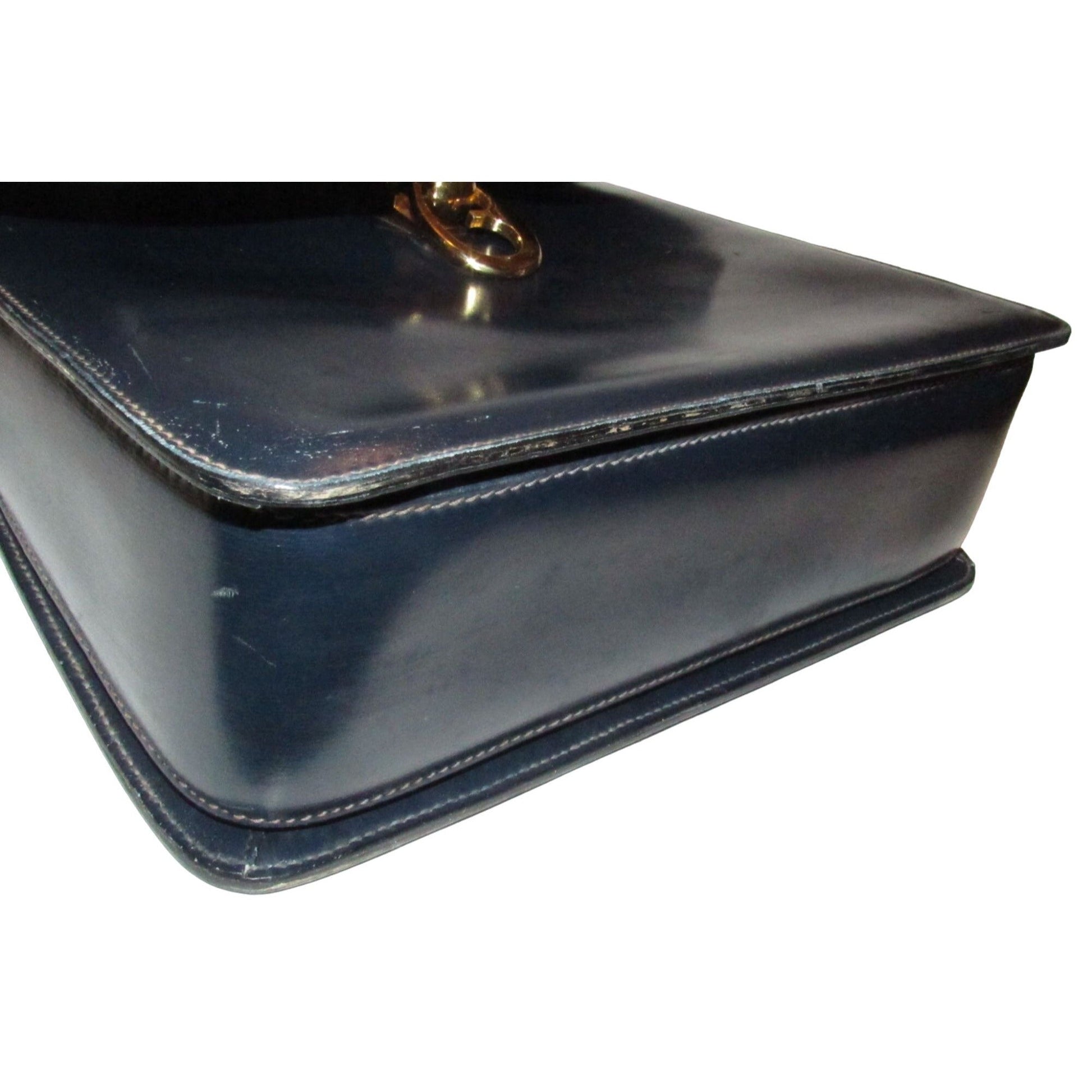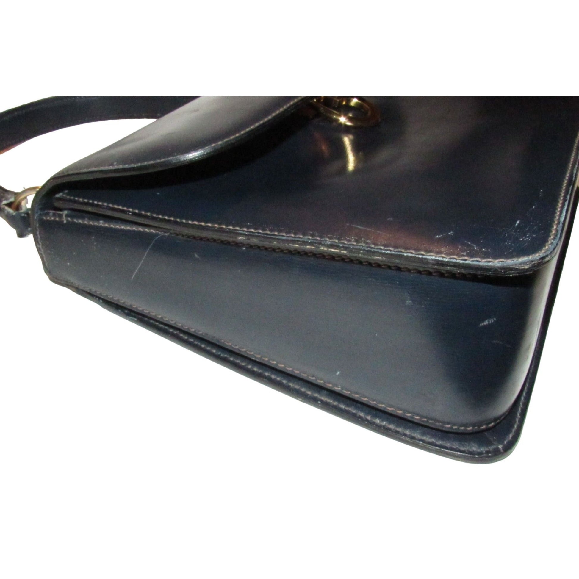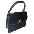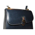 One of a kind, early Gucci, 1960's mod, hard and boxy, structured, navy leather, top handle shoulder bag with gold, equestri