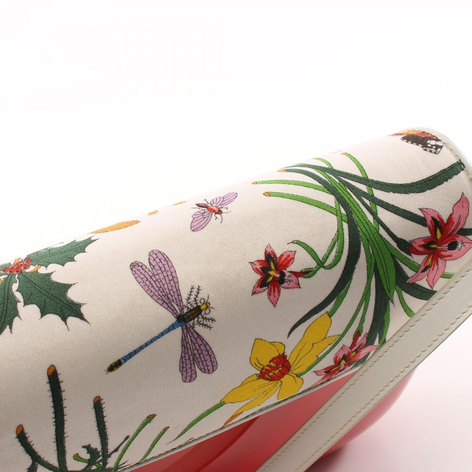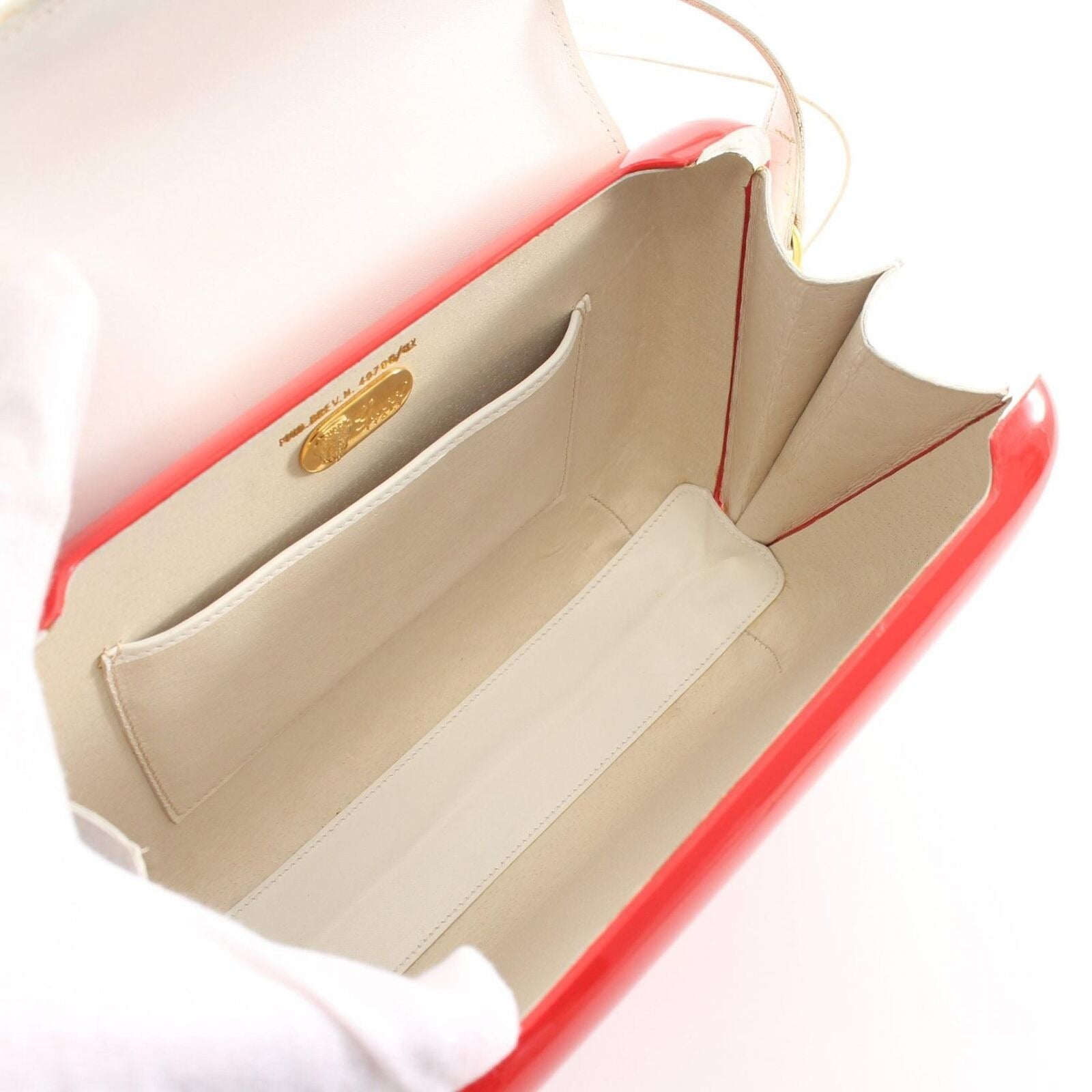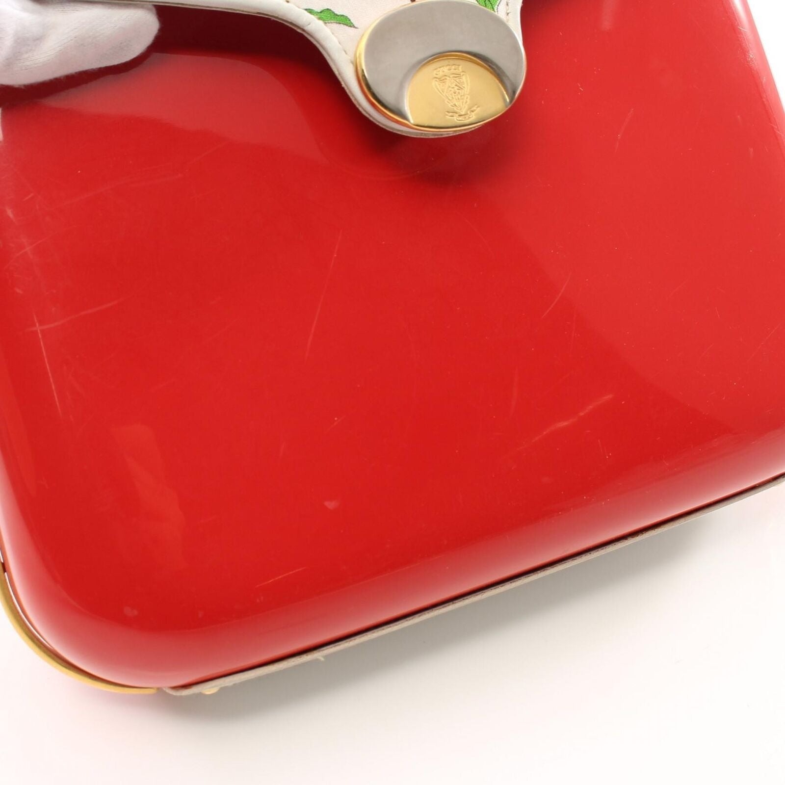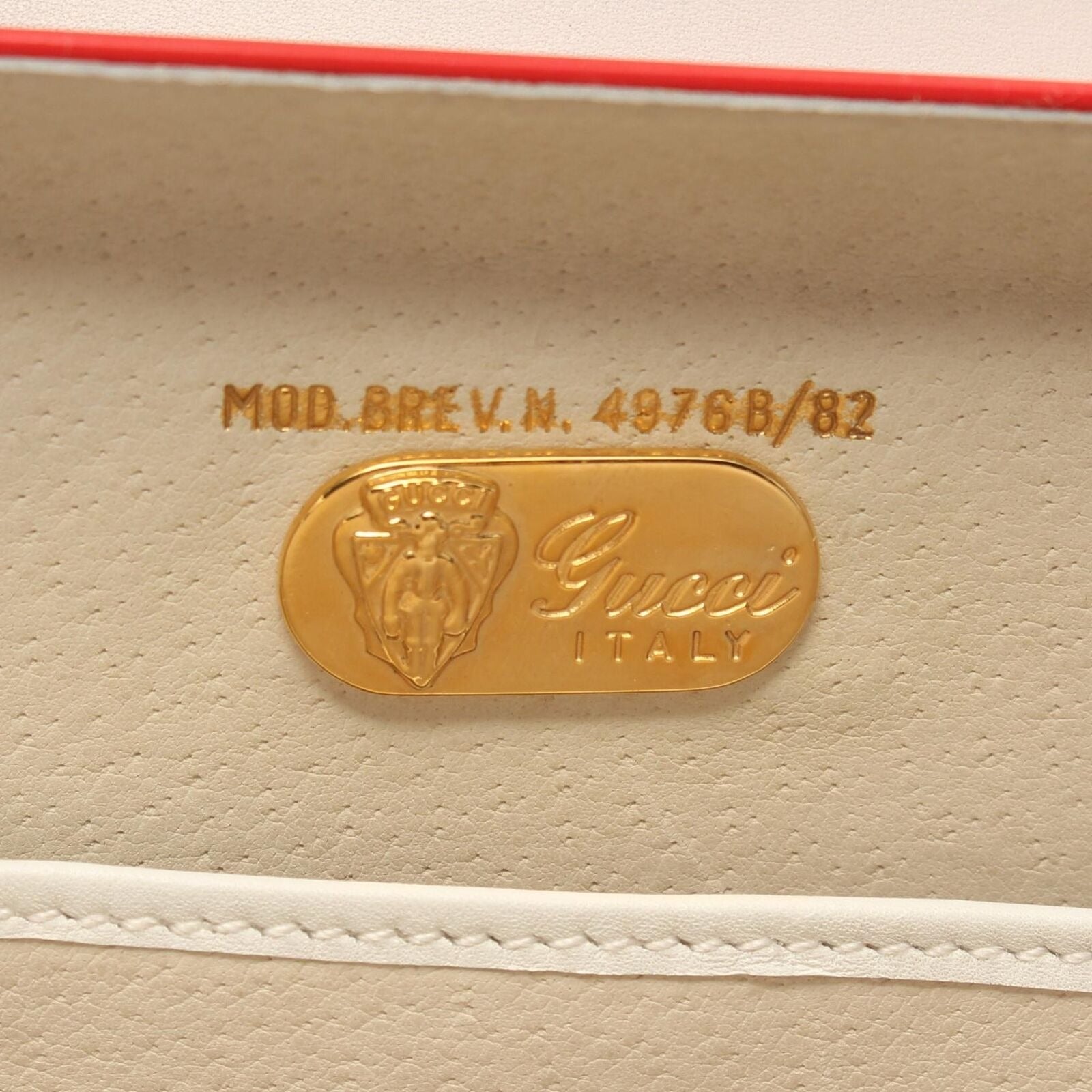 The purse has a very geometric Art Deco style design. It is made of two, hard, smooth Lucite sides in true red Lucite framed in gold horse-bit accents. Together, they make a clamshell style purse with an envelope style, white leather flap top with a multicolor floral print! It has a snap closure with a large two-tone snap engraved Gucci and a white leather strap.