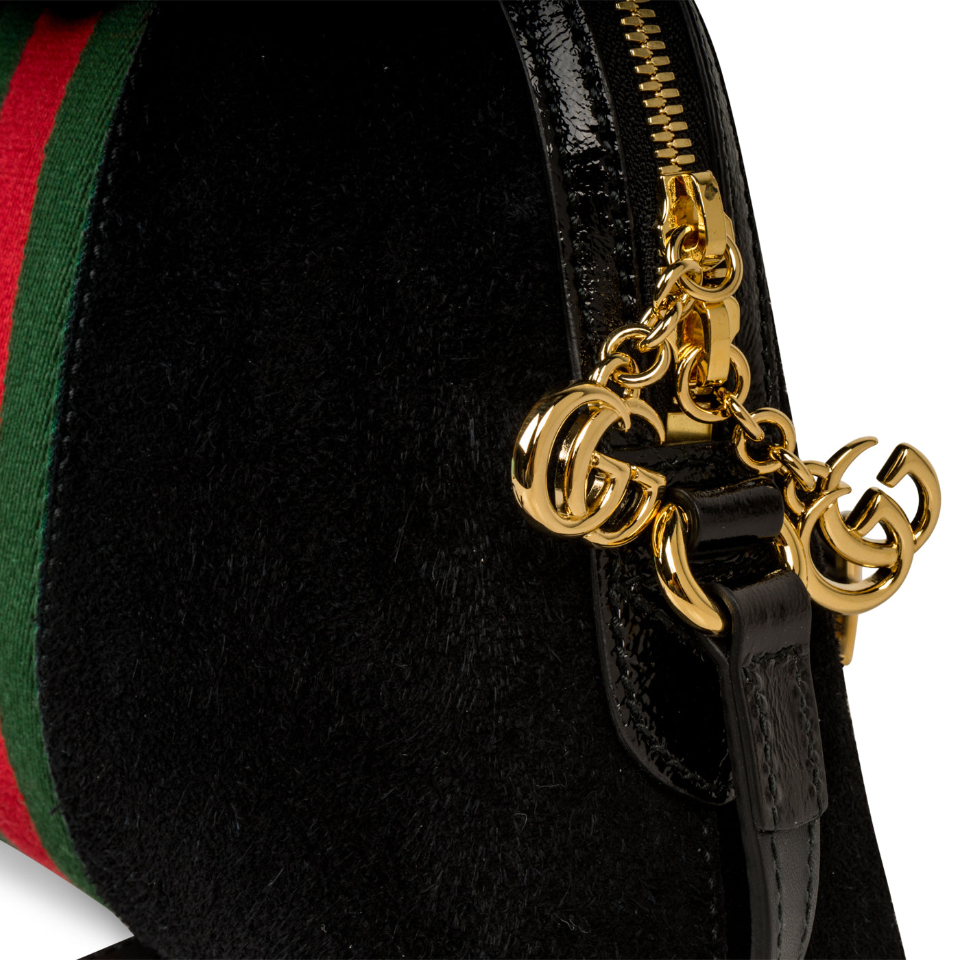 Gucci presents their Ophidia cross-body bag, crafted from black suede and accentuated by gold-tone hardware. An effortlessly cool bag, this Ophidia features?ÿ black patent leather details and Gucci's classic red and green fabric strip down the front. The Ophidia is an absolute must-have for any Gucci fanatic with a love for timepieces. Though sheƒ??s isn't a vintage model, she is the perfect balance between old and new. A somewhat modernized version of a traditional Gucci bag, the Ophidia reminds us of a vintage piece that's been pushed forward into the contemporary world - and we're here for it. Though the brand is known for its eccentric aesthetic, flamboyant styles filled with bright colours, patterns and logos - but this ƒ??low-key luxuryƒ?? bag manages to be glamorous in the most modest way possible. Suitable for any and every occasion, this bag is the ideal compliment to pretty much anything in your wardrobe. A sophisticated piece with elements of youth and playfulness, the Ophidia is a well-worthy addition to any woman's luxury handbag collection.?ÿ