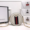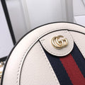 The world of Ophidia evolves with the introduction of a round mini bag with a chain shoulder strap. Crafted in GG Supreme canvas with inlaid green and red Web stripe, the accessory is enhanced by a petite play on the Double G, an archival Gucci code from the '70s that appears atop a leather tab detail and on the zipper pull.