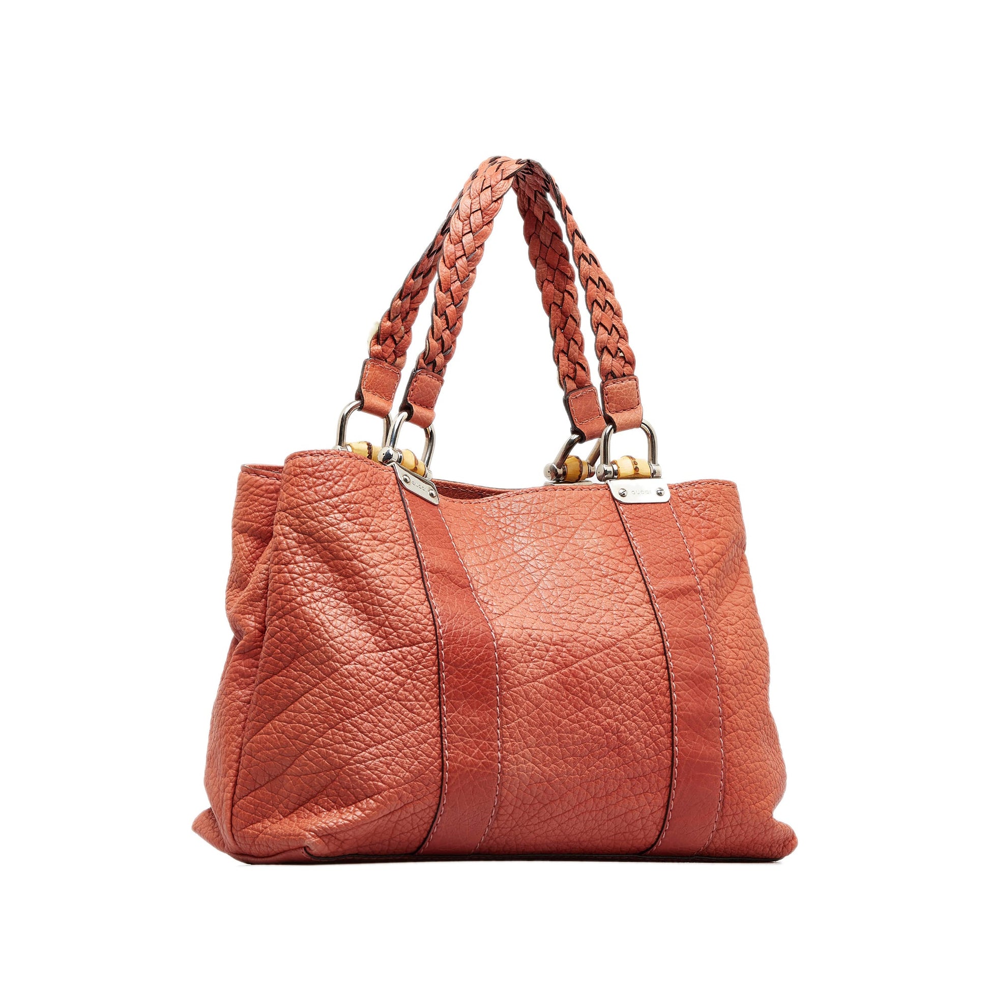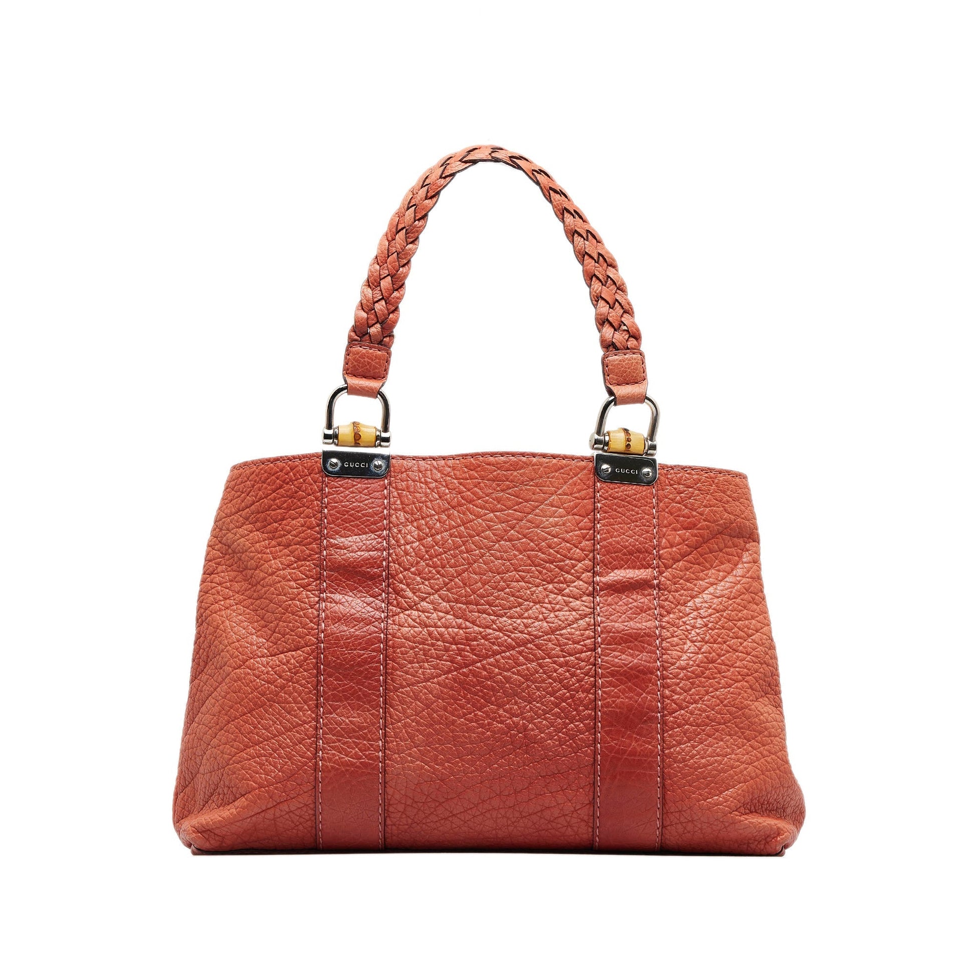 Product Details: Orange Gucci Bamboo Libeccio Tote Bag. This tote features a leather body, flat braided straps, open top, interior zip compartment, and interior zip and slip pockets. 10.4" L x 15" W x 4.3" D, 7.1" drop. Serial number 232947.