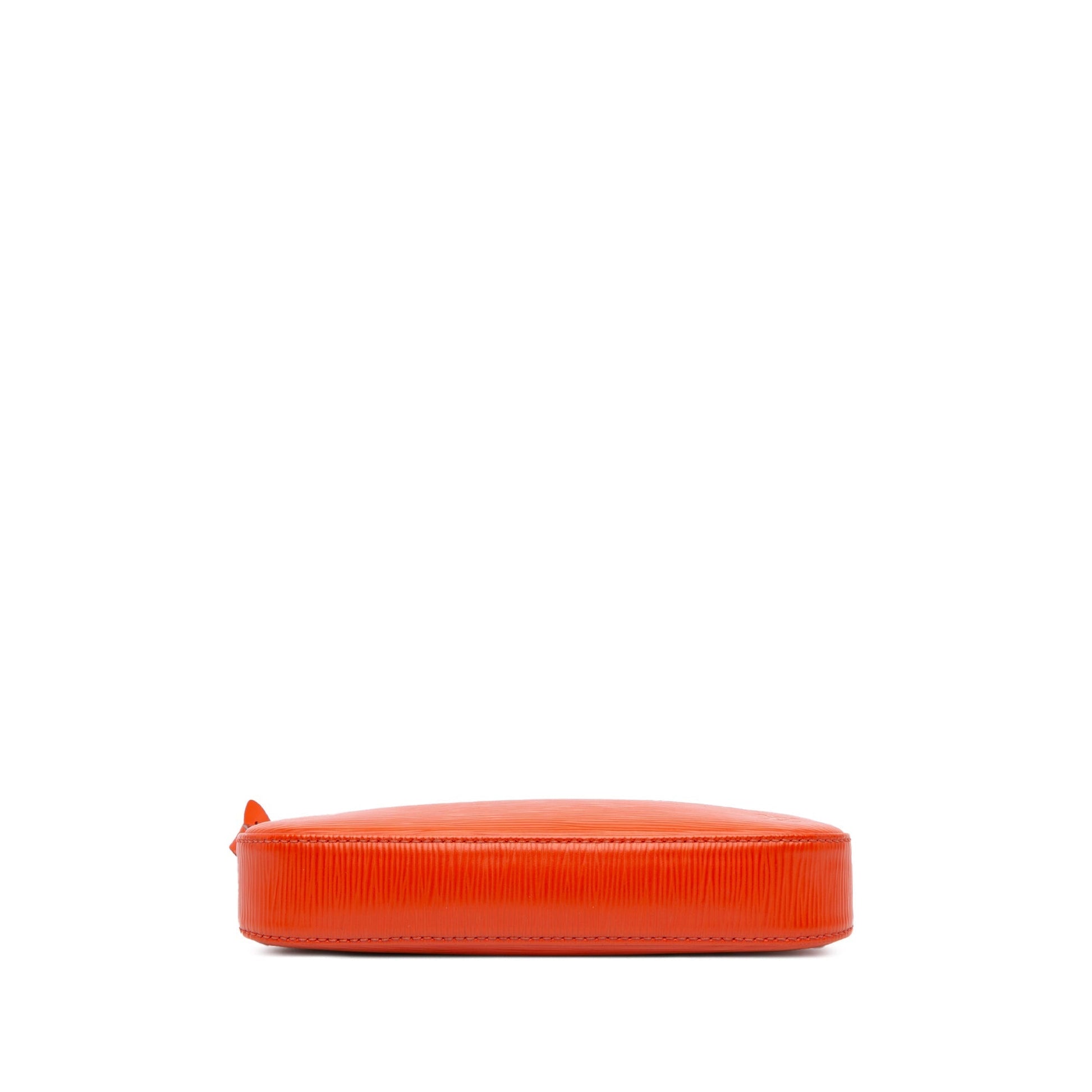 Product Details: Orange Louis Vuitton Epi Pochette Accessoires Shoulder Bag. The Pochette Accessoires features an epi leather body, a flat leather strap, a top zip closure and an interior zip pocket. 5.1" L x 9.1" W x 1.6" D. Serial number TR4192.