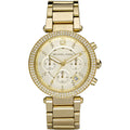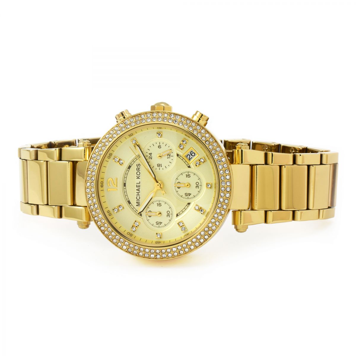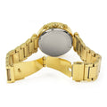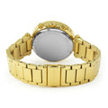 Gold-tone stainless steel case and bracelet.
