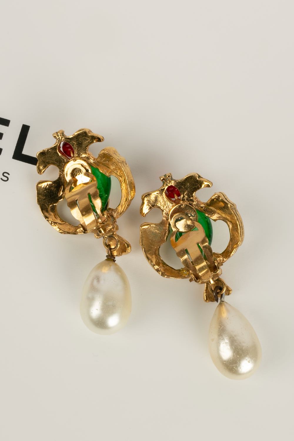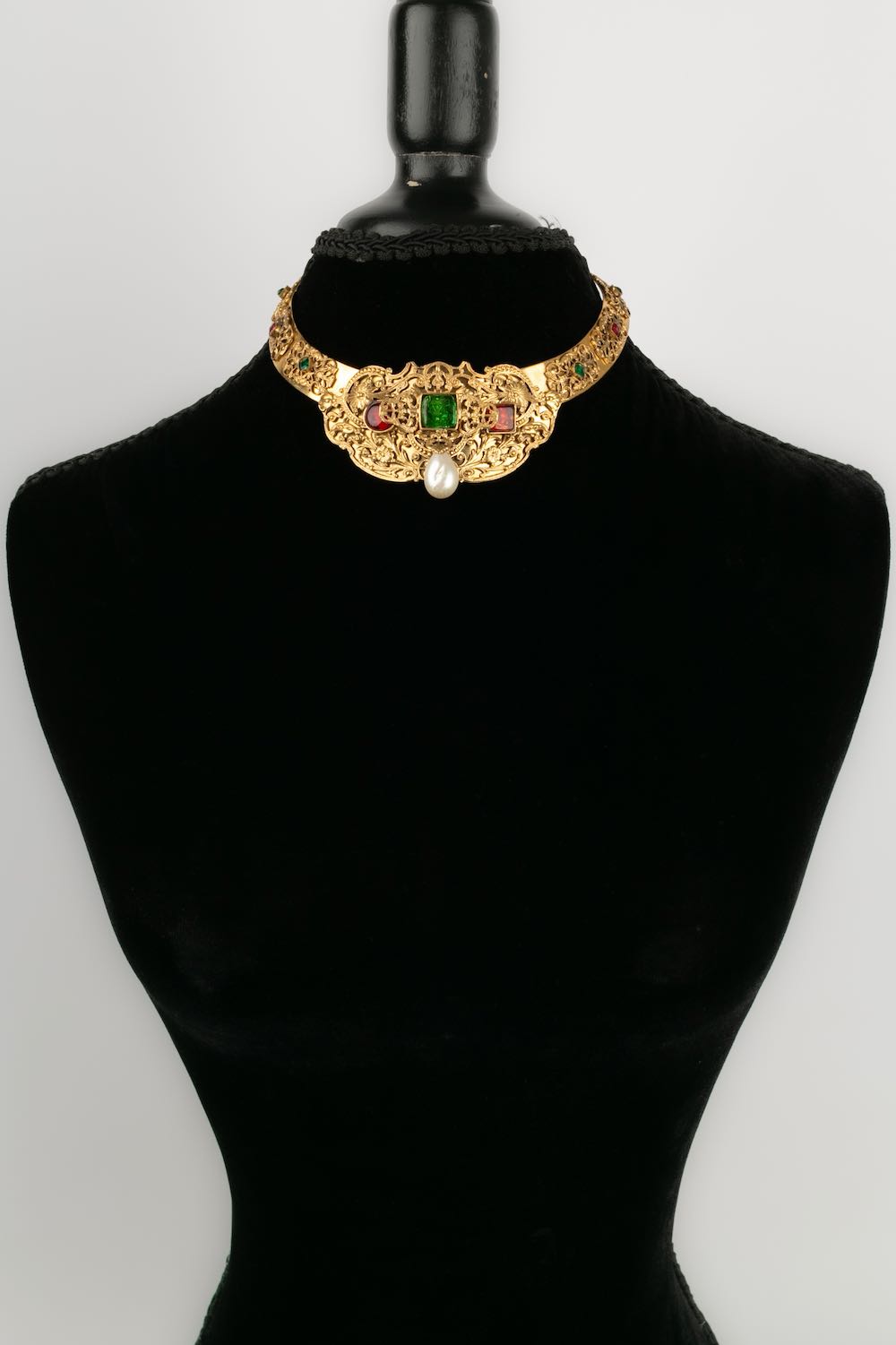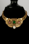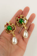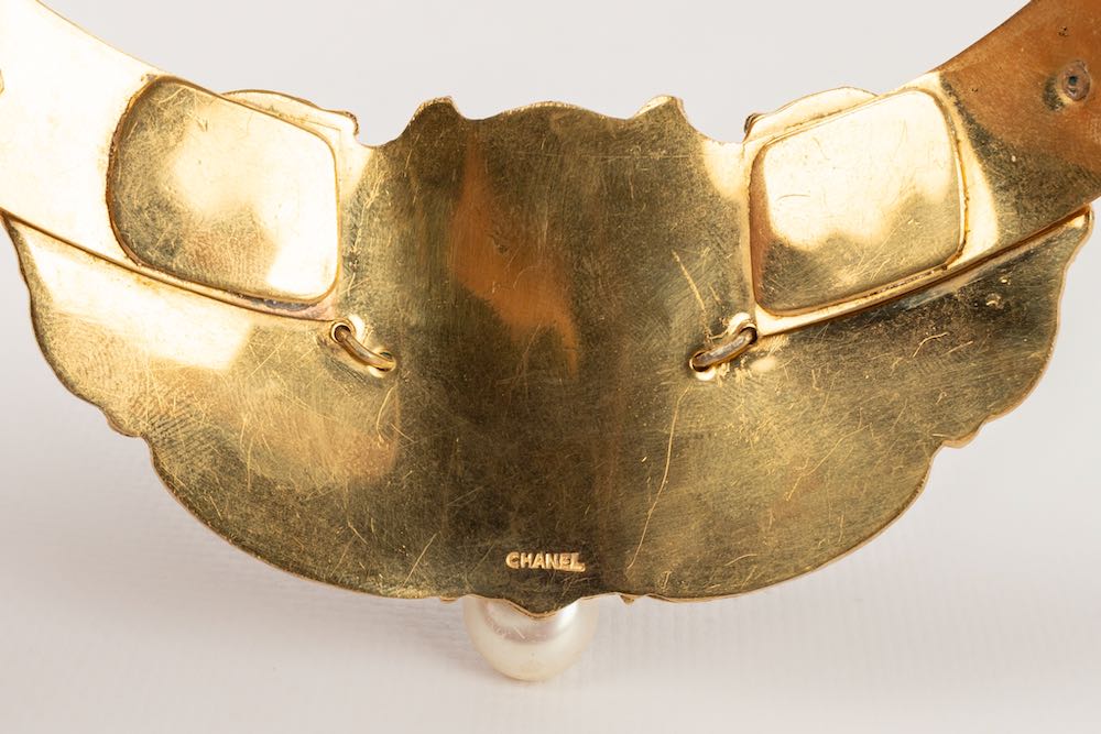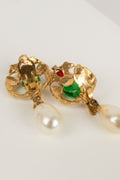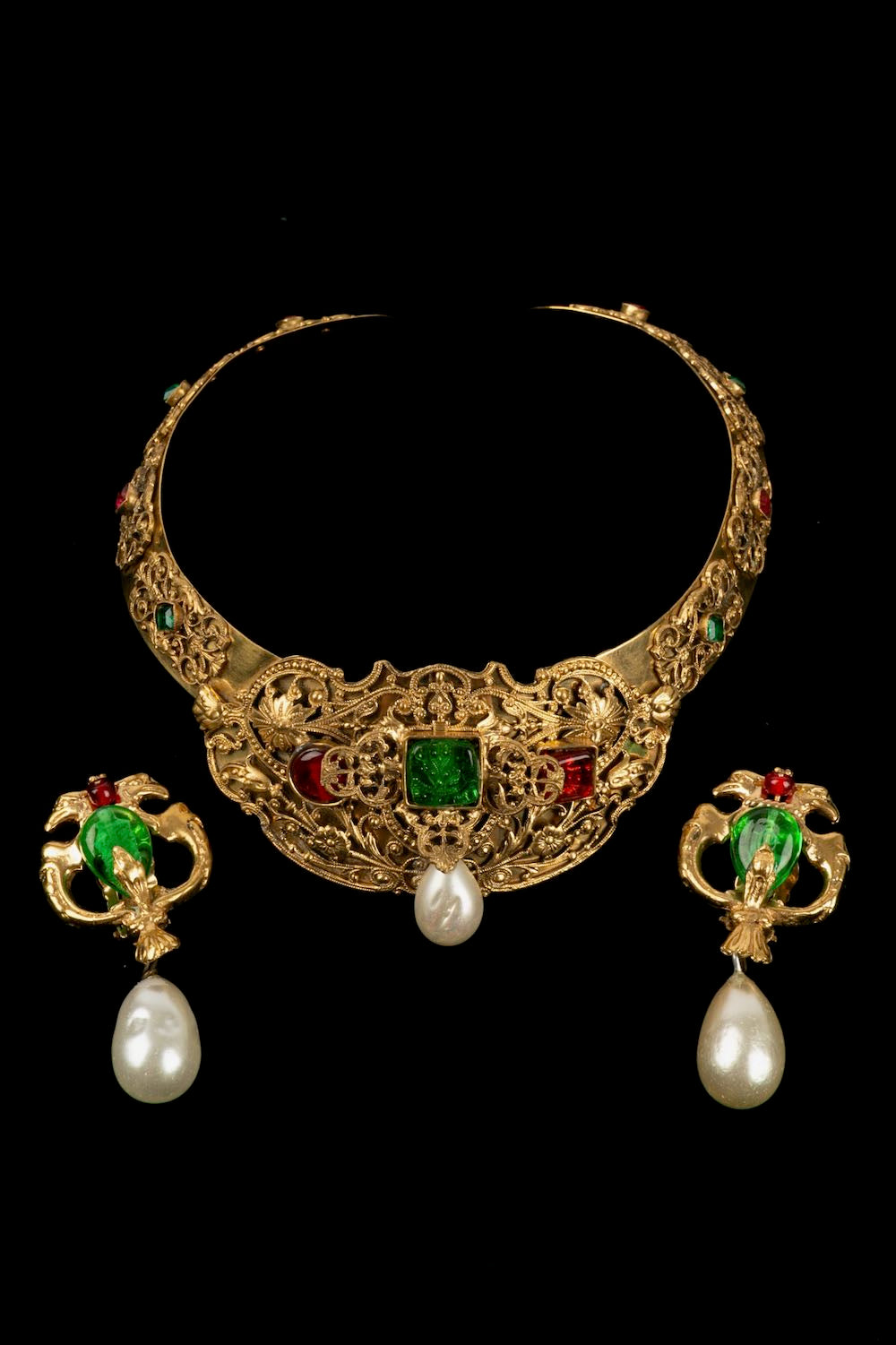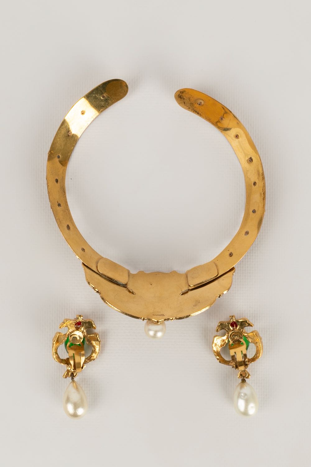 CHANEL -Parure compos� d'un collier court et d'une paire de boucles d'oreilles en m�tal dor�, p�te de verre et goutte de nacre. Travail de l'atelier Robert Goossens. Collection Automne-Hiver 1969-1970.