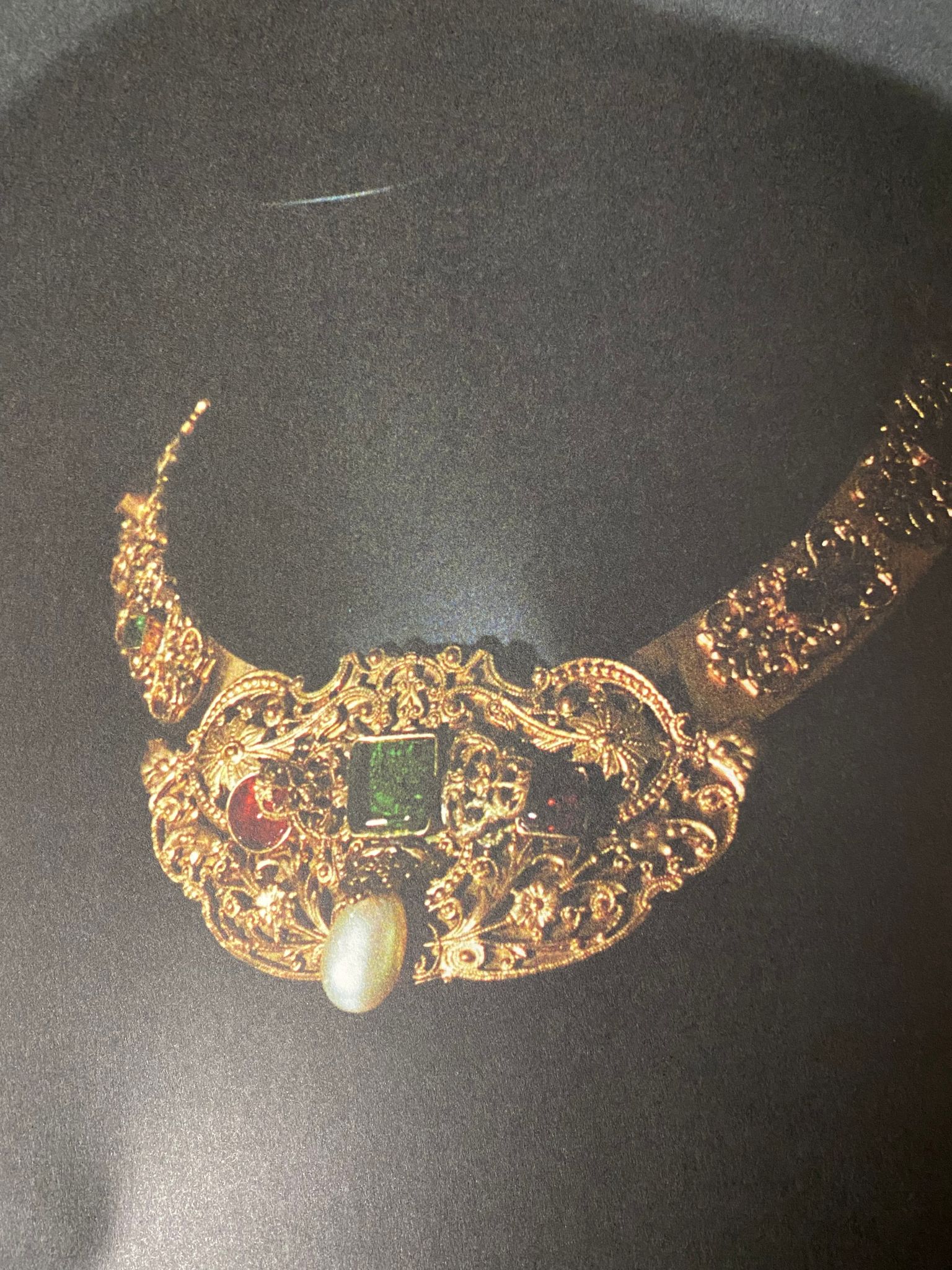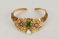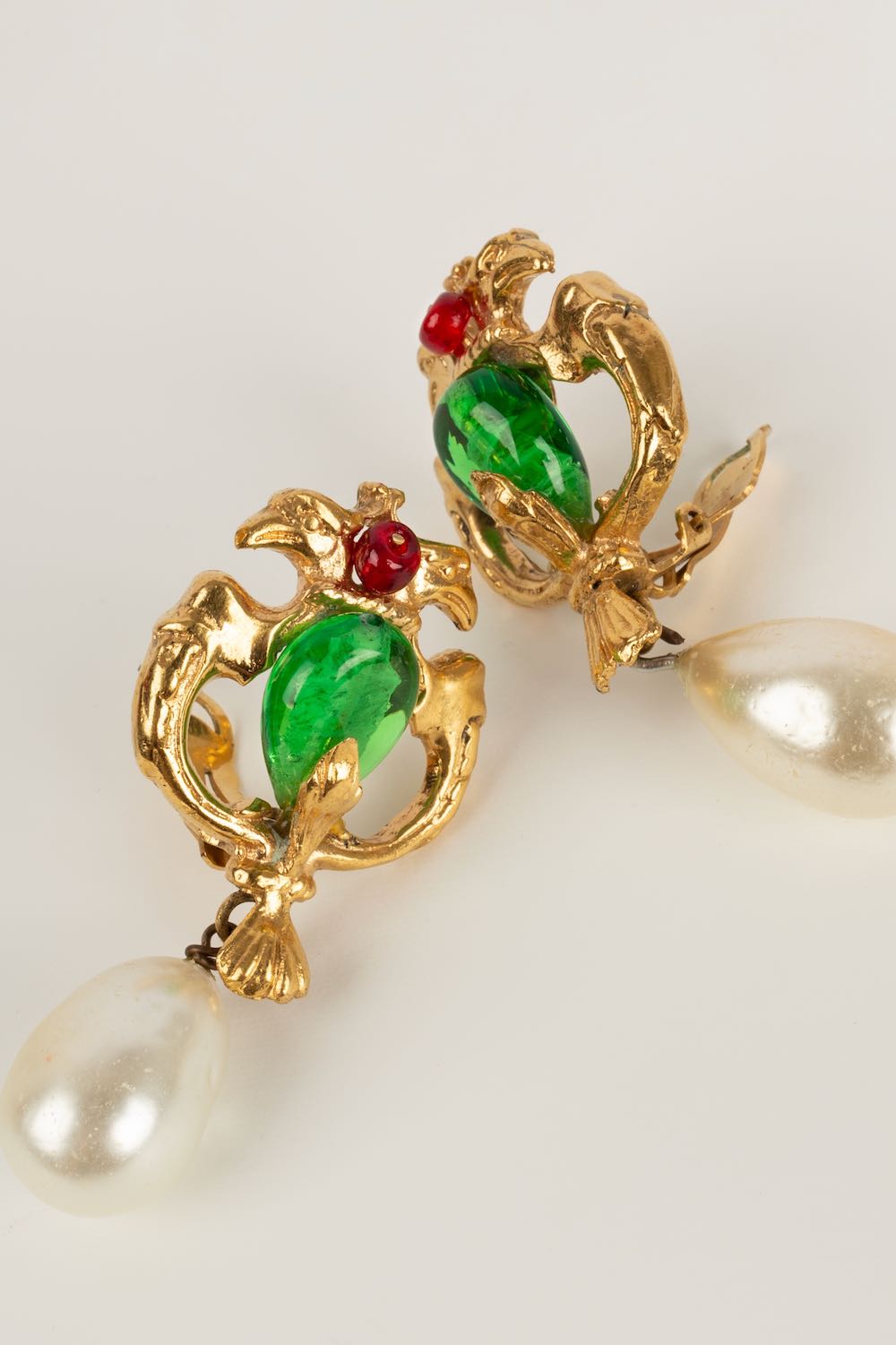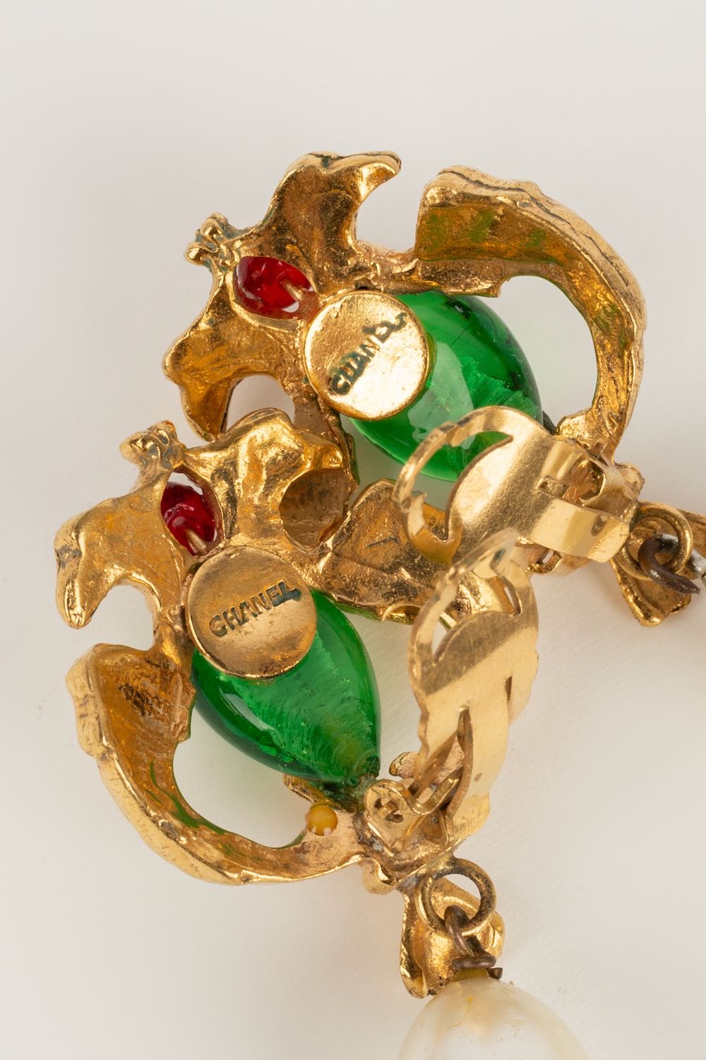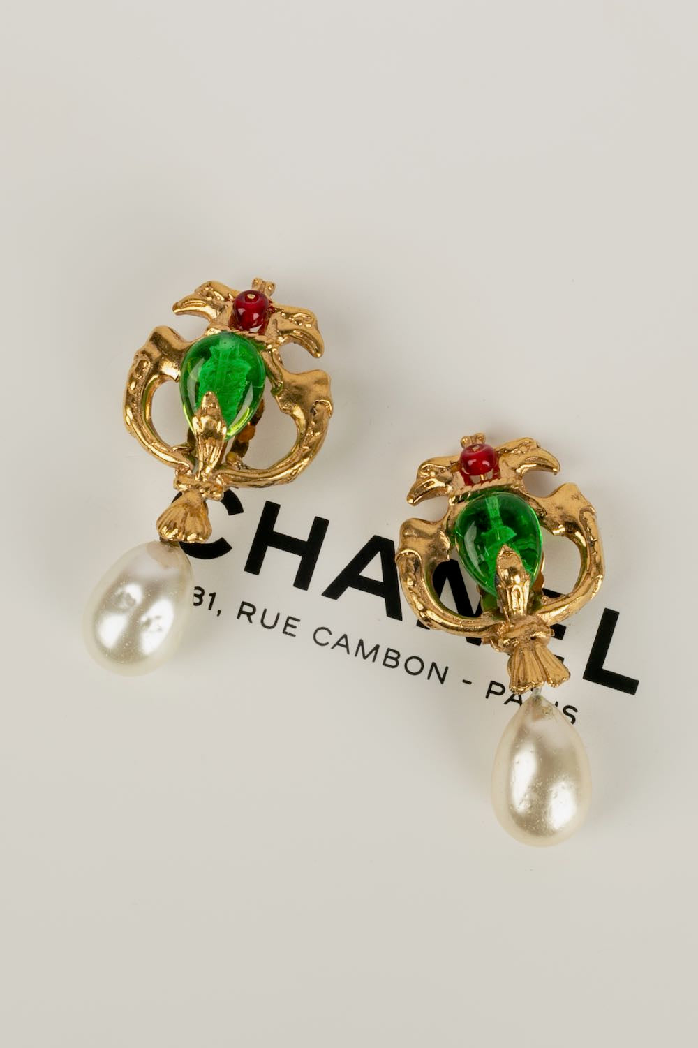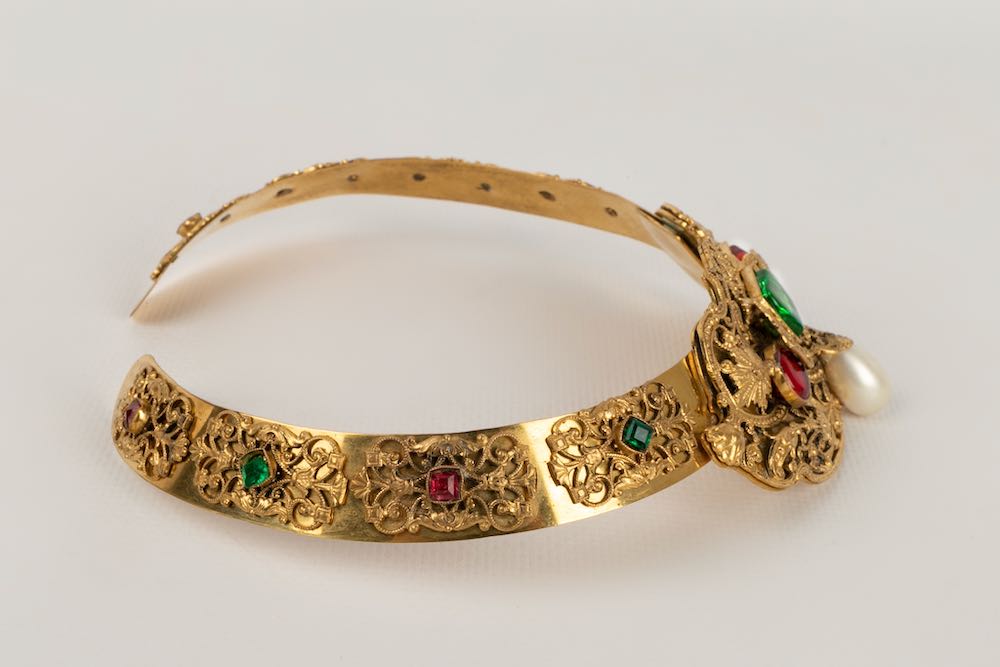 CHANEL -Parure compos� d'un collier court et d'une paire de boucles d'oreilles en m�tal dor�, p�te de verre et goutte de nacre. Travail de l'atelier Robert Goossens. Collection Automne-Hiver 1969-1970.