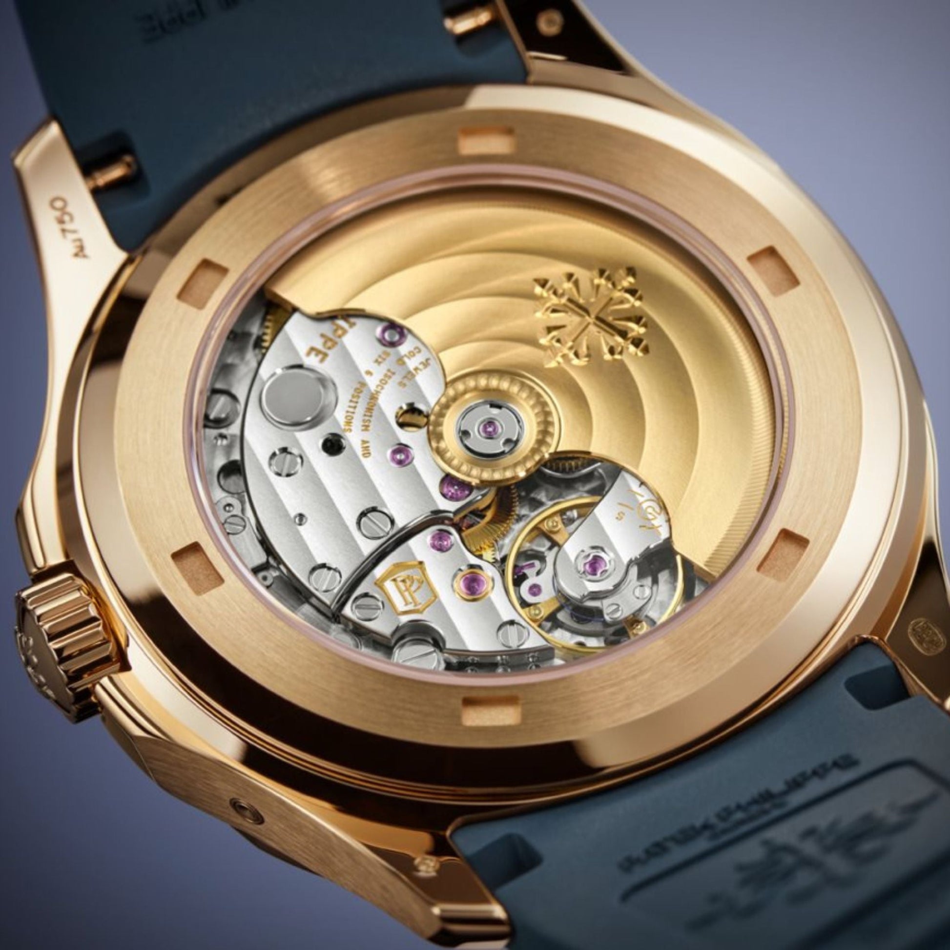 The 39.9 mm case is crafted from 18k rose gold, exuding a warm and luxurious appeal. The blue-gray dial features the Aquanaut's signature embossed pattern, providing a dynamic and textured backdrop for the gold-applied numerals and hands, all coated with luminescent material for enhanced readability. The integrated composite strap in a matching blue-gray hue complements the overall design, ensuring both comfort and style.