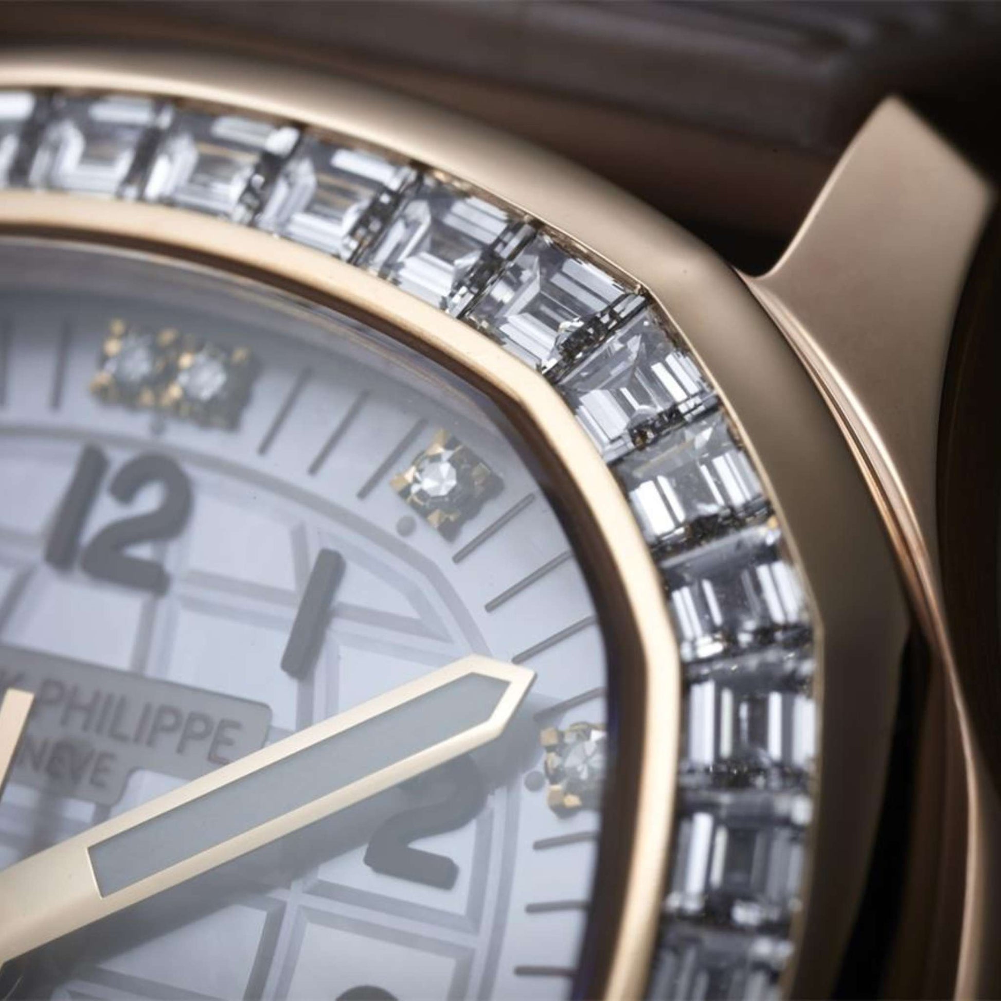 The 35.6 mm rose gold case showcases Patek Philippe's commitment to exceptional design. The engraved mother-of-pearl dial displays a unique checkerboard motif, enhancing its visual appeal. Gold-applied numerals, painted in brown, and diamond hour markers provide a harmonious contrast, ensuring legibility while exuding luxury. The pearly beige polymer strap complements the dial, secured with an Aquanaut fold-over clasp set with 10 baguette diamonds (~0.34 ct), reflecting meticulous attention to detail.