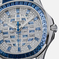 The dial is a true work of art, paved with 20 baguette-cut diamonds and 20 baguette-cut blue sapphires forming a checkerboard pattern that echoes the Aquanaut's signature motif. The chapter ring alternates between baguette-cut blue sapphire hour markers and snow-set brilliant-cut diamonds, enhancing its luxurious appeal. The dark blue composite strap seamlessly integrates with the case, completing the harmonious design.
