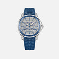 The watch features an 18K white gold case measuring 38.8 mm in diameter and 9.1 mm in thickness, providing a substantial yet comfortable presence on the wrist. The bezel is adorned with 40 baguette-cut blue sapphires, arranged in a gradient from light to dark blue, totaling approximately 3.6 carats. The lugs are set with eight baguette-cut diamonds, adding an additional 0.58 carats of brilliance.