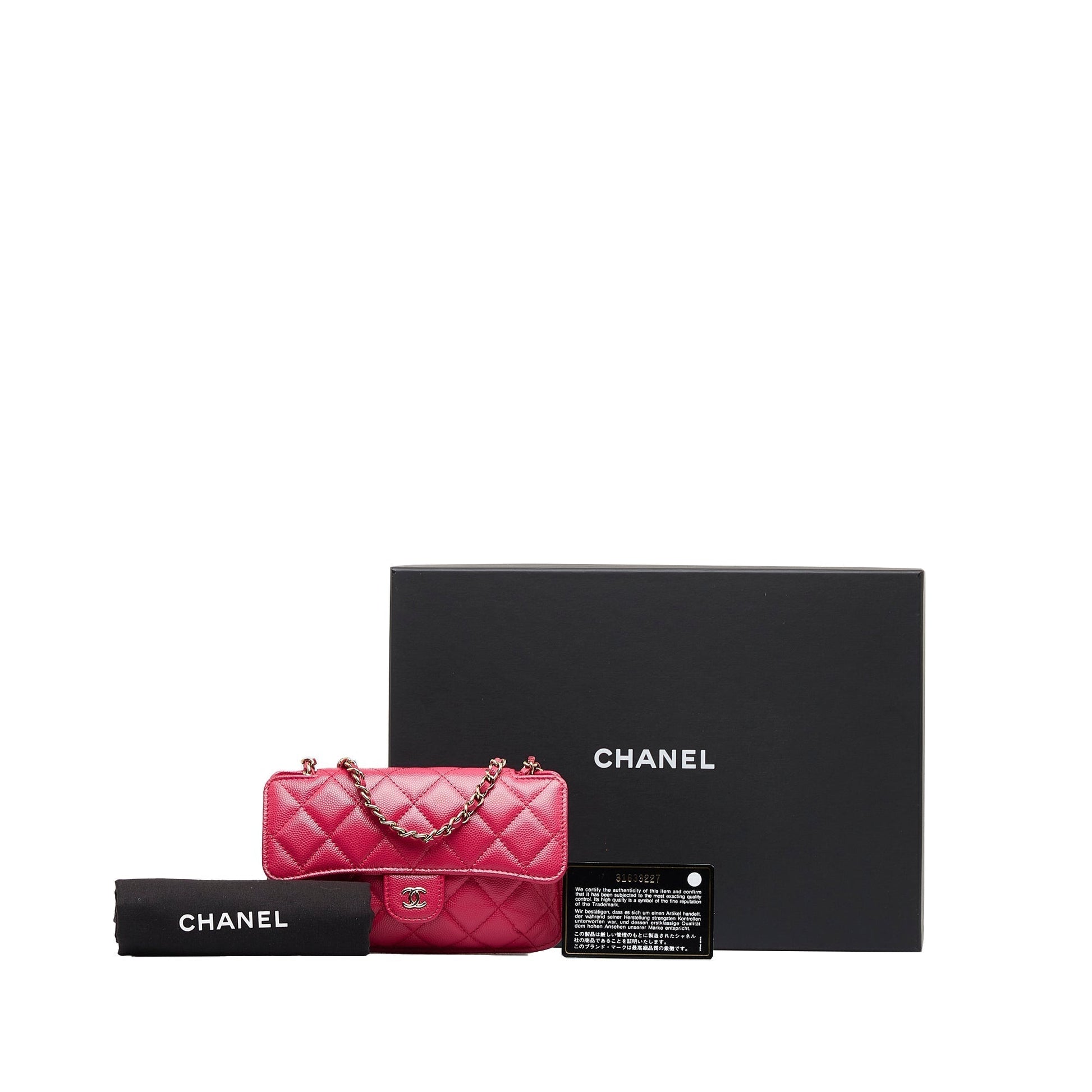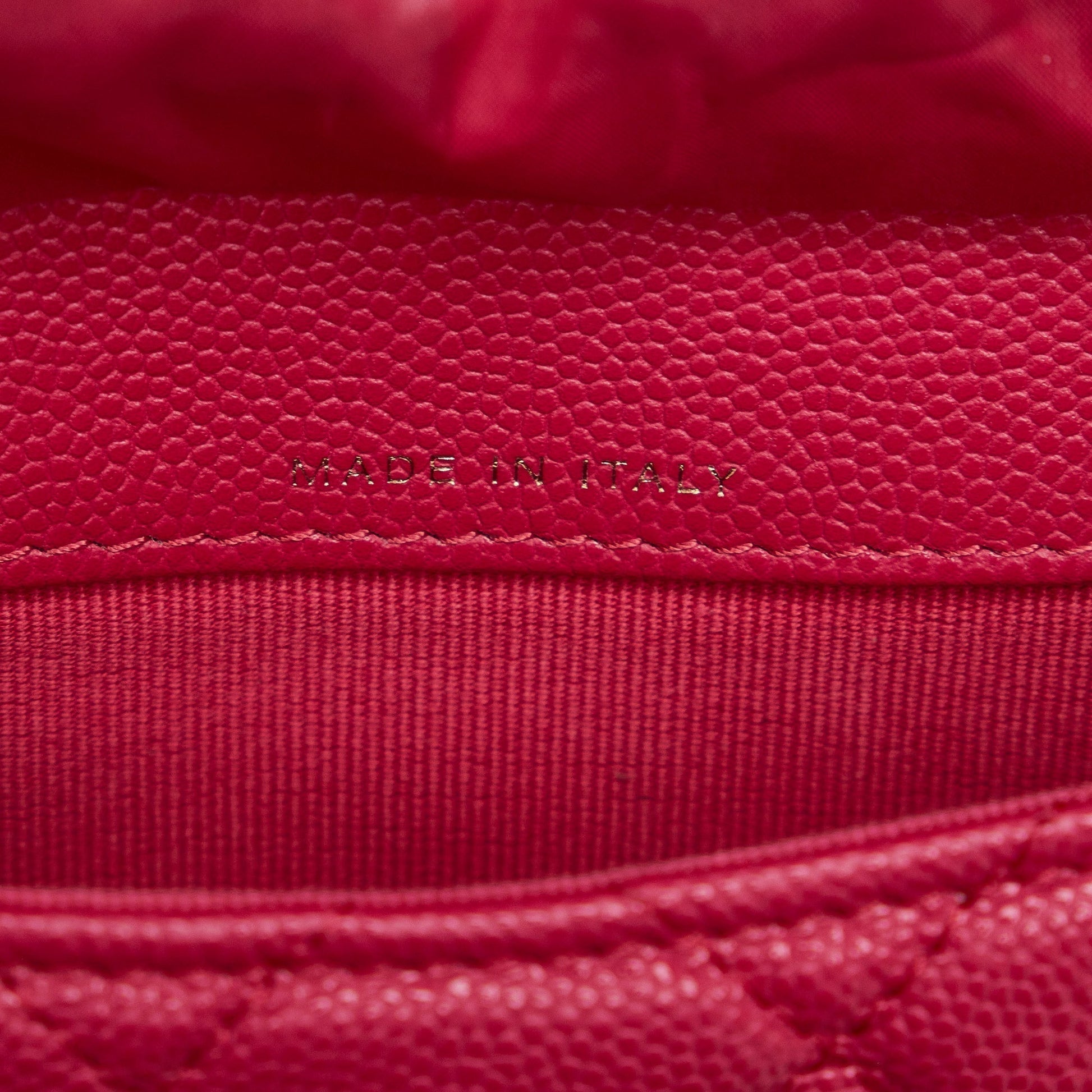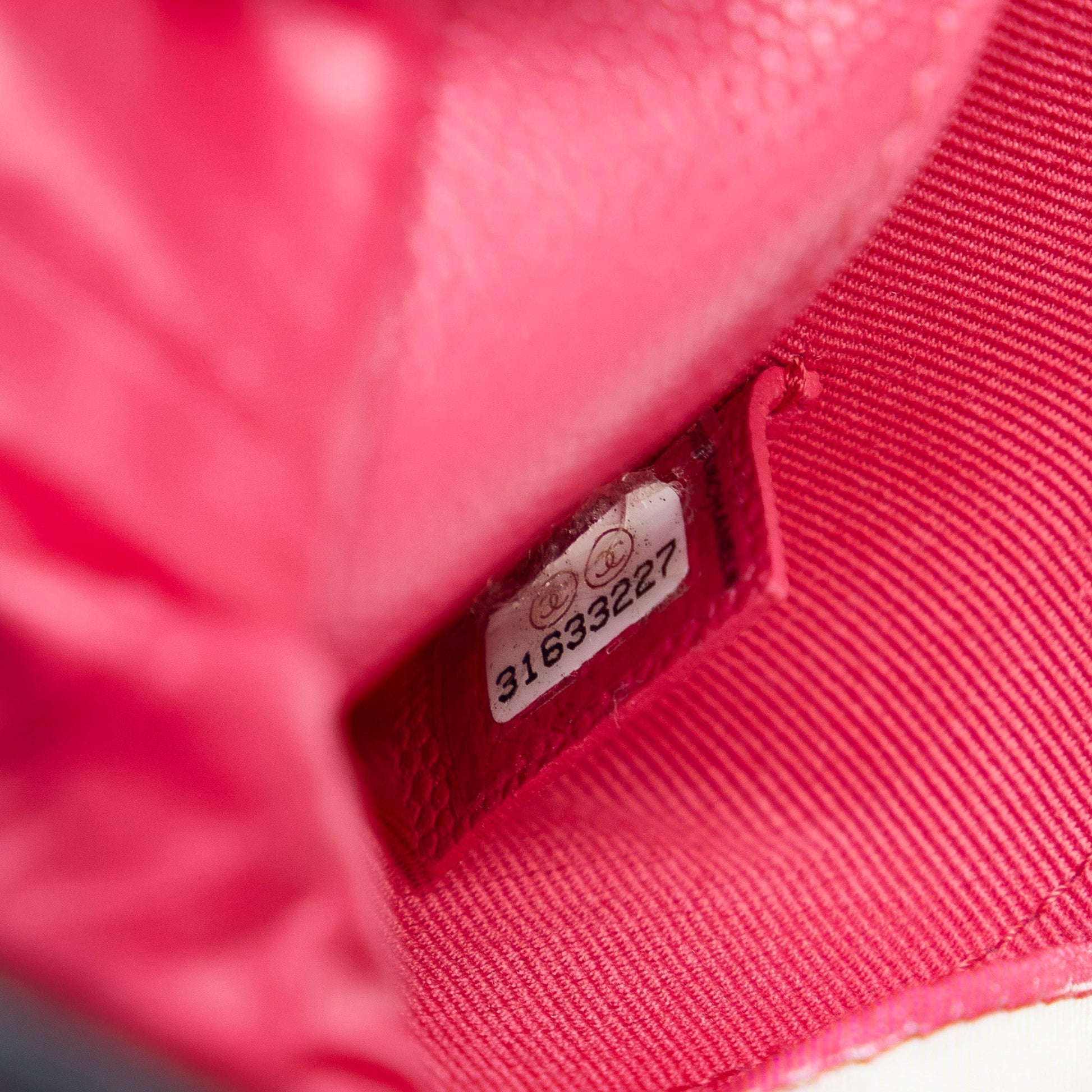 Product Details: Pink Chanel Quilted Caviar Foldable Printed Fabric Tote with Chain. This tote bag features a nylon body that folds into a caviar leather flap bag, flat nylon straps and a woven chain link strap, and an open top with magnetic snap closure. 15" L x 13.8" W x 2" D, 10.2" drop. Serial number 31633227.