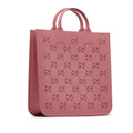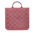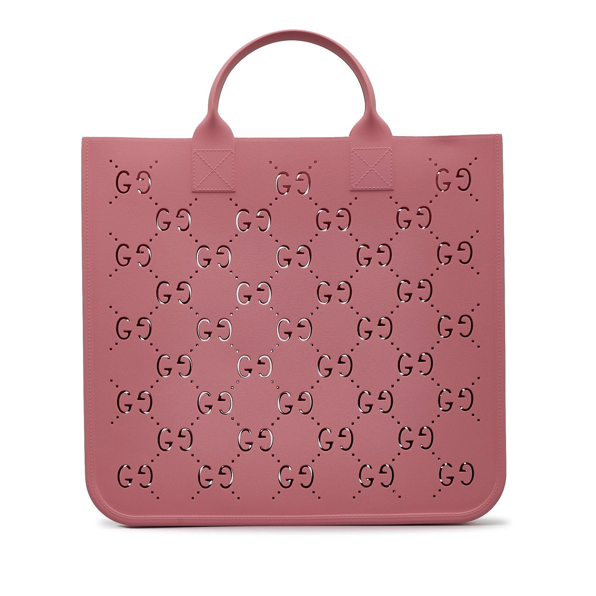 Product Details: Pink Gucci Kids' GG Rubber Tote Bag. This tote bag features a perforated rubber body, rolled handles, and an open top. 12" L x 13" W x 3.1" D, 3.1" drop. Serial number 679365.