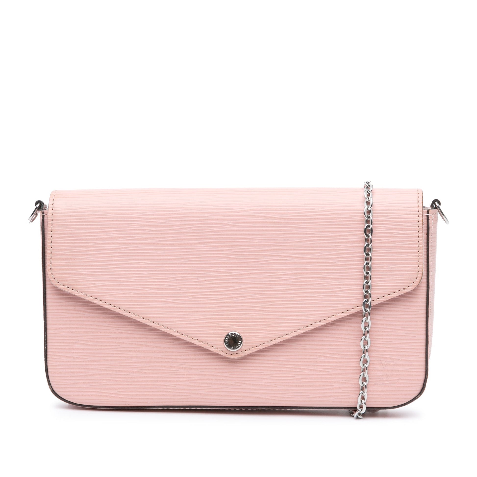 Product Details: Pink Louis Vuitton Epi Pochette Felicie Crossbody Bag. The Pochette Felicie features an epi leather body, a detachable chain strap, a flap with snap button closure, a zip pouch, and interior slip pockets. 4.7" L x 8.3" W x 1.2" D. Serial number TJ2197.