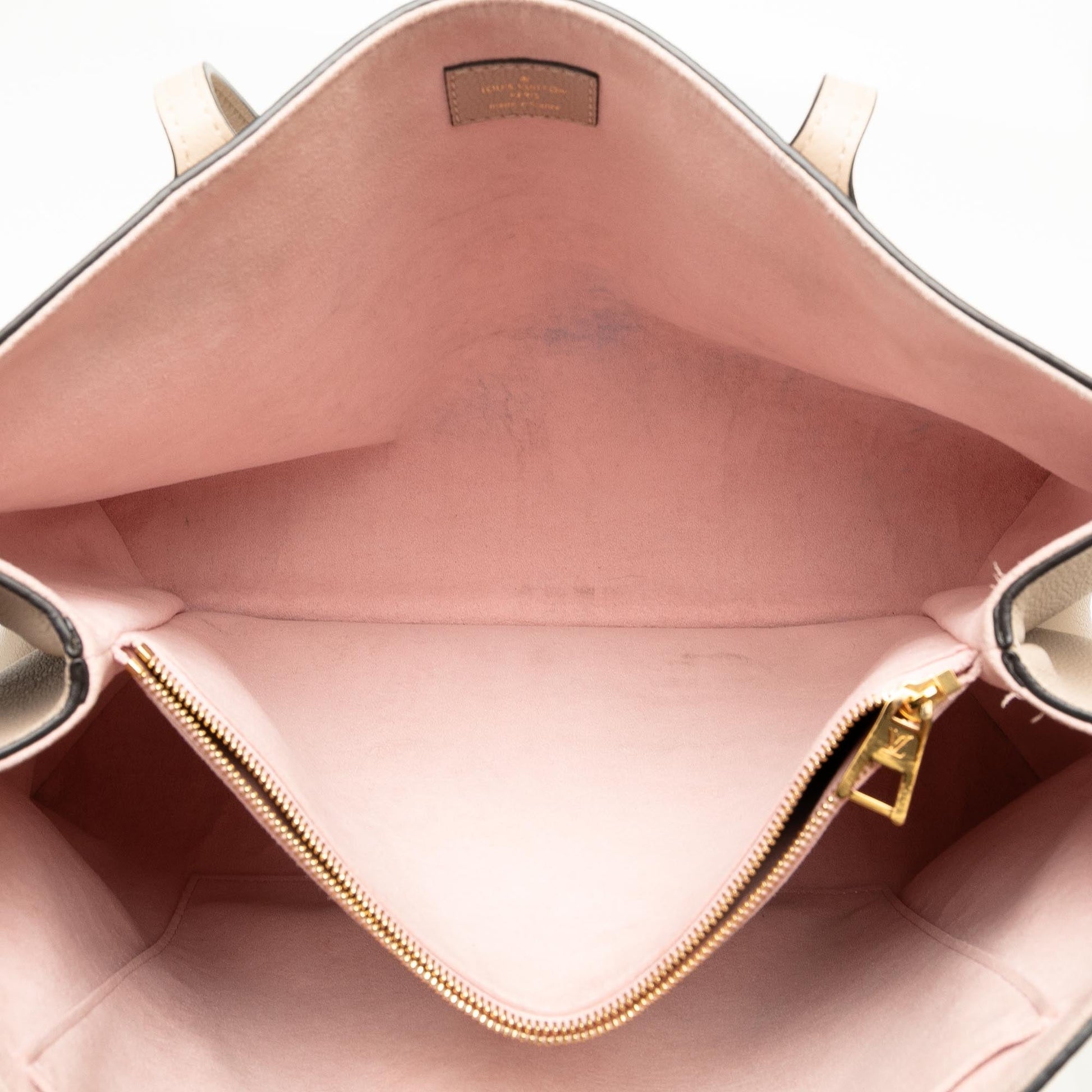 Product Details: Pink Louis Vuitton Lockme Shopper Tote Bag. The Lockme Shopper tote bag features a leather body, flat leather straps, a twist lock closure, and interior zip and slip pockets. 10.2" L x 15.6" W x 5.5" D, 9.3" drop.