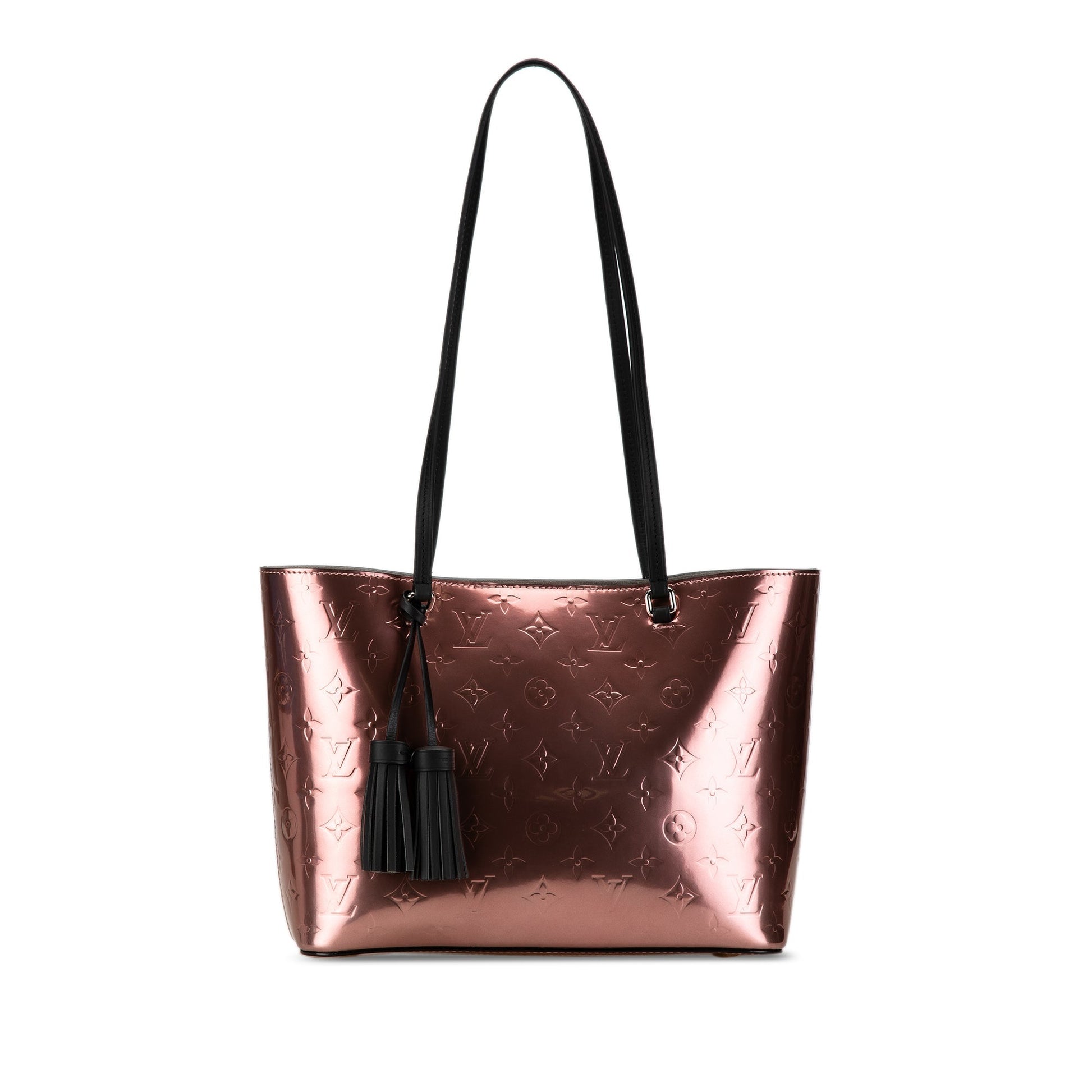 Product Details: Pink Louis Vuitton Monogram Vernis Long Beach PM Tote Bag. The Long Beach PM features a vernis leather body with tassel details, flat leather shoulder straps, and an open top with magnetic snap closure. 8.9" L x 11.2" W x 4.5" D, 11.2" drop. Serial number PL4107.