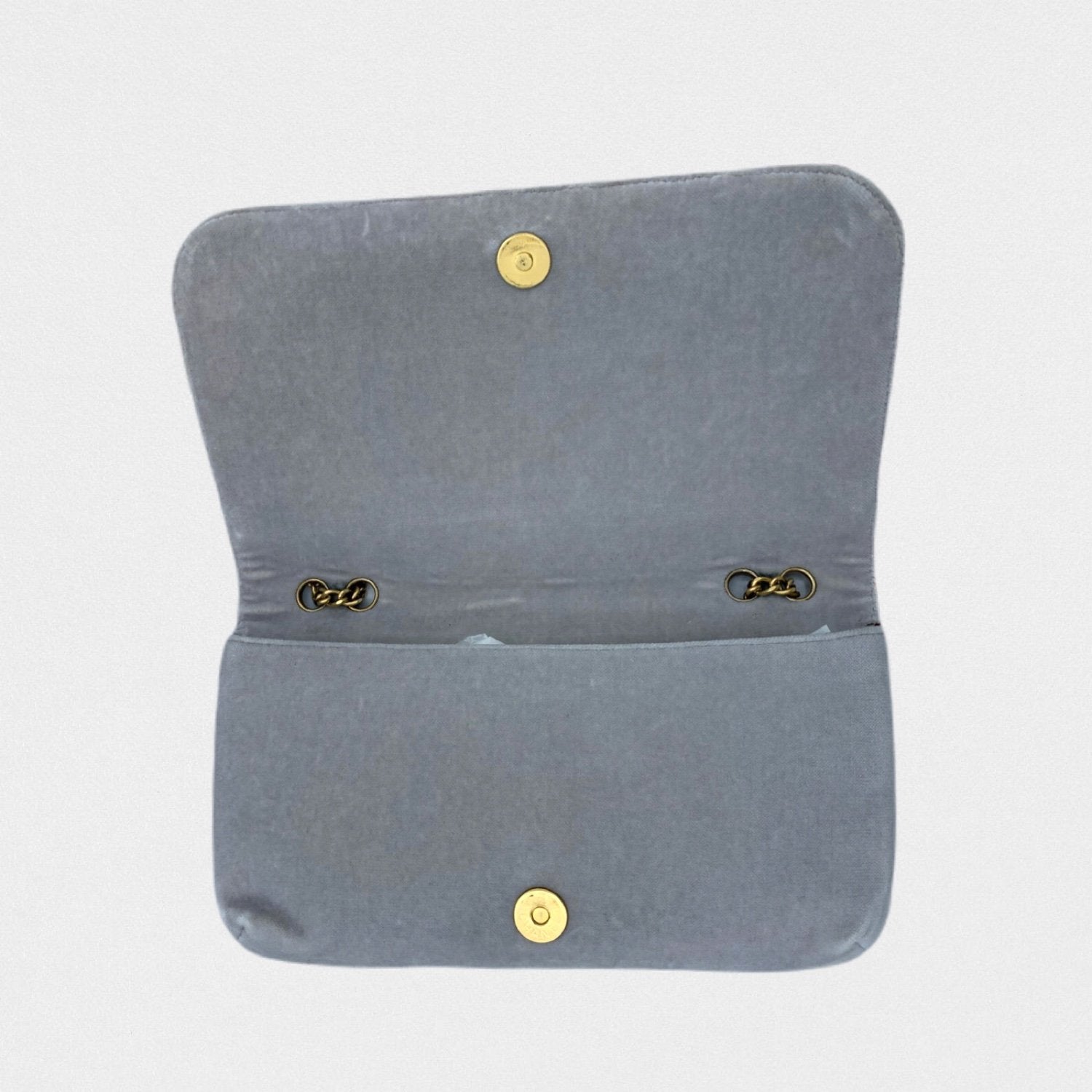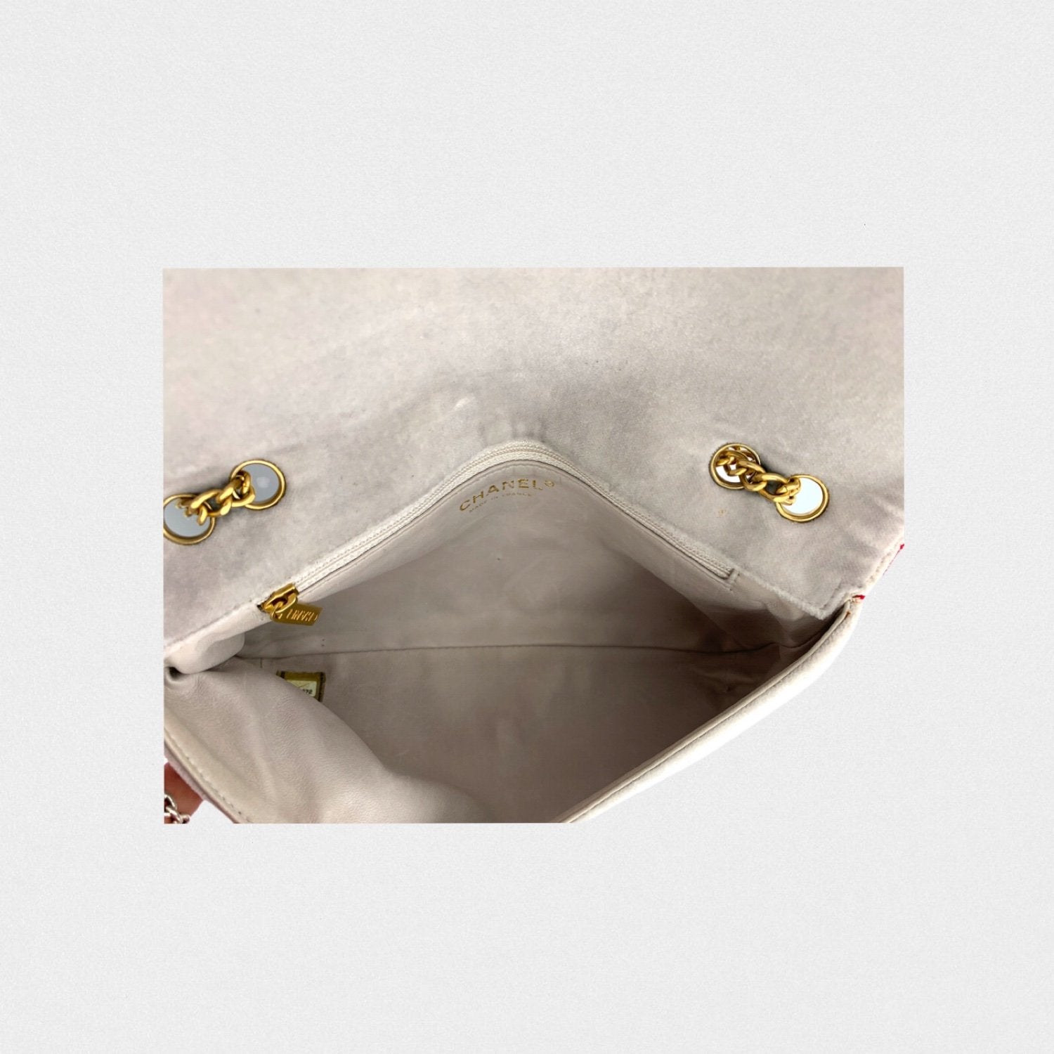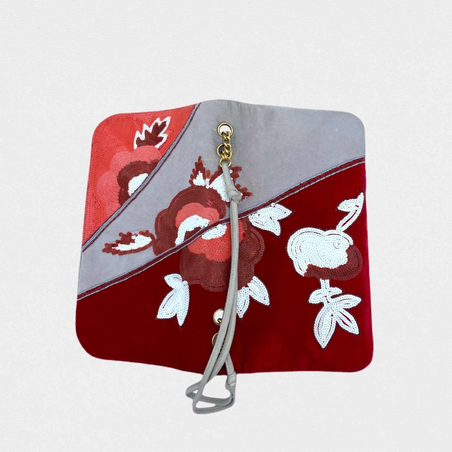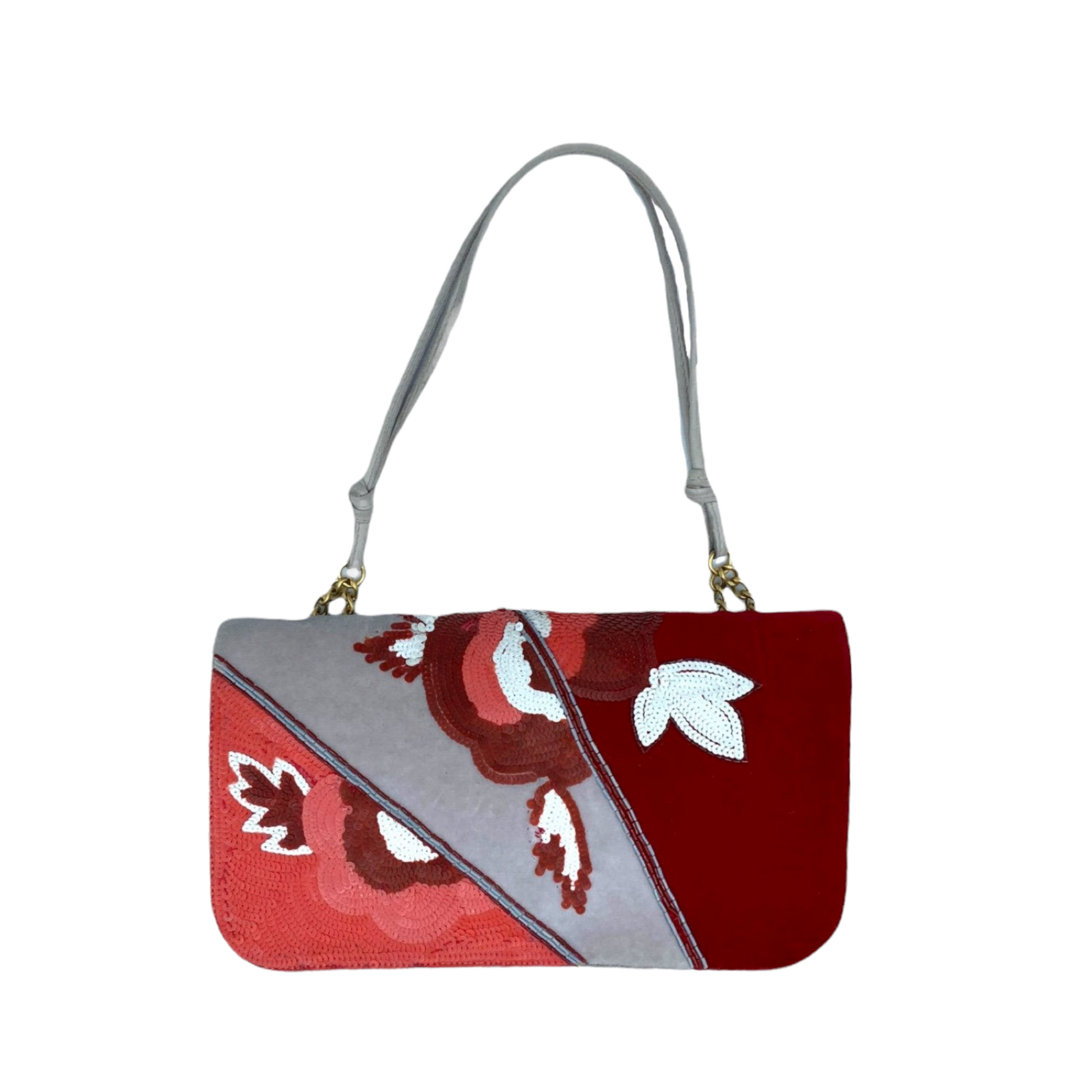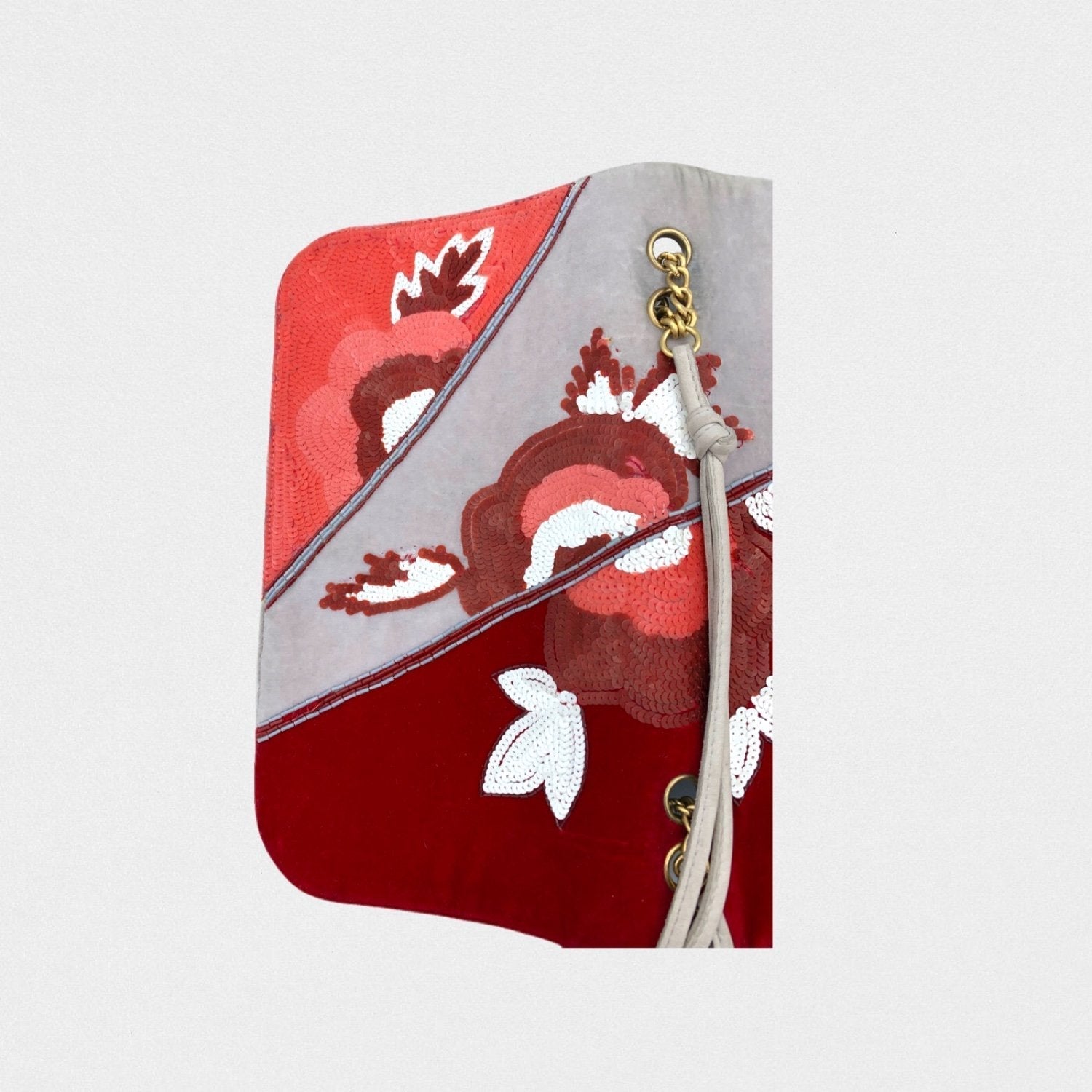 � DESCRIPTION: Chanel vintage bag -�Flowers embroidered in white and red sequins on red and gray velvet - Closing by flap with golden pressure