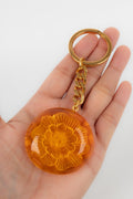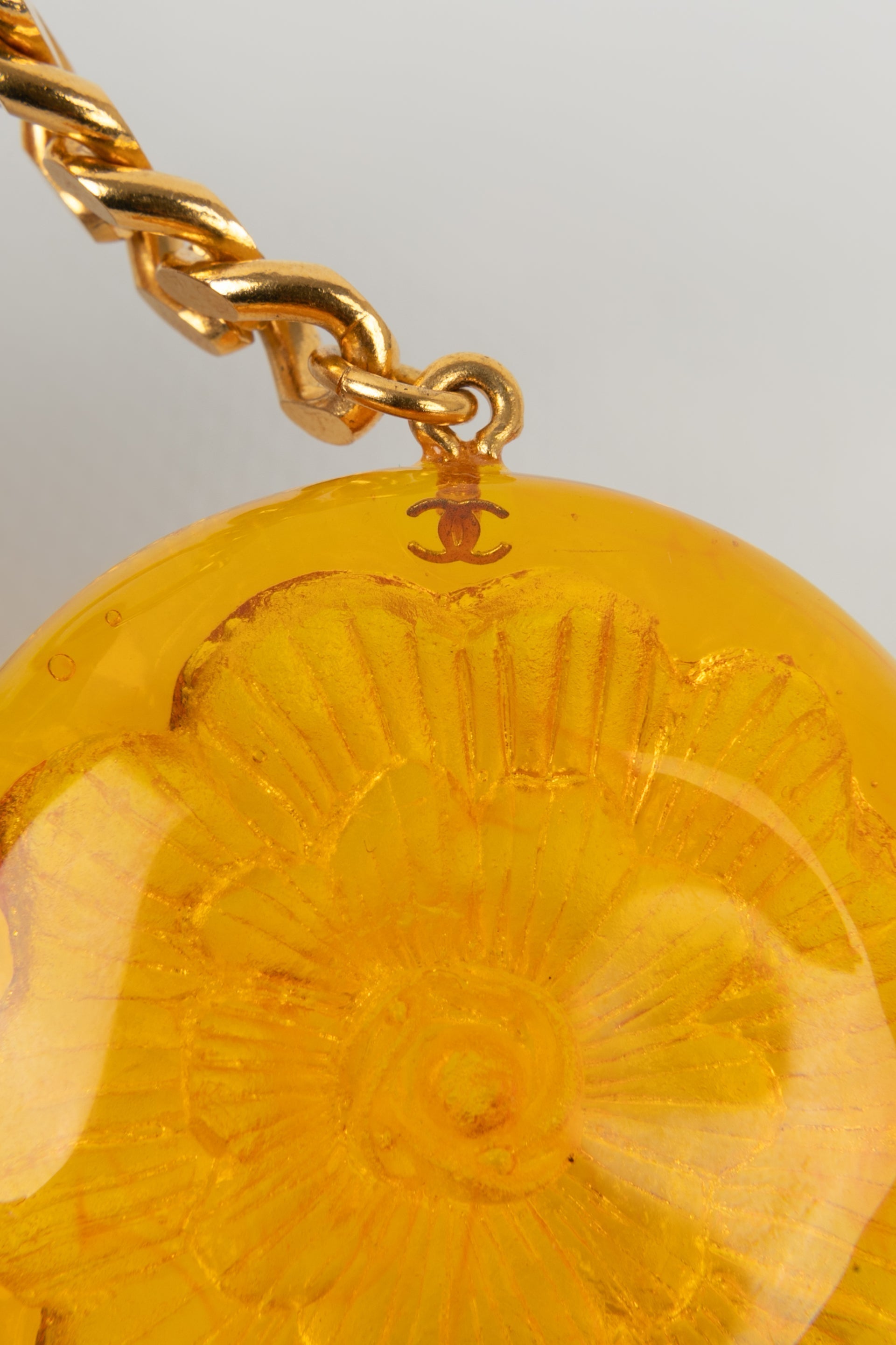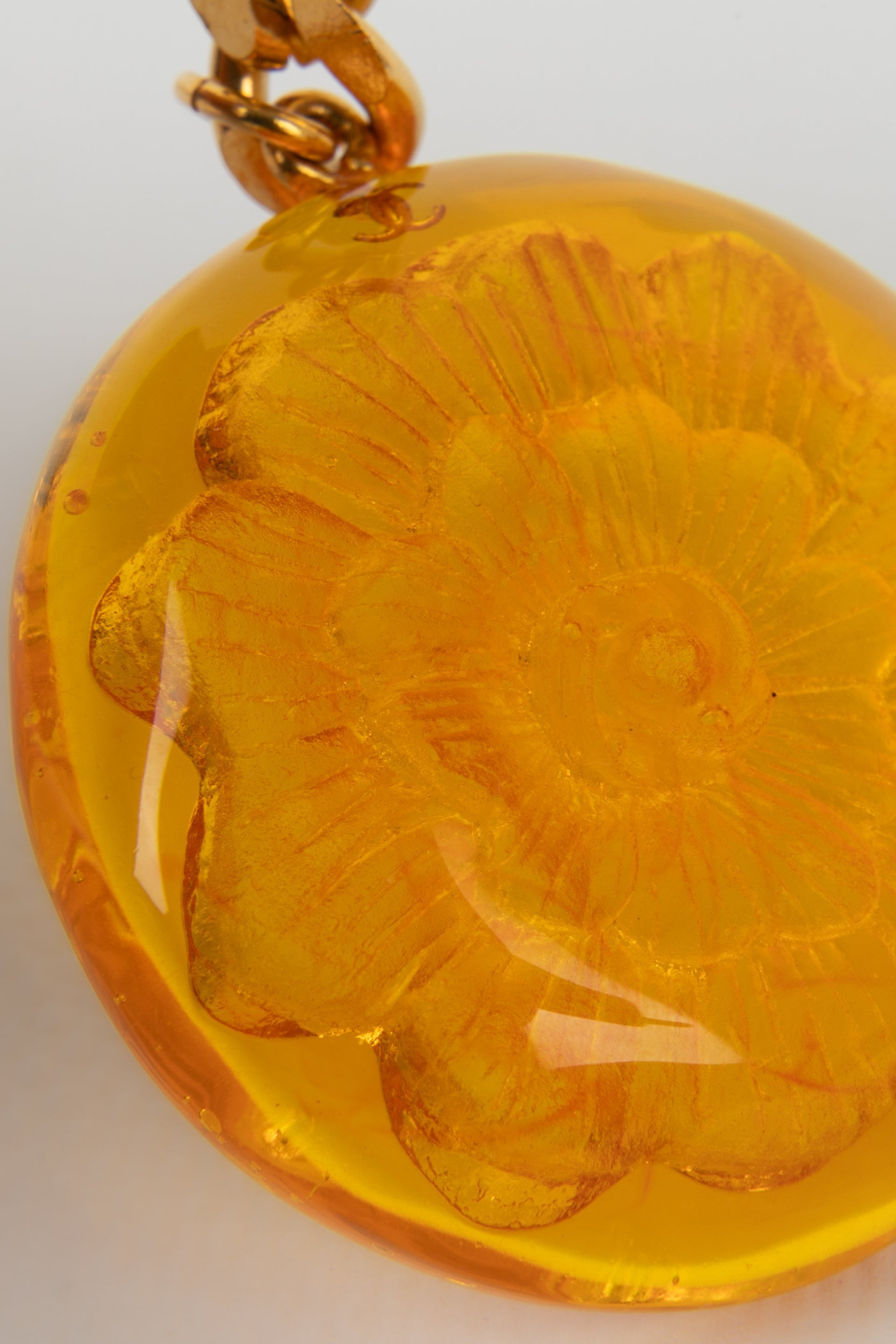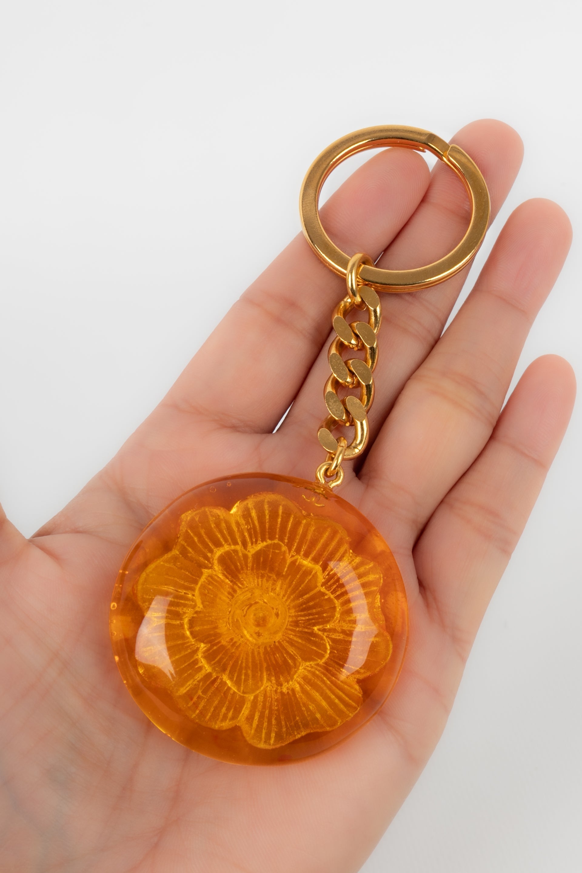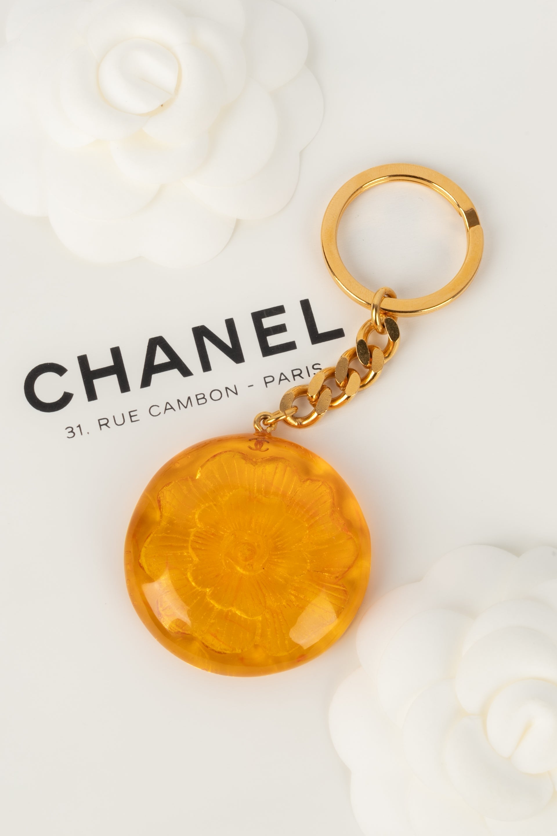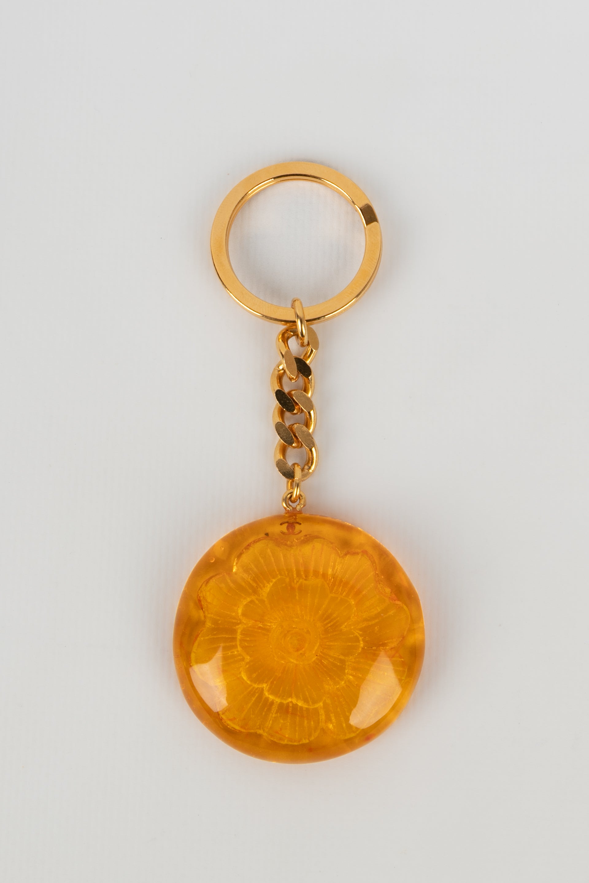 CHANEL - Porte-clés en métal doré et bakélite orange figurant un camélia.
