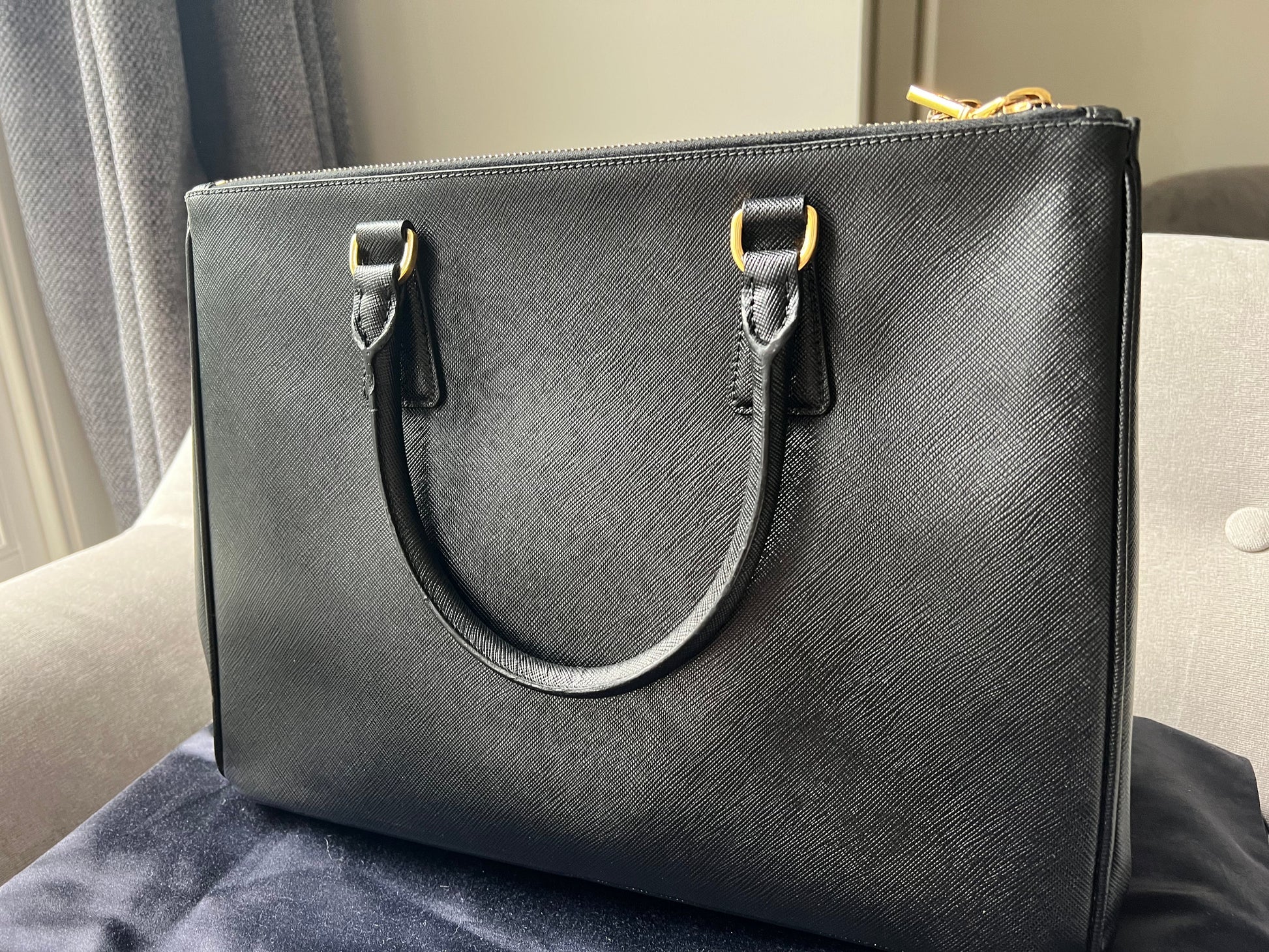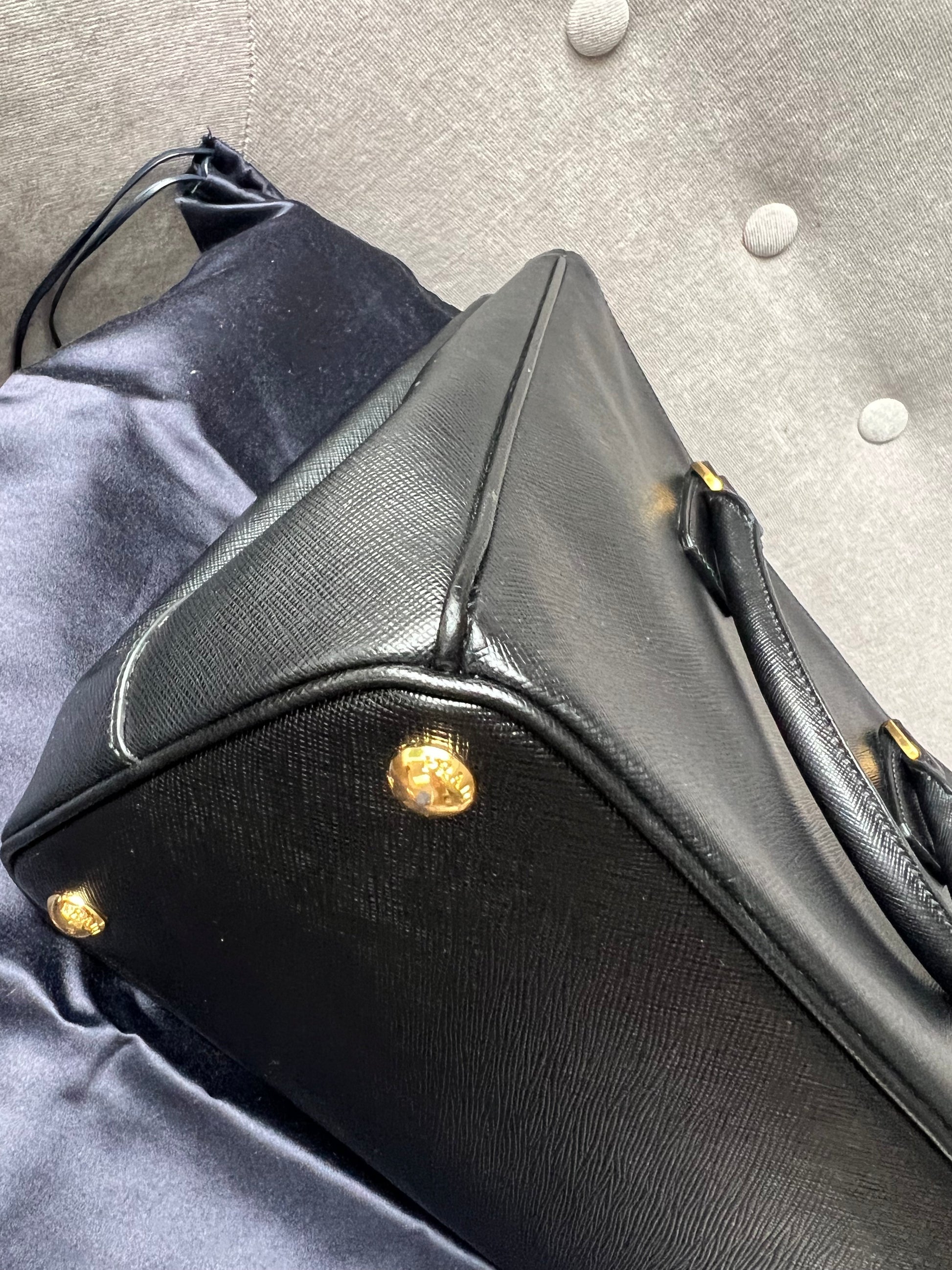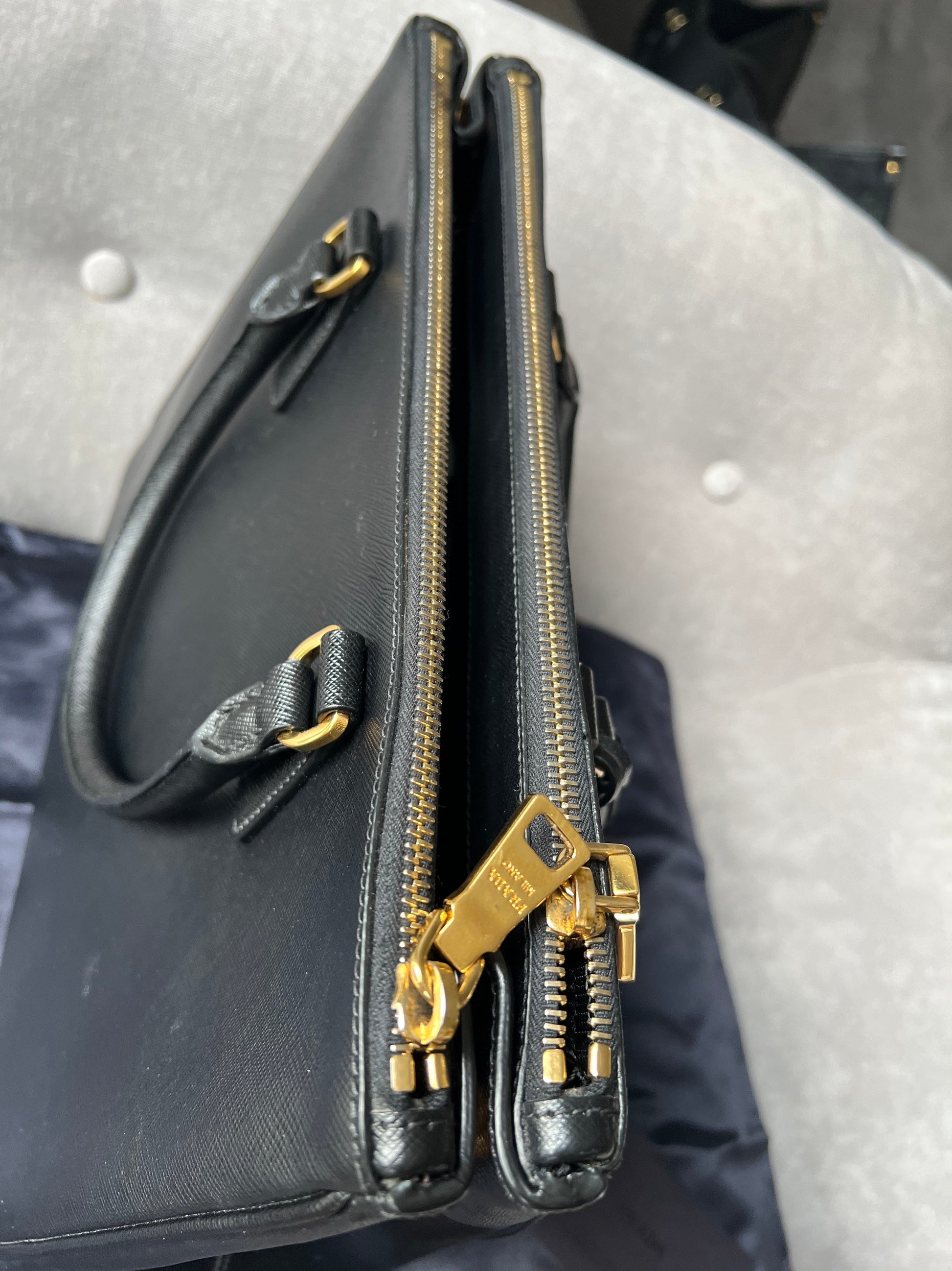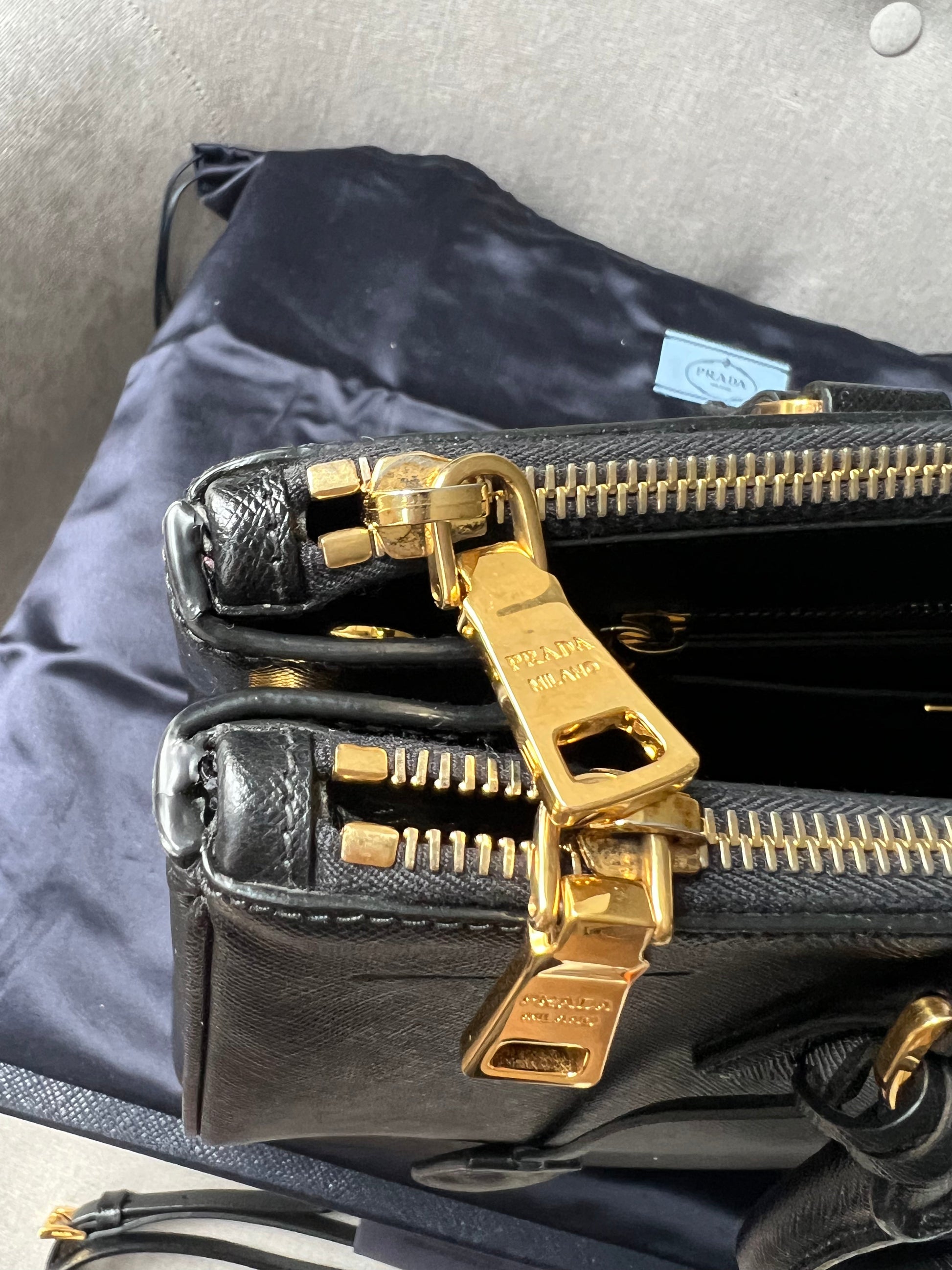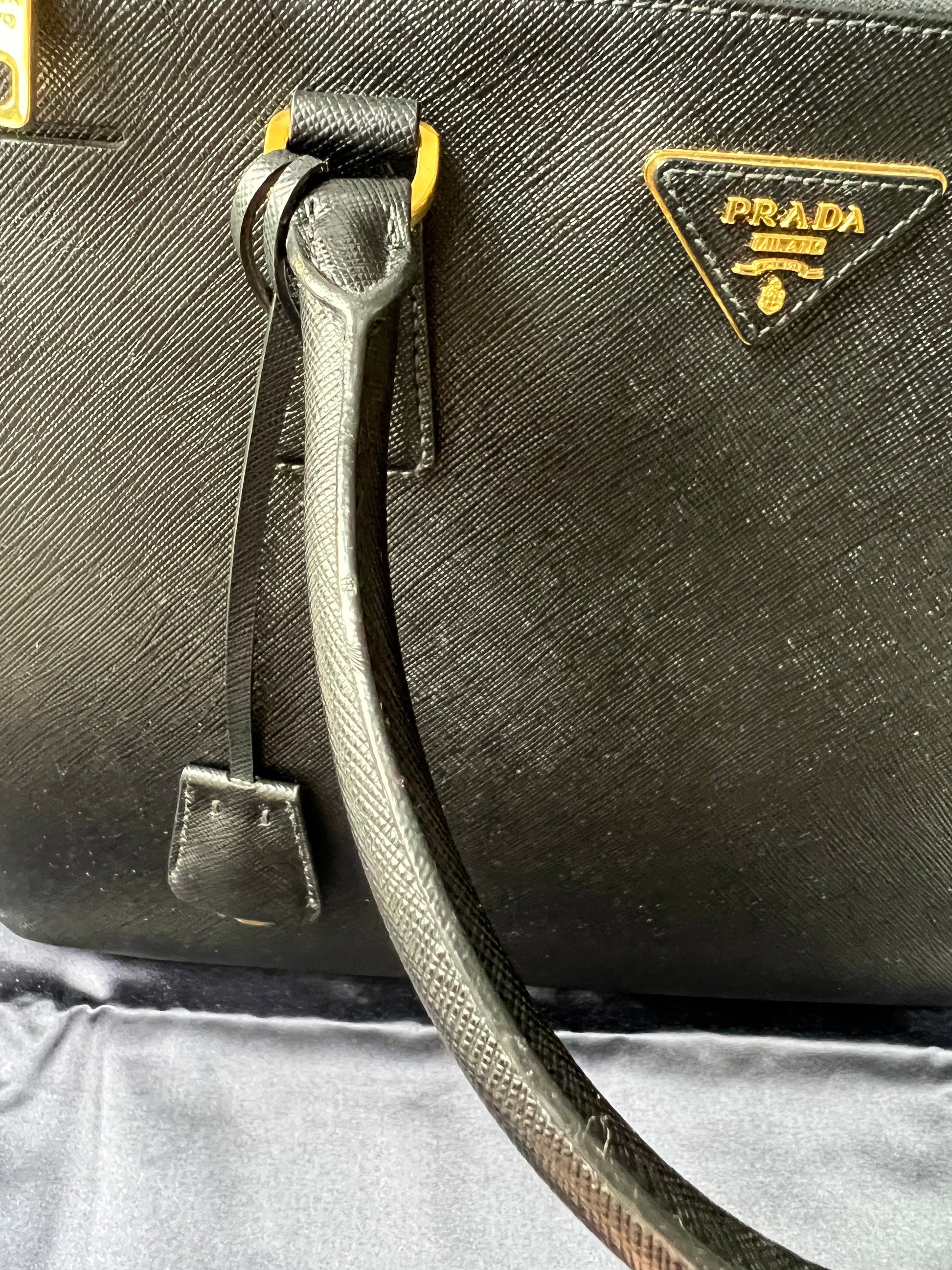 Prada Galleria Tote in Black Saffiano with gold hardware. This iconic Saffiano Tote is a simple, practical and easy to use bag that's been a Prada staple for years. The clean and elegant aesthetic makes it Ideal for formal use or work with its three interior sections (two zipper sections), it is popper gusset sides to expand capacity. Crafted from a firm, robust leather means this bag is ideal for day to day or work use. Can be carried in hand or the crook of the arm using the top handles or over shoulder/cross body using the long detachable strap. approx 2013 year.