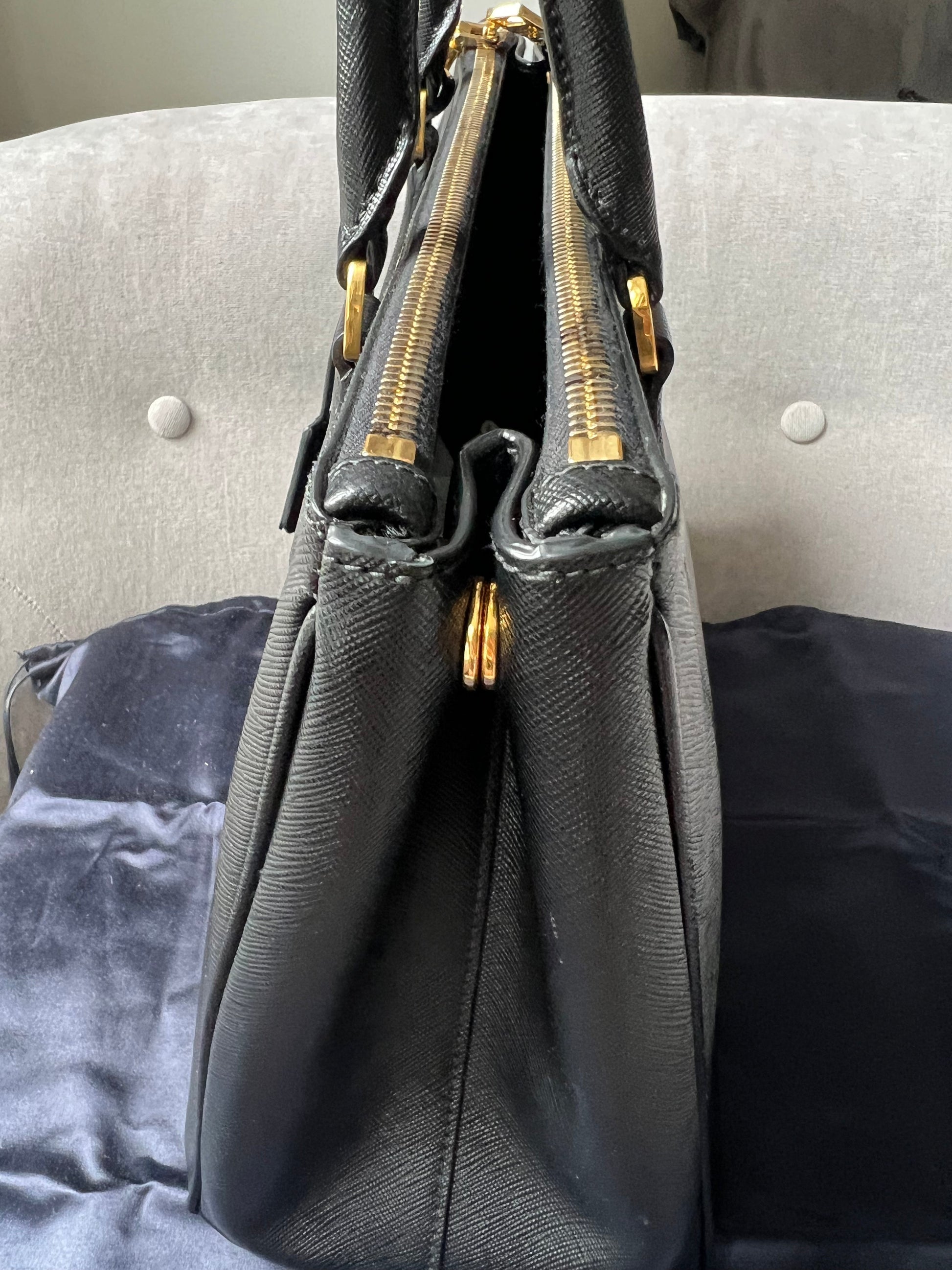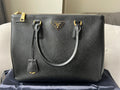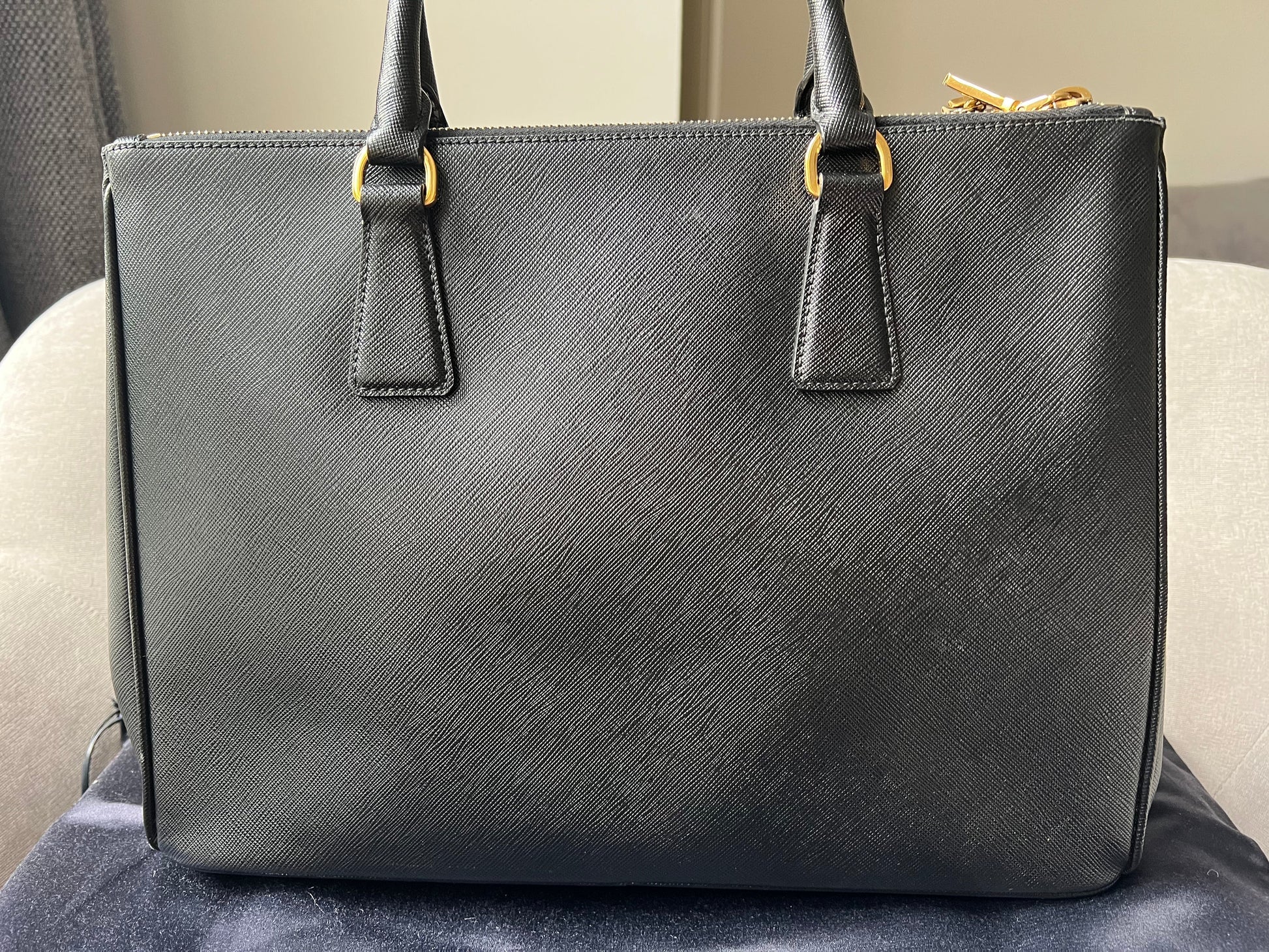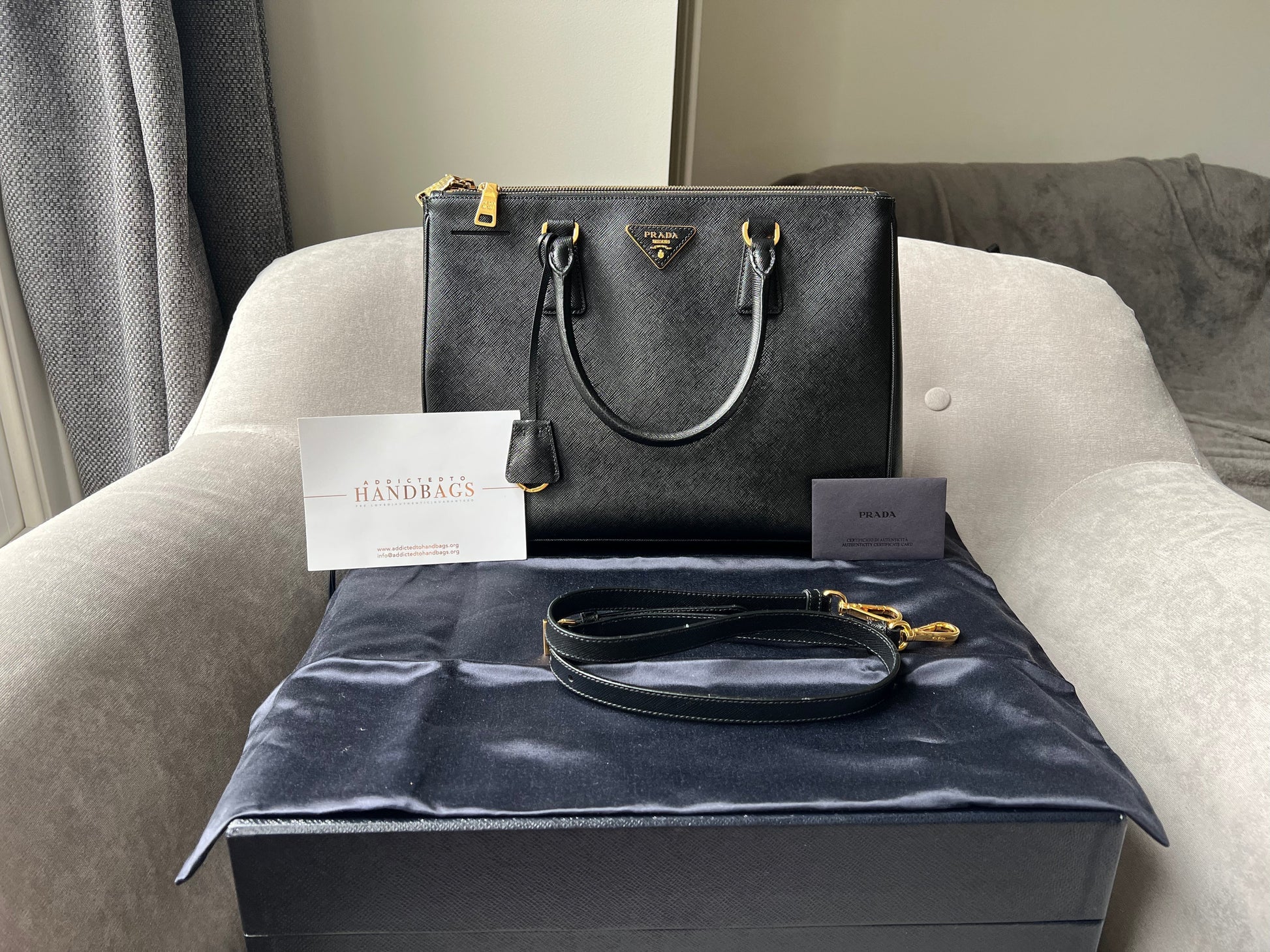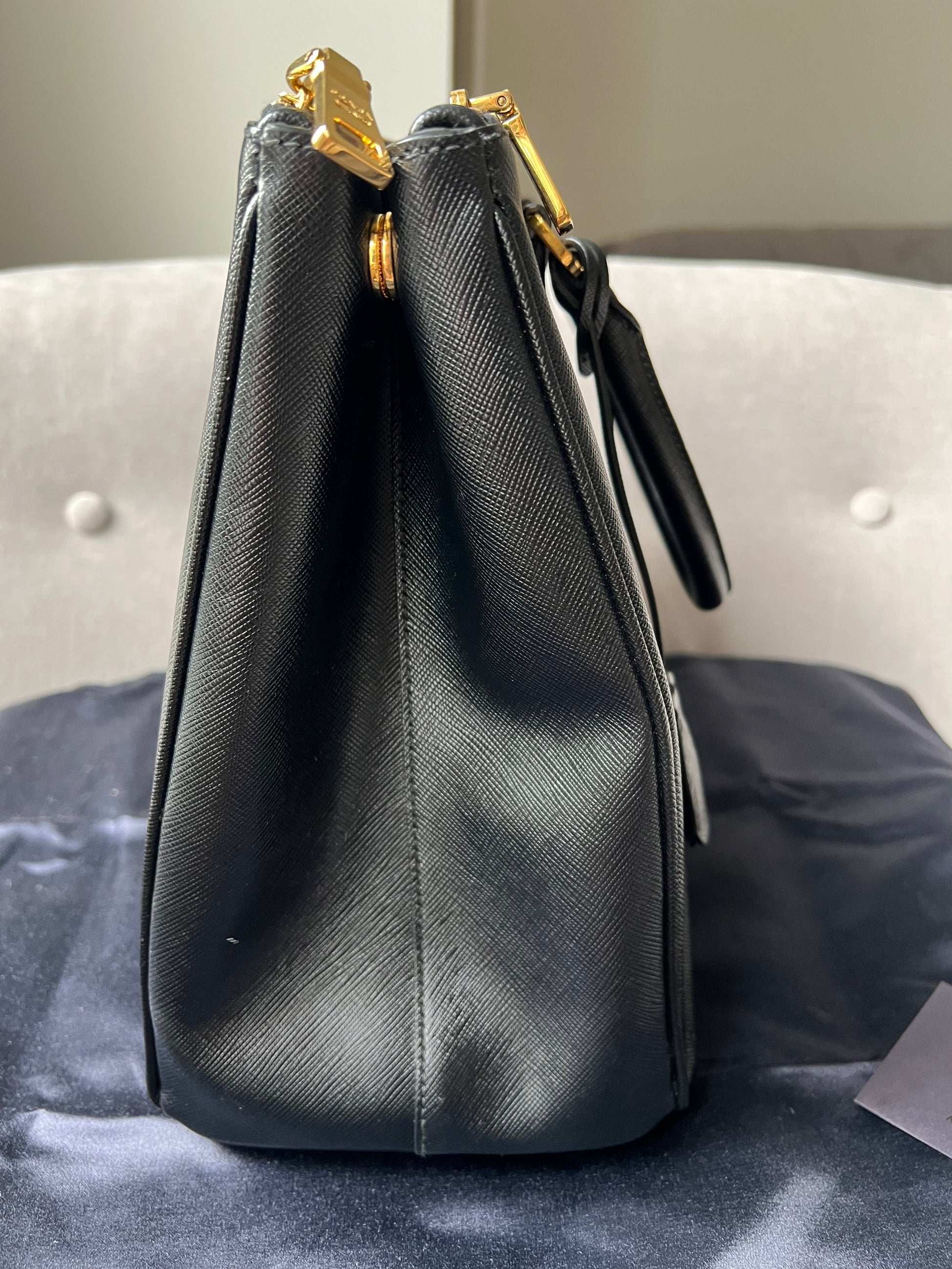 Prada Galleria Tote in Black Saffiano with gold hardware. This iconic Saffiano Tote is a simple, practical and easy to use bag that's been a Prada staple for years. The clean and elegant aesthetic makes it Ideal for formal use or work with its three interior sections (two zipper sections), it is popper gusset sides to expand capacity. Crafted from a firm, robust leather means this bag is ideal for day to day or work use. Can be carried in hand or the crook of the arm using the top handles or over shoulder/cross body using the long detachable strap. approx 2013 year.
