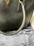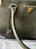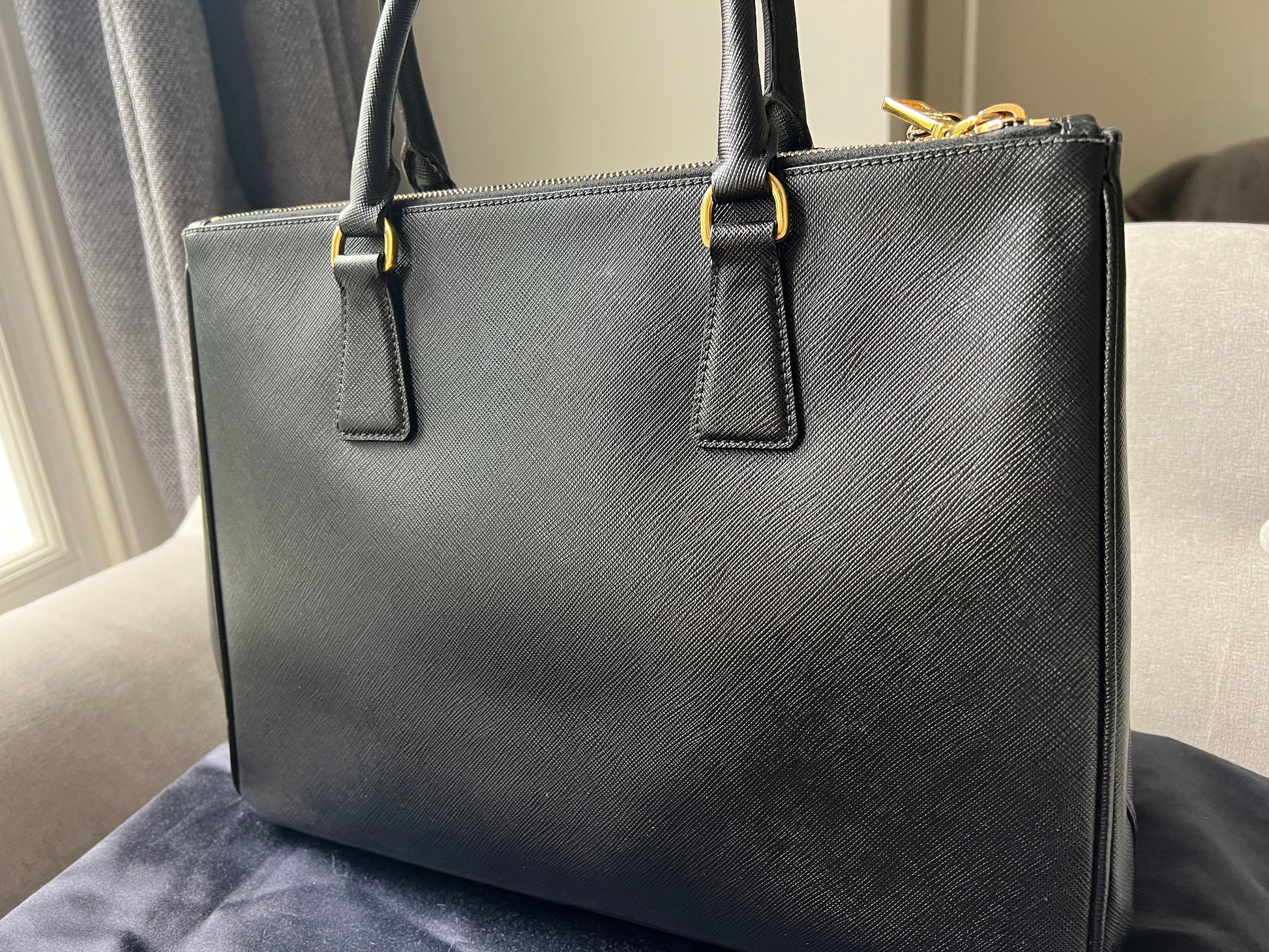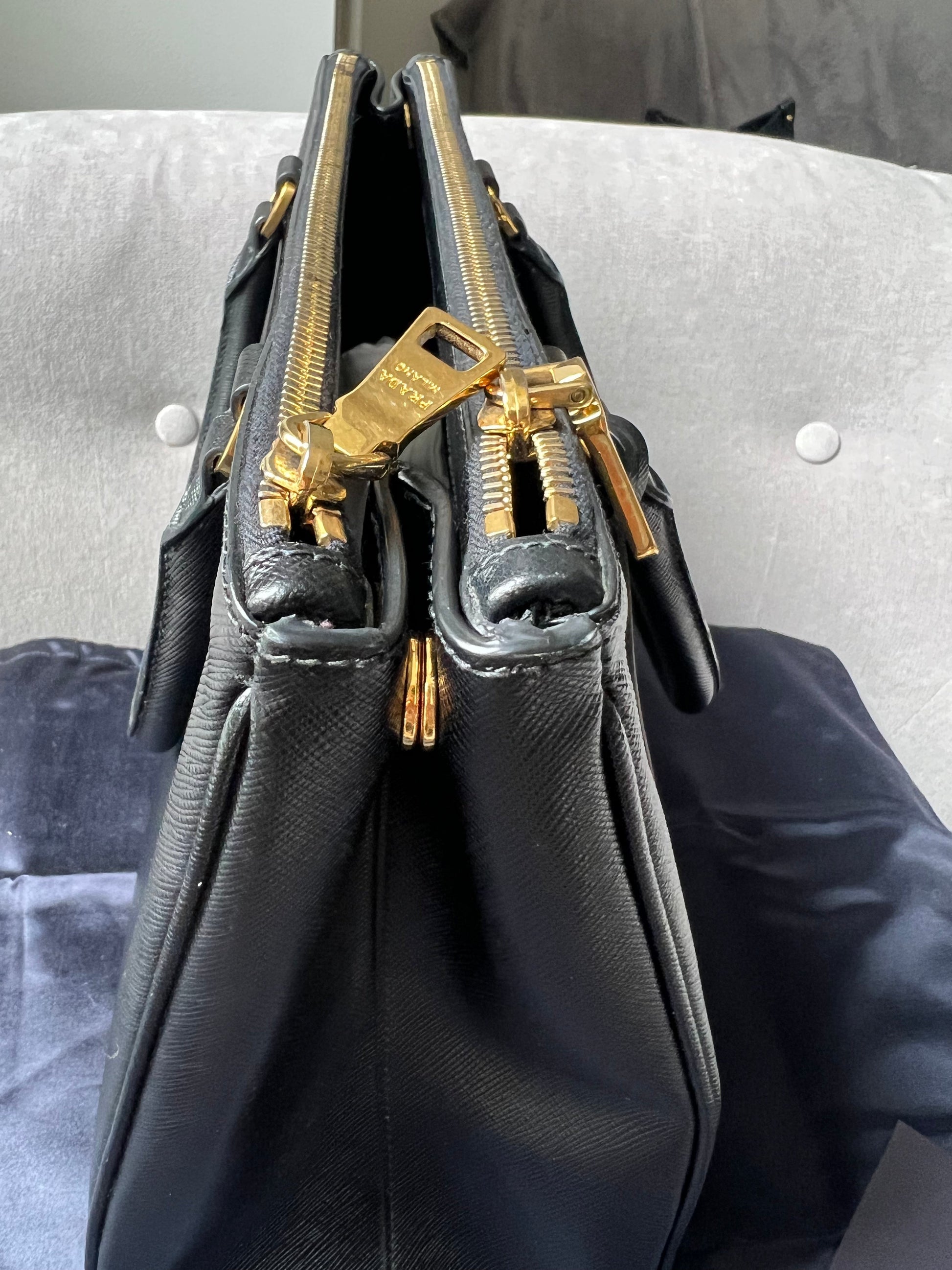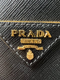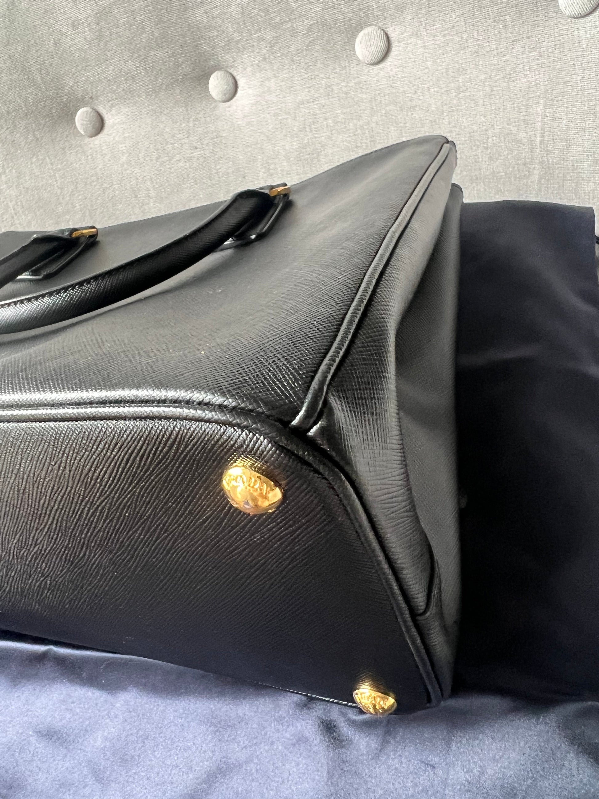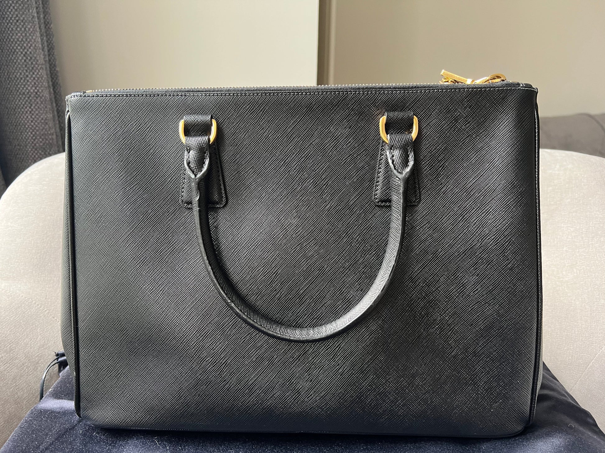 Prada Galleria Tote in Black Saffiano with gold hardware. This iconic Saffiano Tote is a simple, practical and easy to use bag that's been a Prada staple for years. The clean and elegant aesthetic makes it Ideal for formal use or work with its three interior sections (two zipper sections), it is popper gusset sides to expand capacity. Crafted from a firm, robust leather means this bag is ideal for day to day or work use. Can be carried in hand or the crook of the arm using the top handles or over shoulder/cross body using the long detachable strap. approx 2013 year.