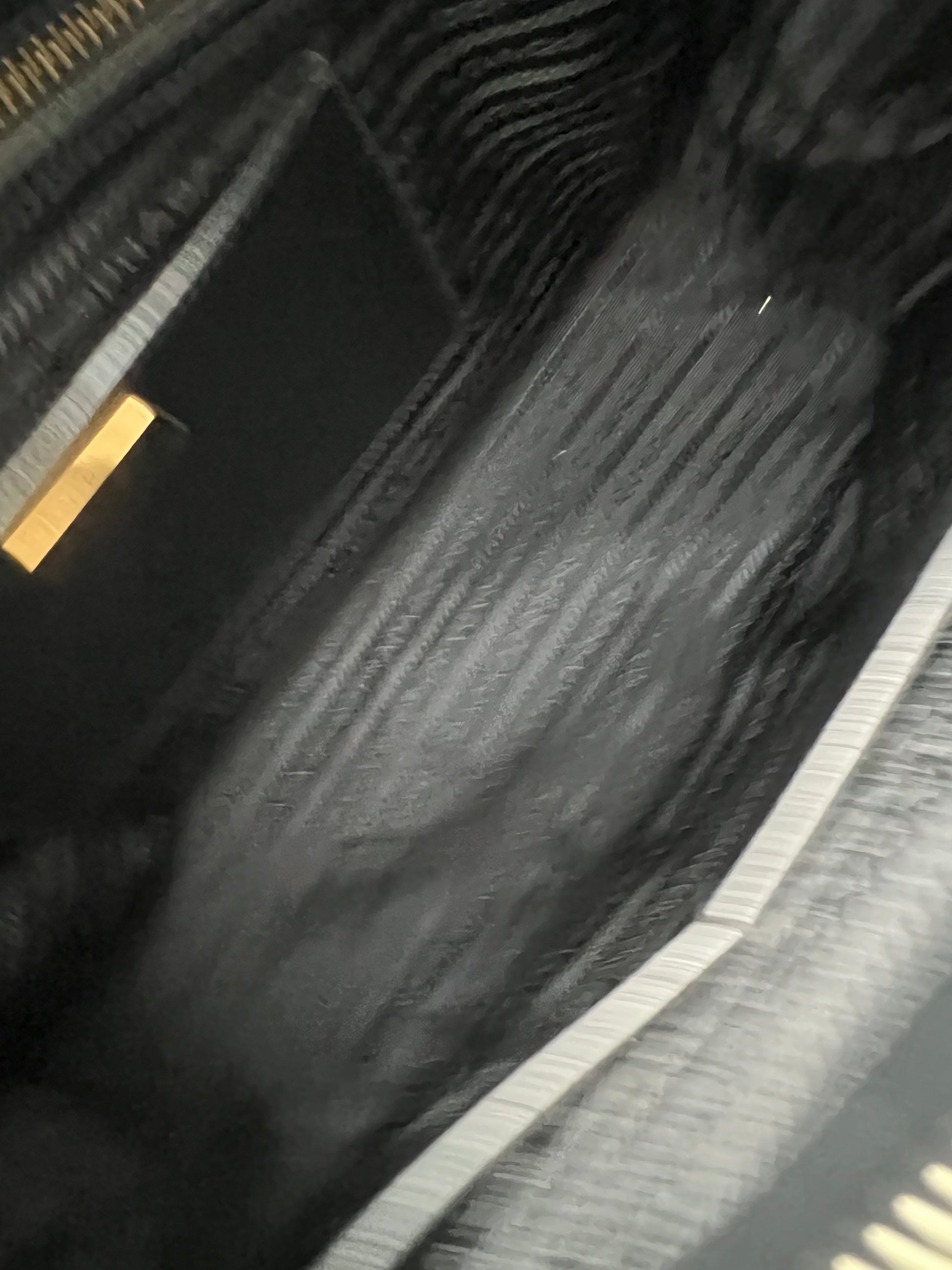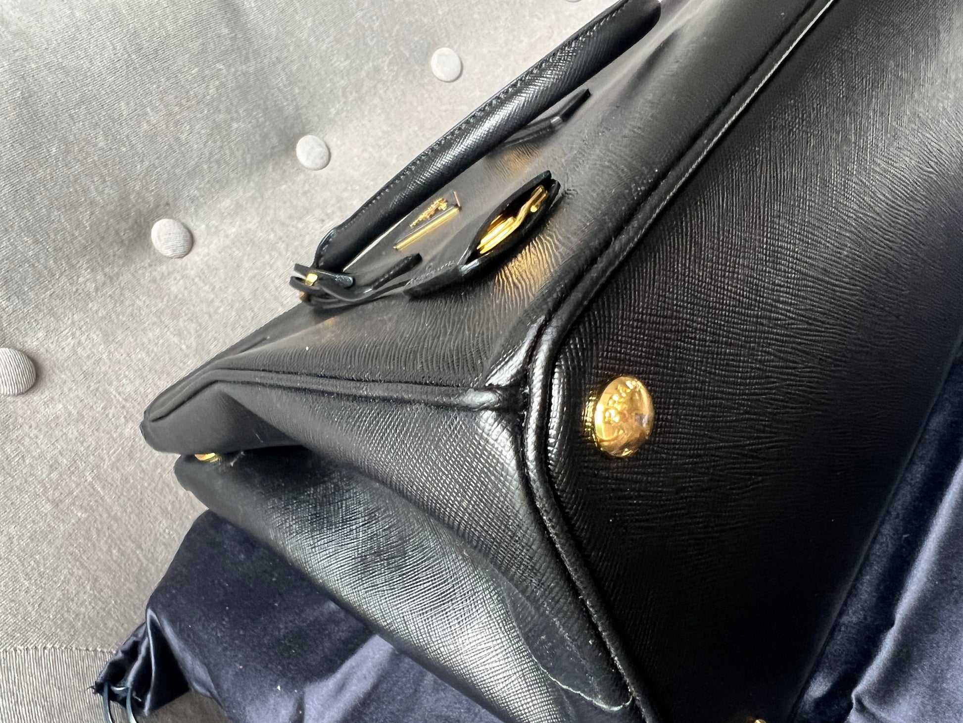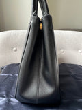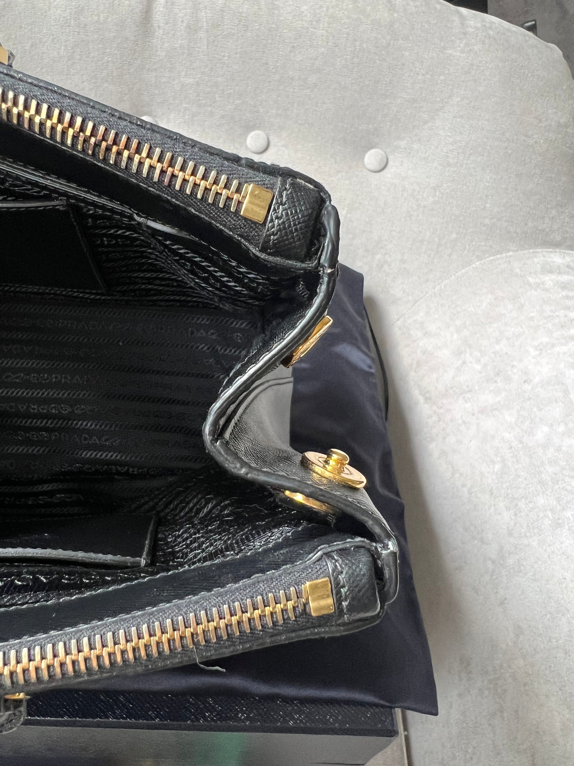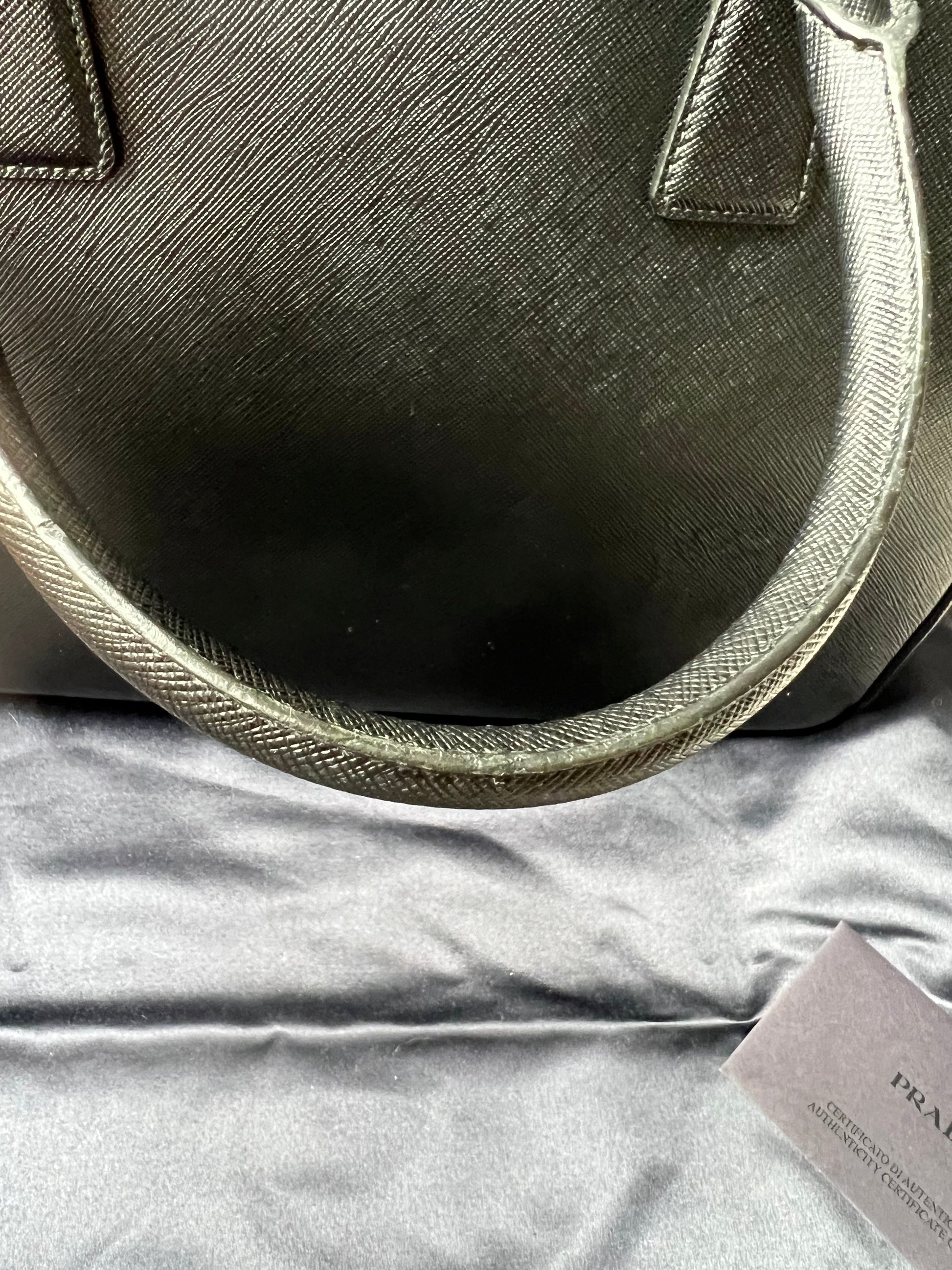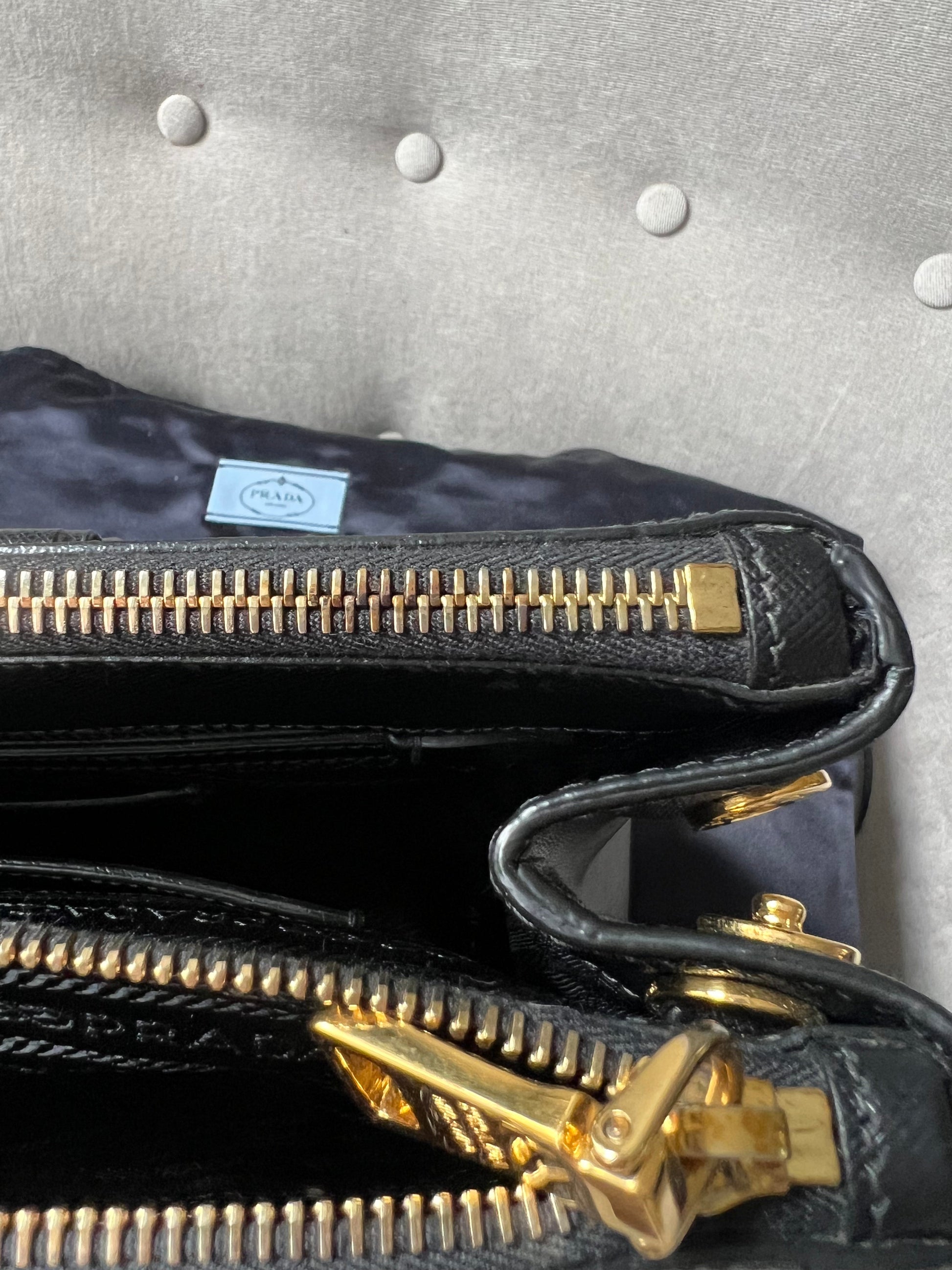 Prada Galleria Tote in Black Saffiano with gold hardware. This iconic Saffiano Tote is a simple, practical and easy to use bag that's been a Prada staple for years. The clean and elegant aesthetic makes it Ideal for formal use or work with its three interior sections (two zipper sections), it is popper gusset sides to expand capacity. Crafted from a firm, robust leather means this bag is ideal for day to day or work use. Can be carried in hand or the crook of the arm using the top handles or over shoulder/cross body using the long detachable strap. approx 2013 year.