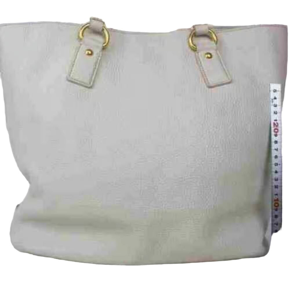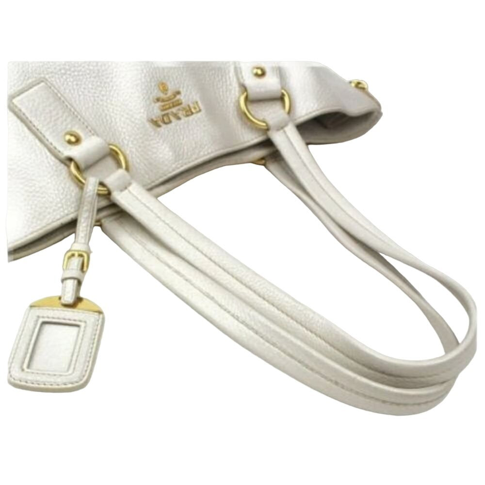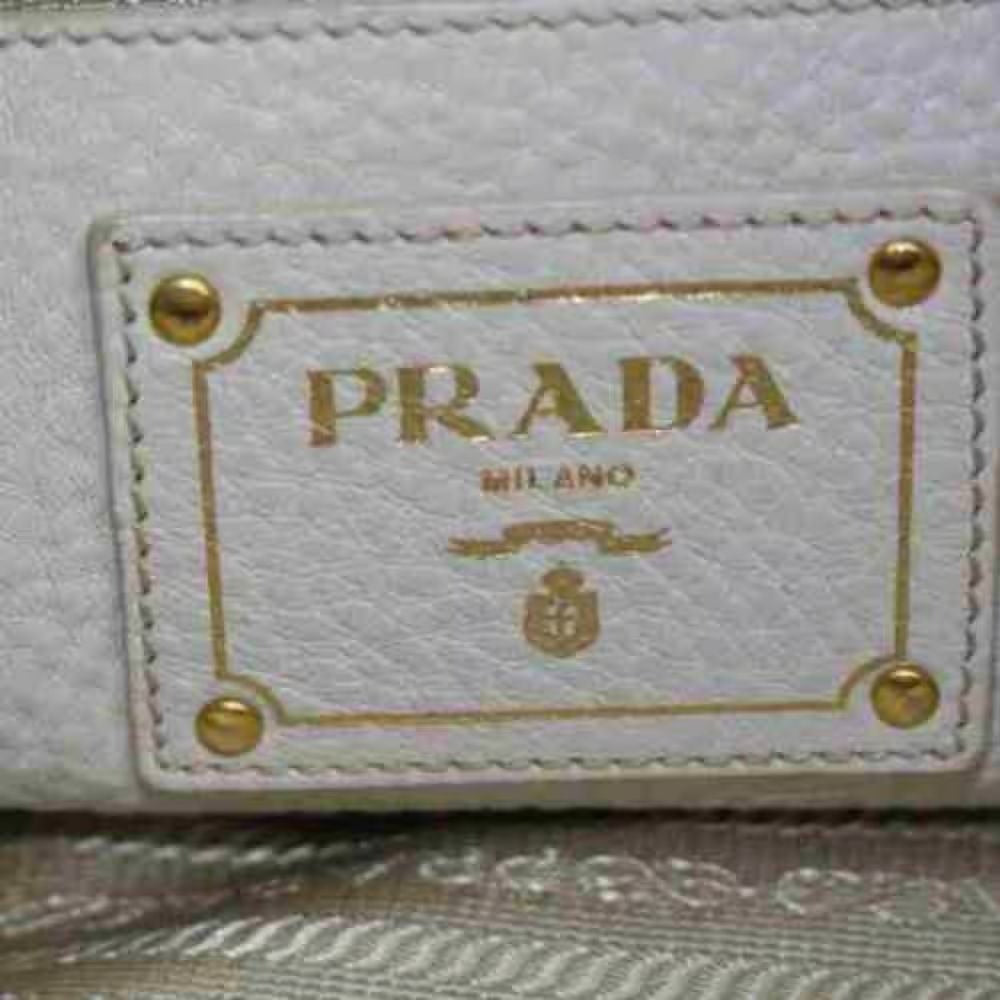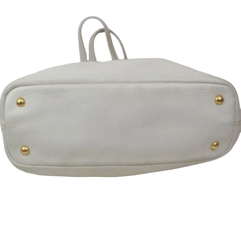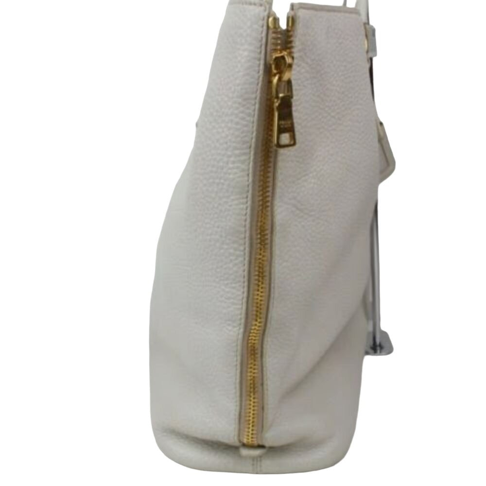The bag is a Vitello Daino, tote bag style from Italian designer Prada. It's crafted from a soft grained leather in either ivory or off-white. It has a magnetic snap button closure with two longer flat leather handles and a footed bottom. The hardware is bold gold and on the sides there are zippers so the tote can expand up to an additional 8 inches. It has a removable name/luggage tag. This is a beautiful tote that will last a lifetime and always be in style!