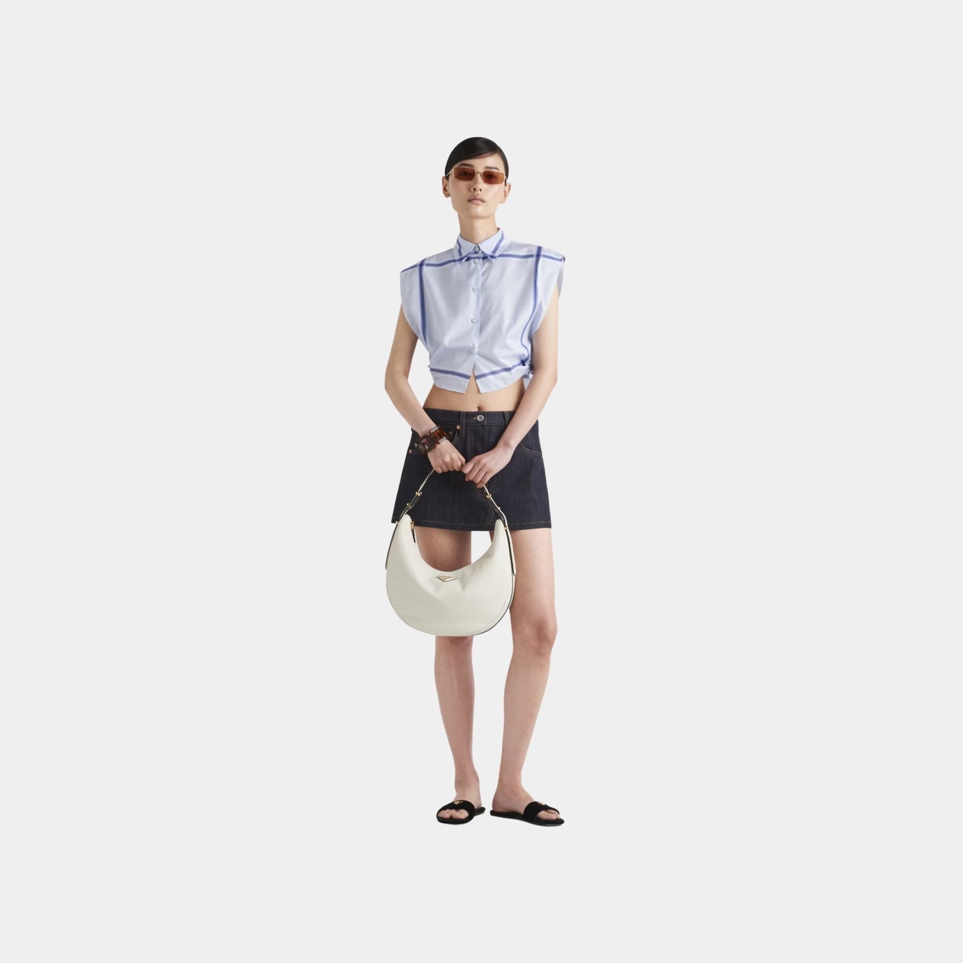 The Large Calfskin Leather Shoulder Bag is a perfect balance of minimalism and luxury, showcasing Prada’s commitment to contemporary elegance. The sinuous silhouette makes it an ideal choice for day-to-night wear, offering both style and practicality. The roomy yet sleek design ensures ample storage without compromising on a streamlined aesthetic.