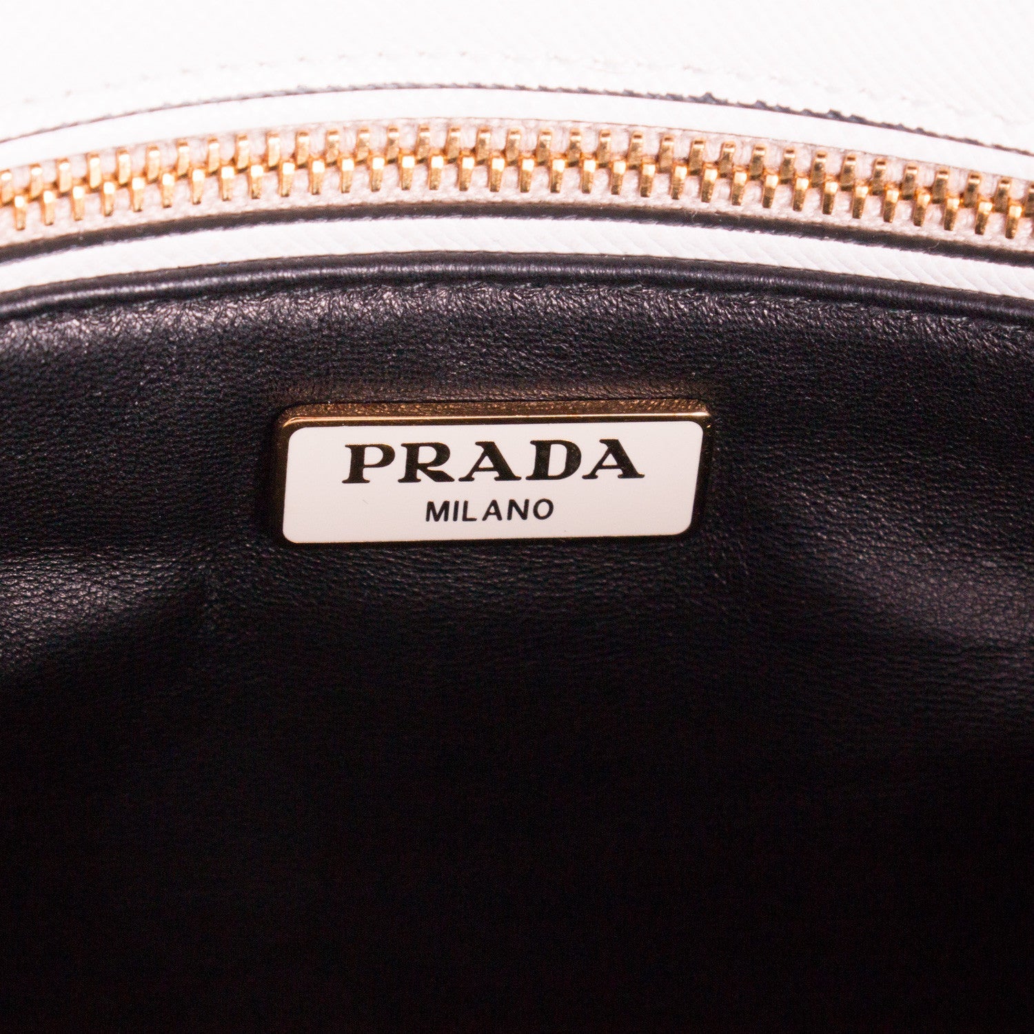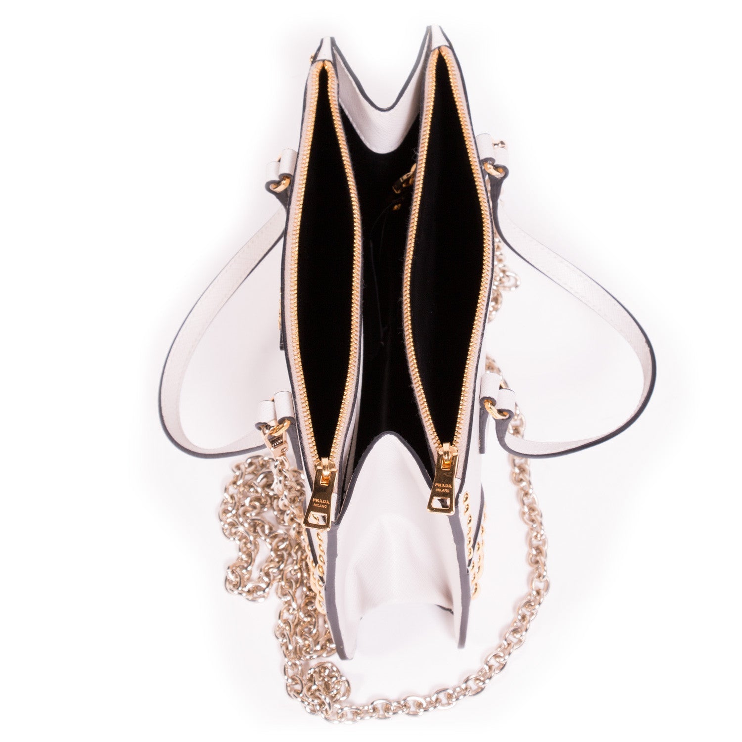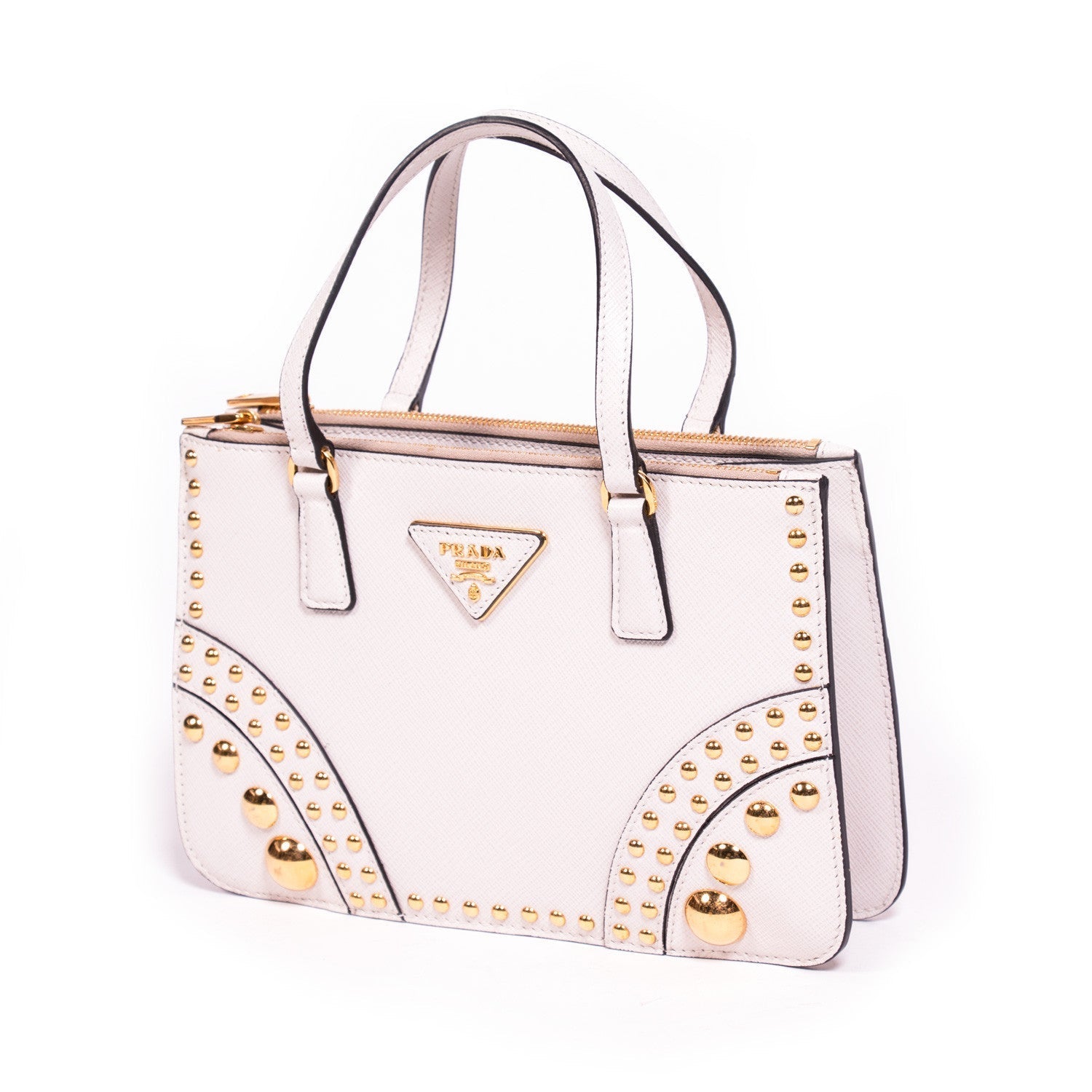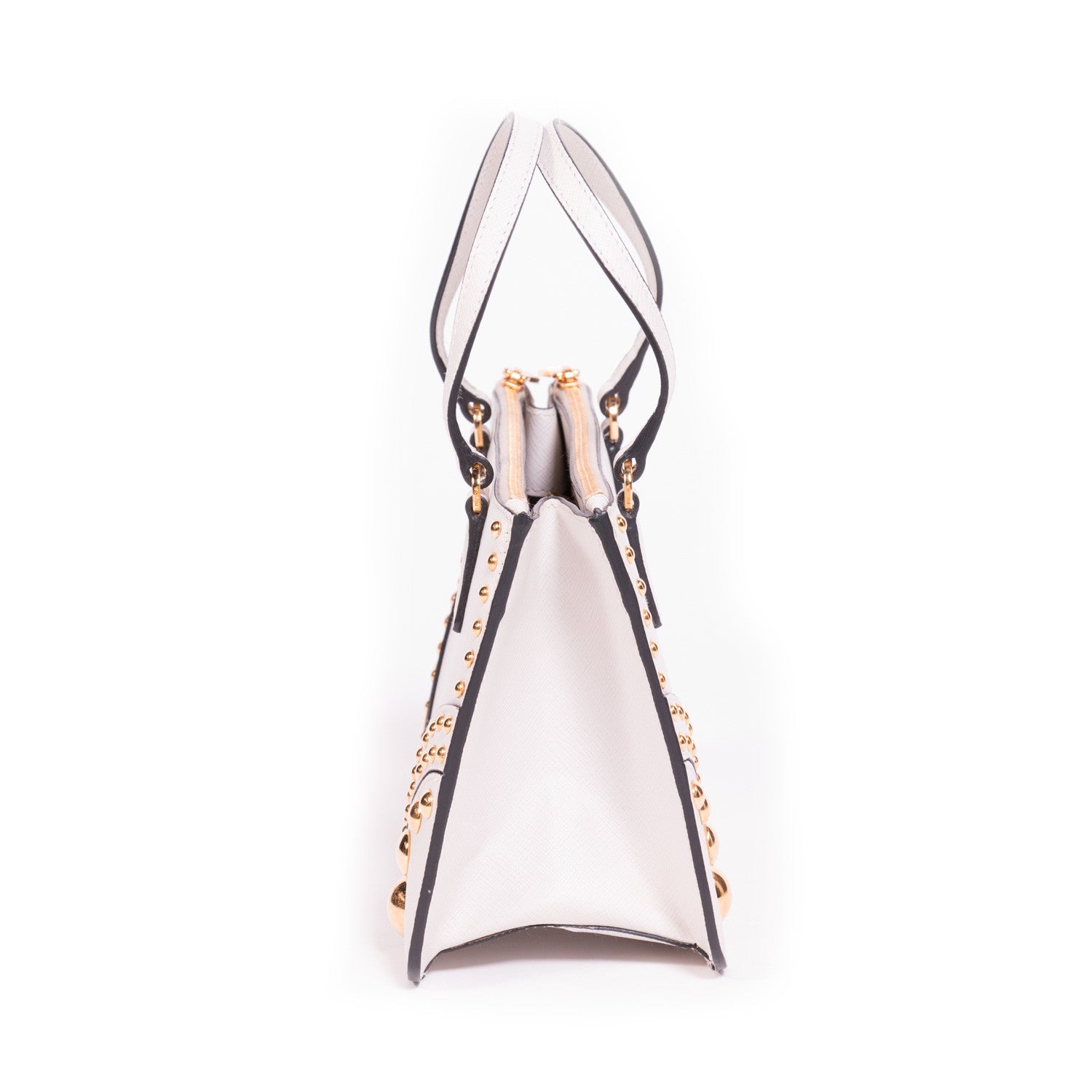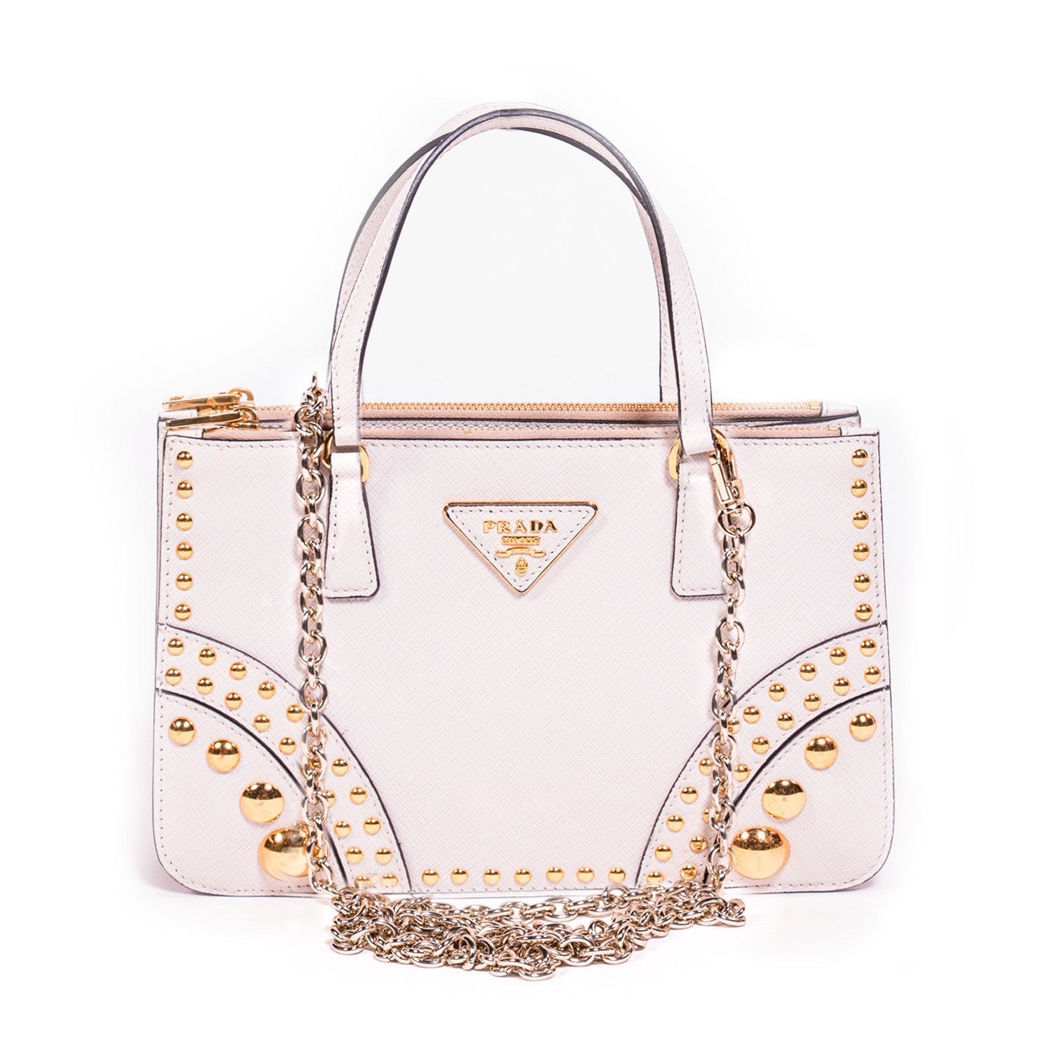 Details: White Saffiano Leather / Faceted Gold Dome Studs / Gold Tone Hardware / Dual Flat Top Handles / 4" Drop / Two Exterior Front And Back Zip Pockets Frame Open Top / Leather Triangle With Gold Logo Lettering / Black Leather Interior Lining With Single Zip Inside and Single Open Pocket / Chain For Shoulder