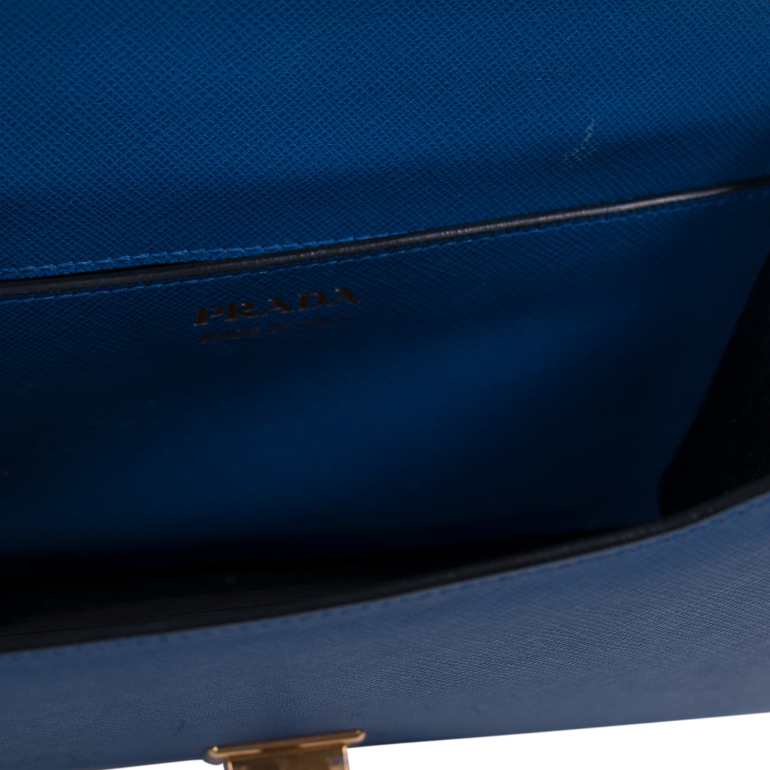Details: Blue Saffiano Leather / Gold-Tone Hardware / Chain Shoulder Strap with Leather Pad / Single Compartment / Black Woven Interior / Slit Pocket at Inside / Turn-Lock Closure at Front Flap