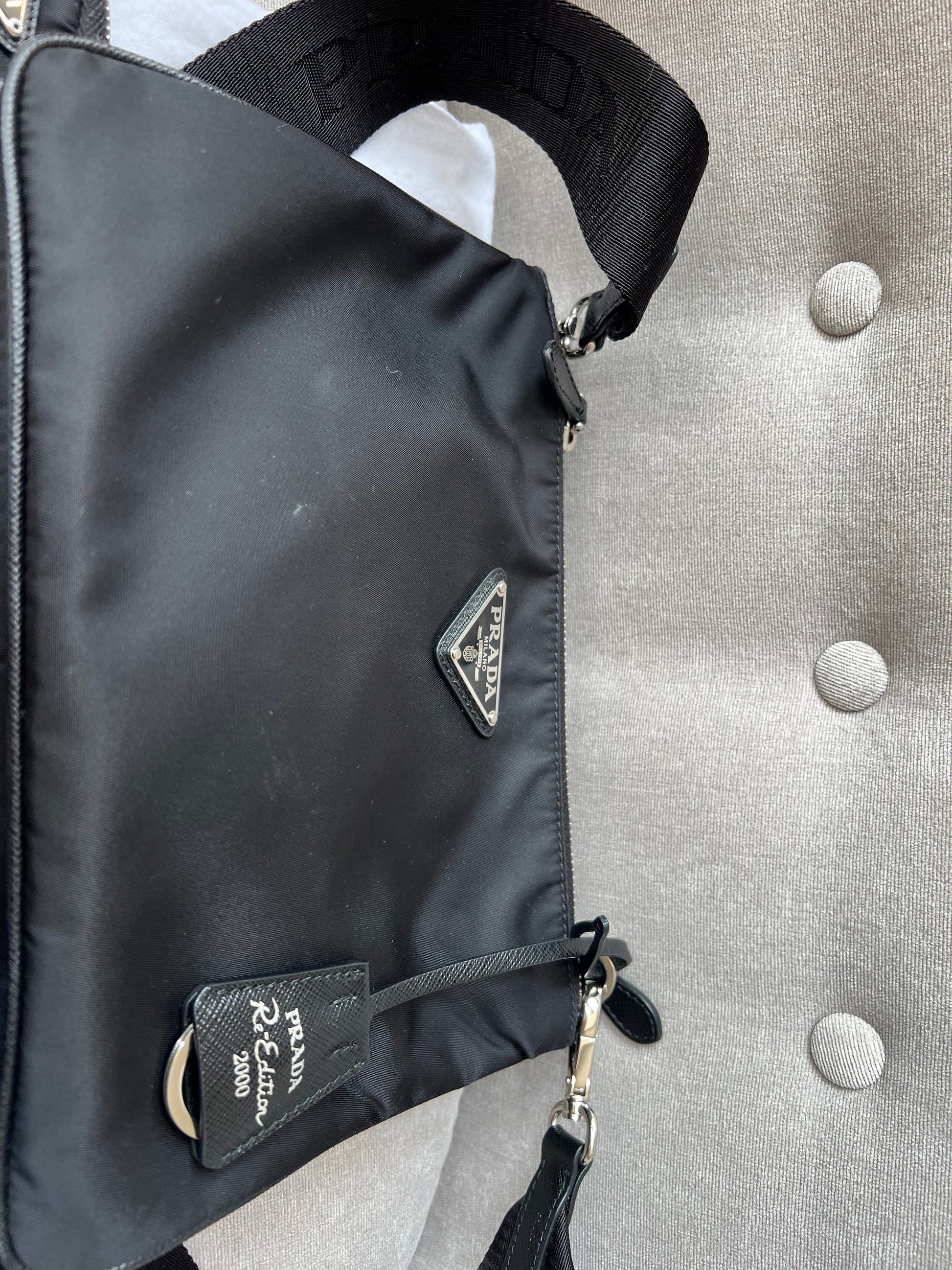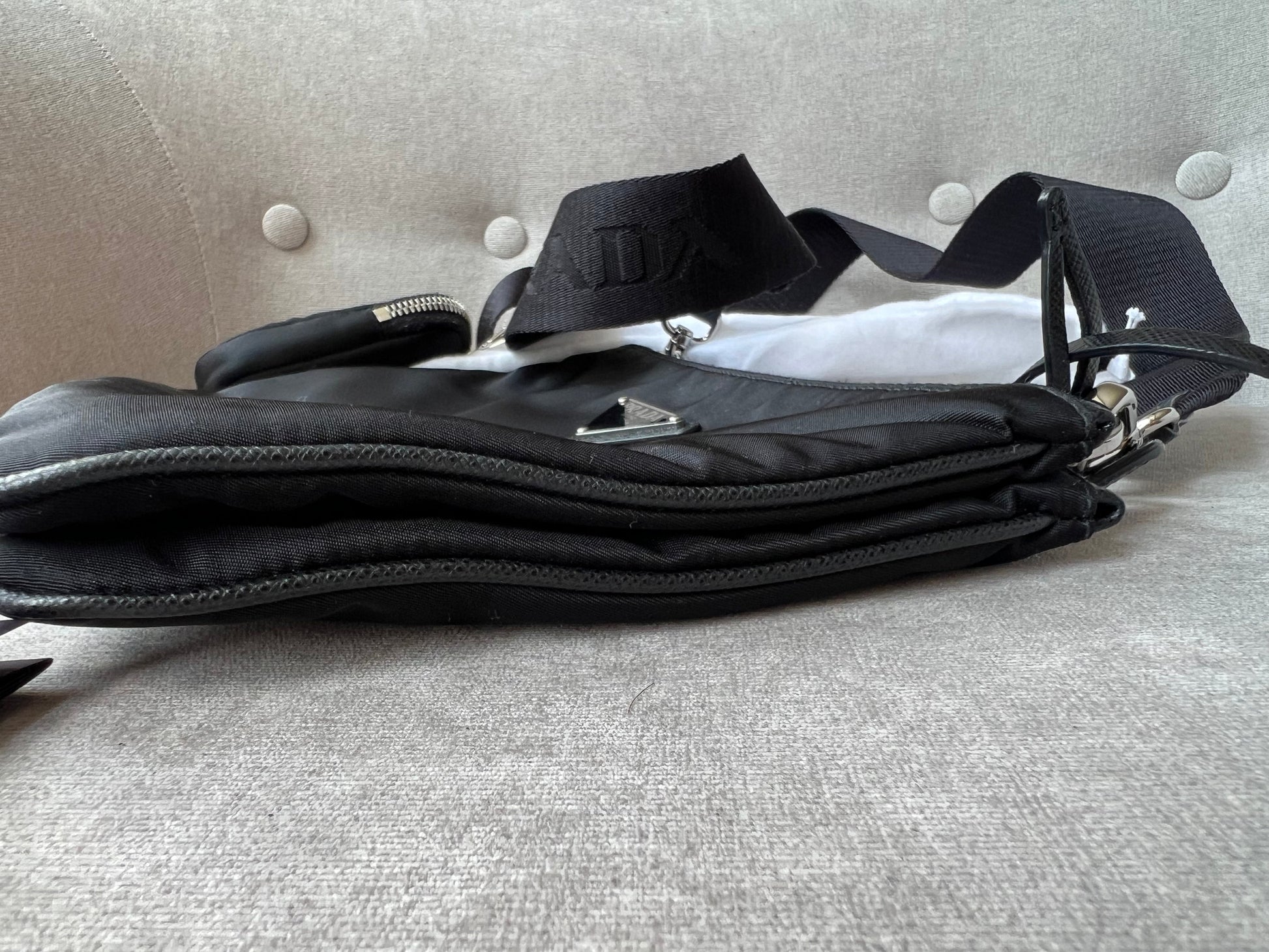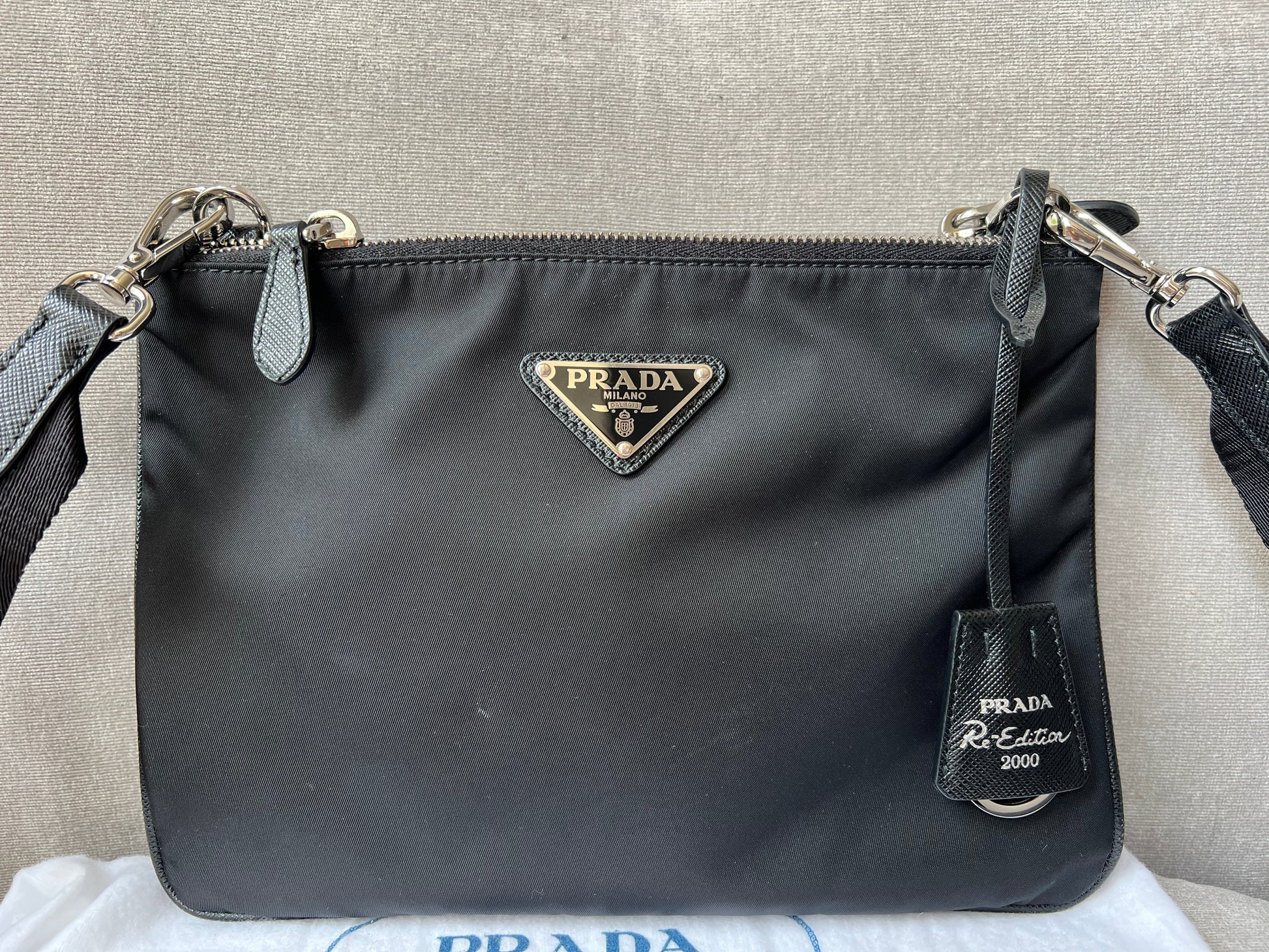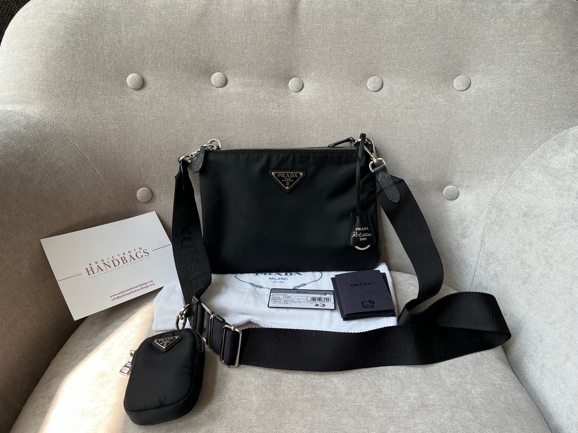 Prada Re-Edition 2000 Shoulder Bag in Black Nylon with silver hardware. This item is made of Re-nylon: a regenerated nylon yarn produced from recycled, purified plastic rubbish. This versatile bag with Saffiano leather trim comes with detachable pouch attached to the shoulder strap. Can be over shoulder or cross body using the long strap. The accessory is embellished with the enameled metal triangle logo.