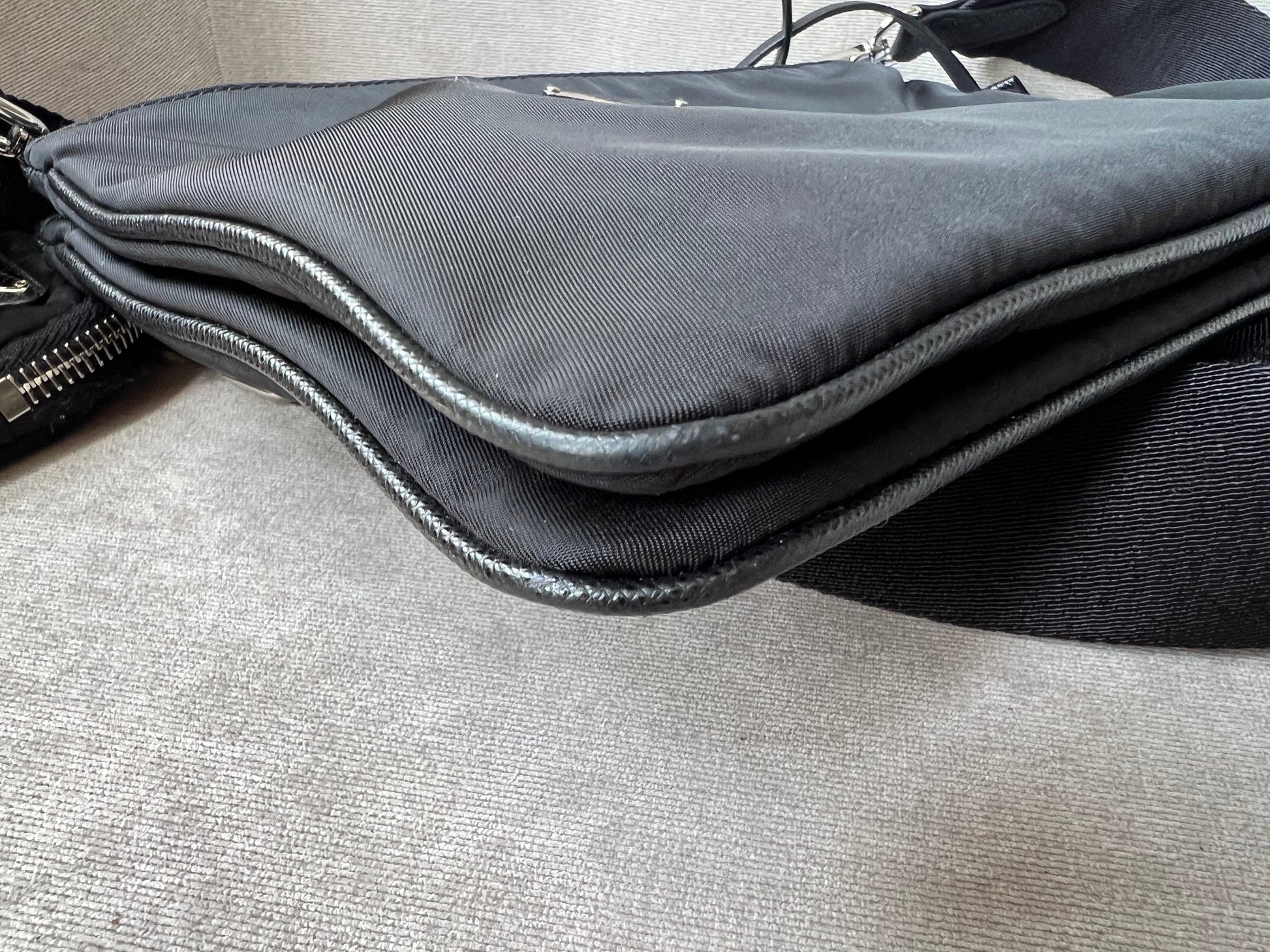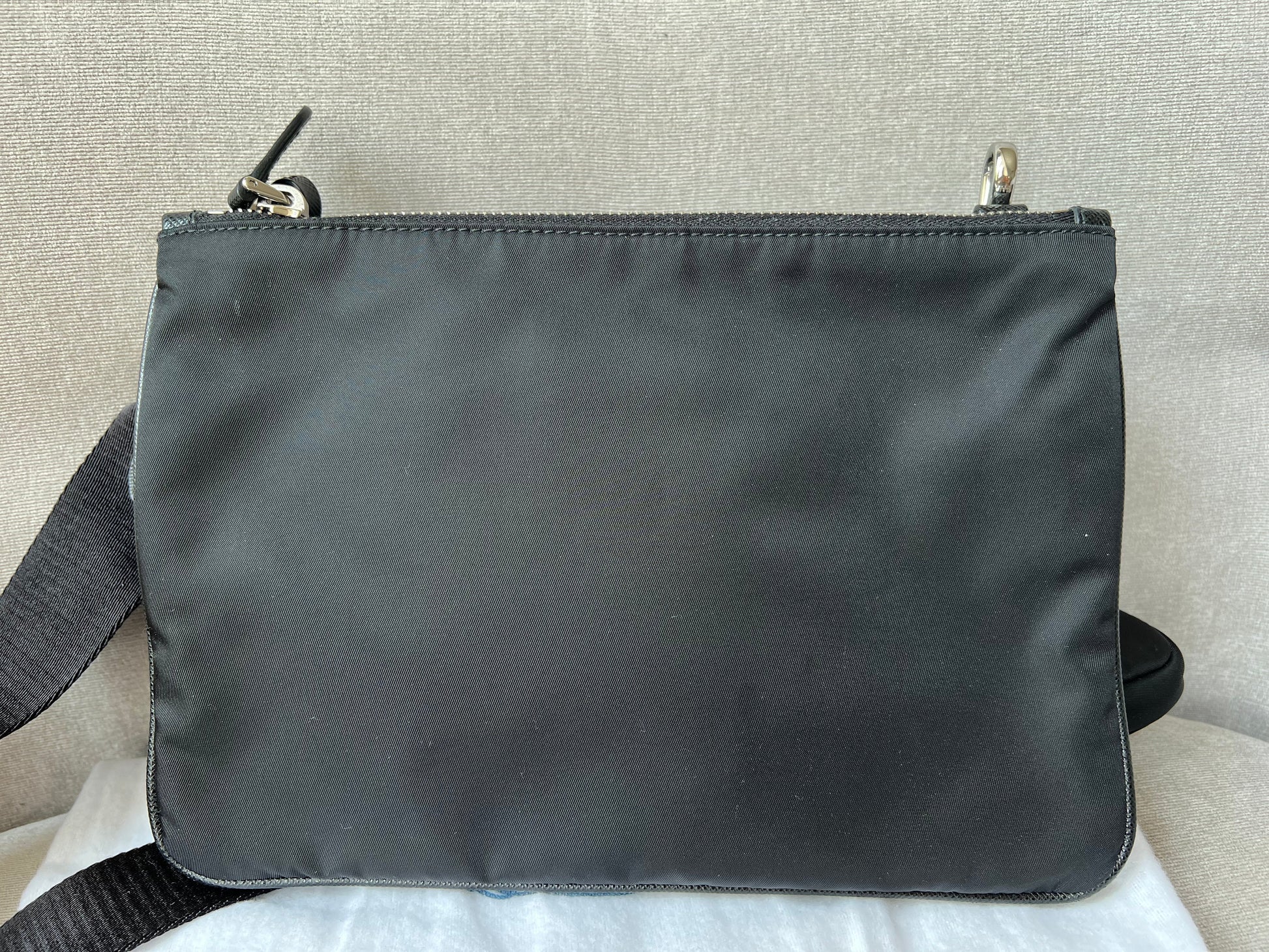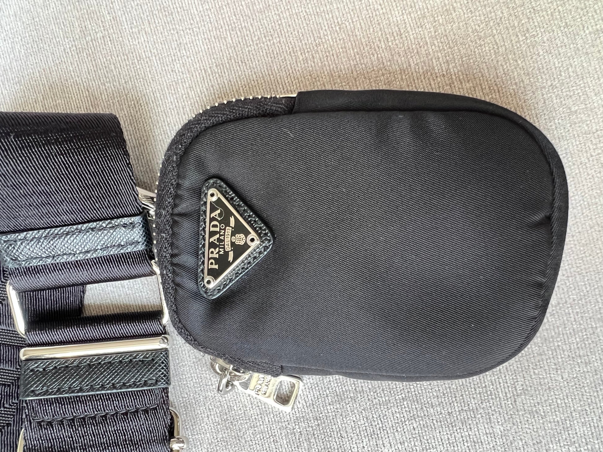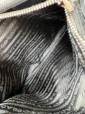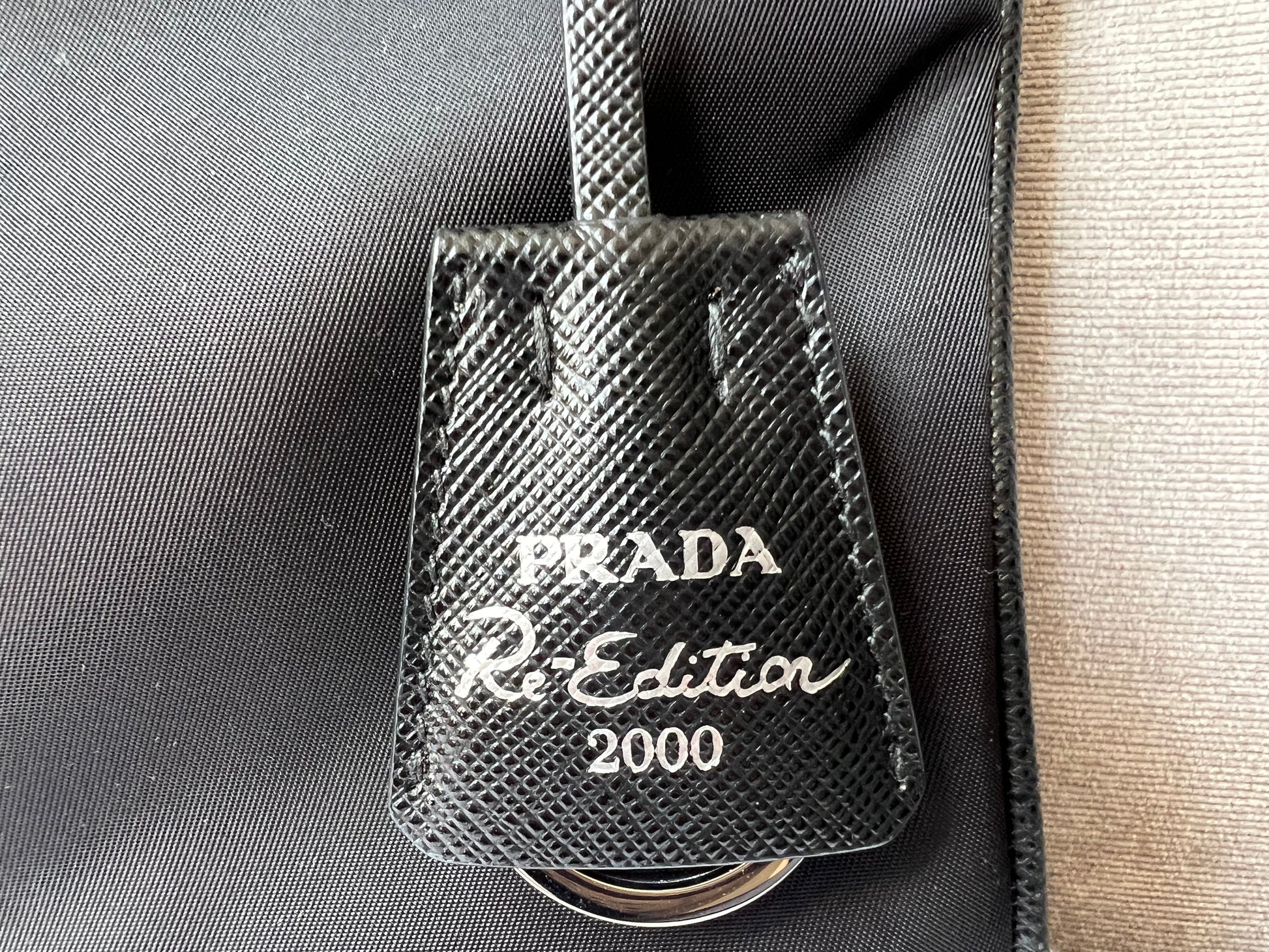 Prada Re-Edition 2000 Shoulder Bag in Black Nylon with silver hardware. This item is made of Re-nylon: a regenerated nylon yarn produced from recycled, purified plastic rubbish. This versatile bag with Saffiano leather trim comes with detachable pouch attached to the shoulder strap. Can be over shoulder or cross body using the long strap. The accessory is embellished with the enameled metal triangle logo.