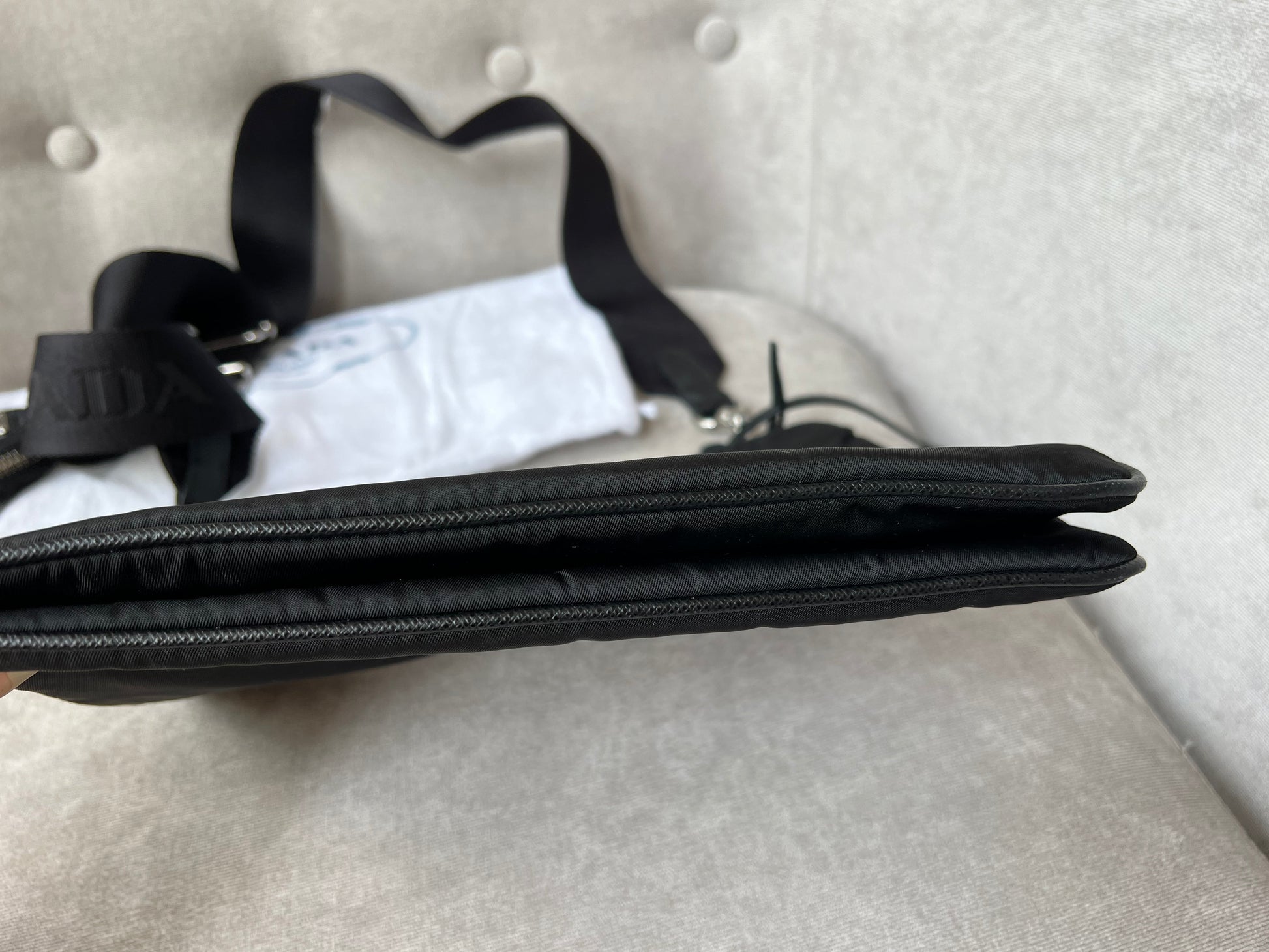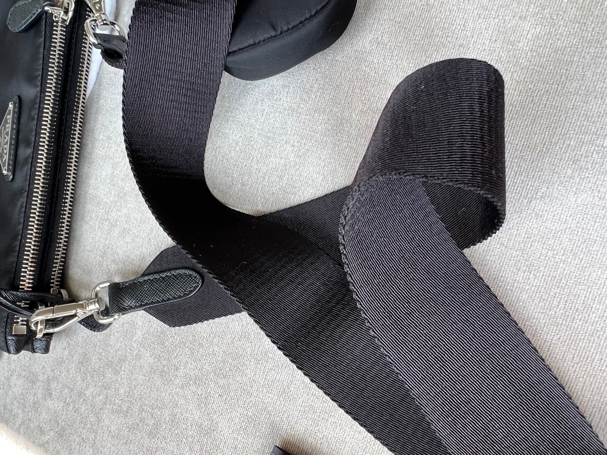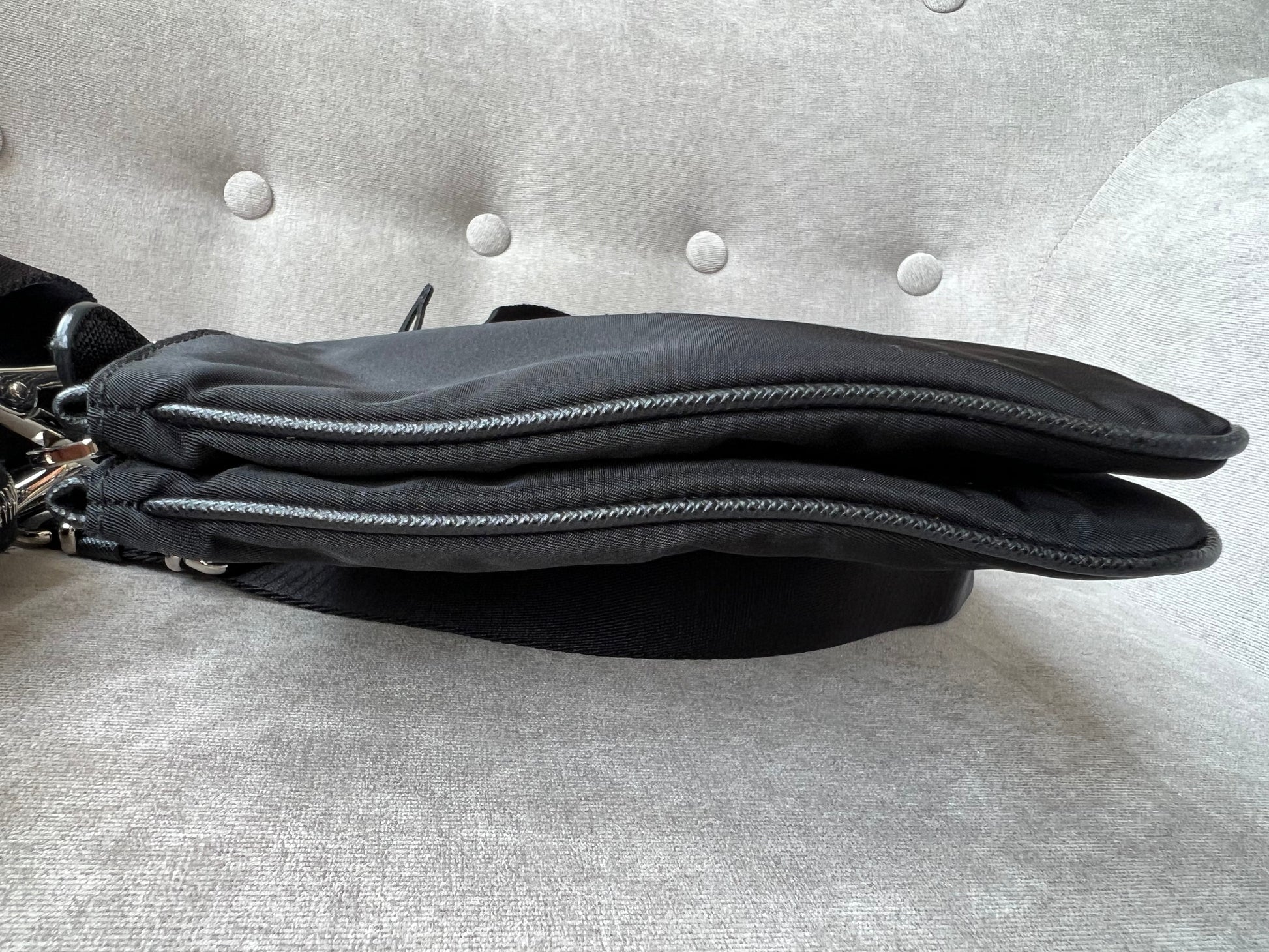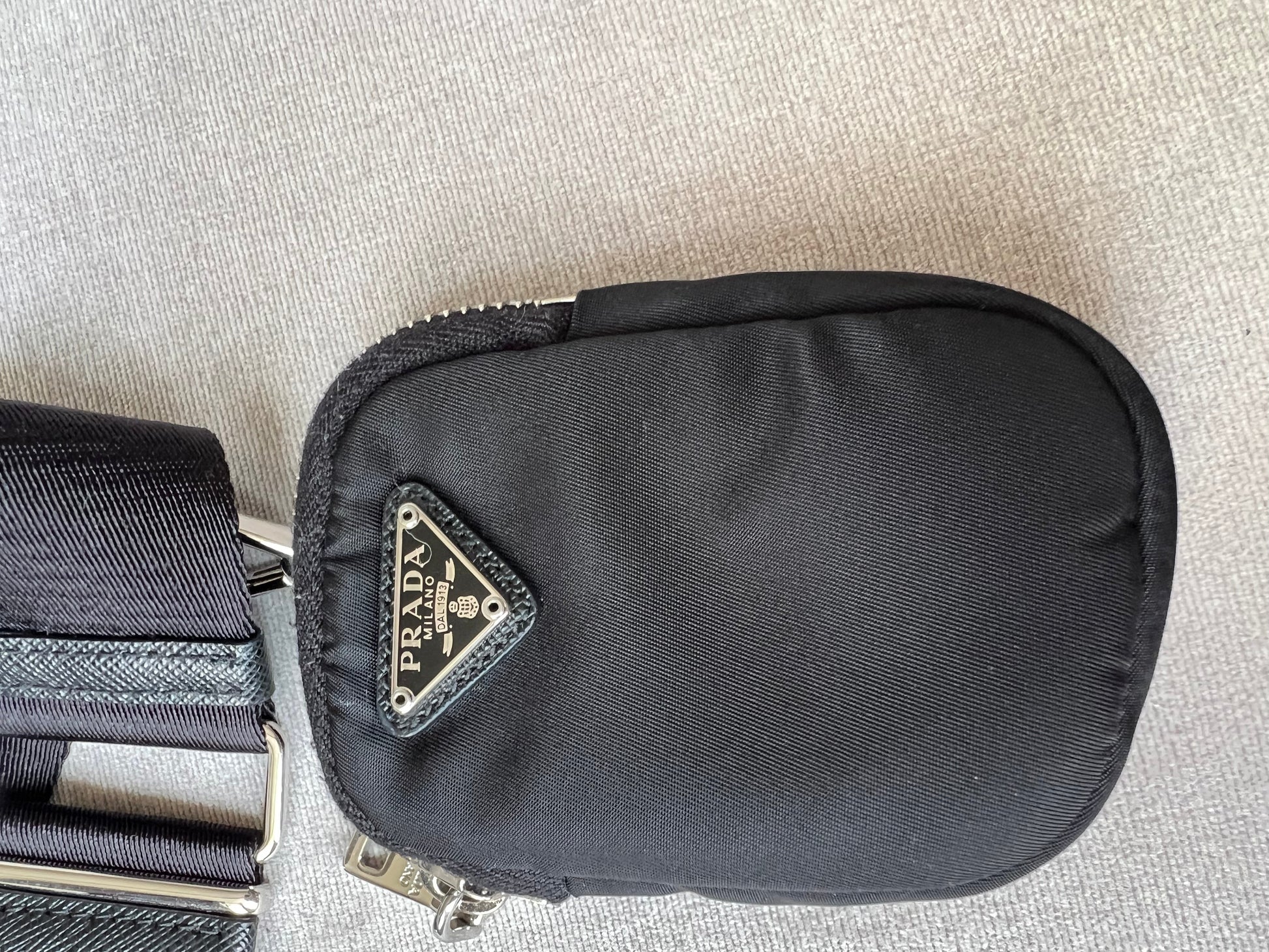 Prada Re-Edition 2000 Shoulder Bag in Black Nylon with silver hardware. This item is made of Re-nylon: a regenerated nylon yarn produced from recycled, purified plastic rubbish. This versatile bag with Saffiano leather trim comes with detachable pouch attached to the shoulder strap. Can be over shoulder or cross body using the long strap. The accessory is embellished with the enameled metal triangle logo.