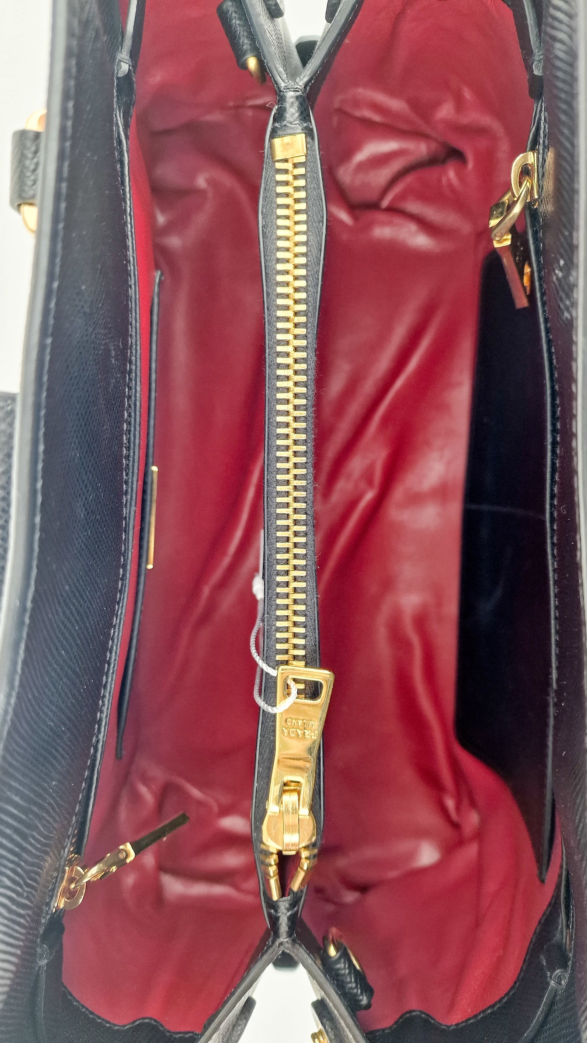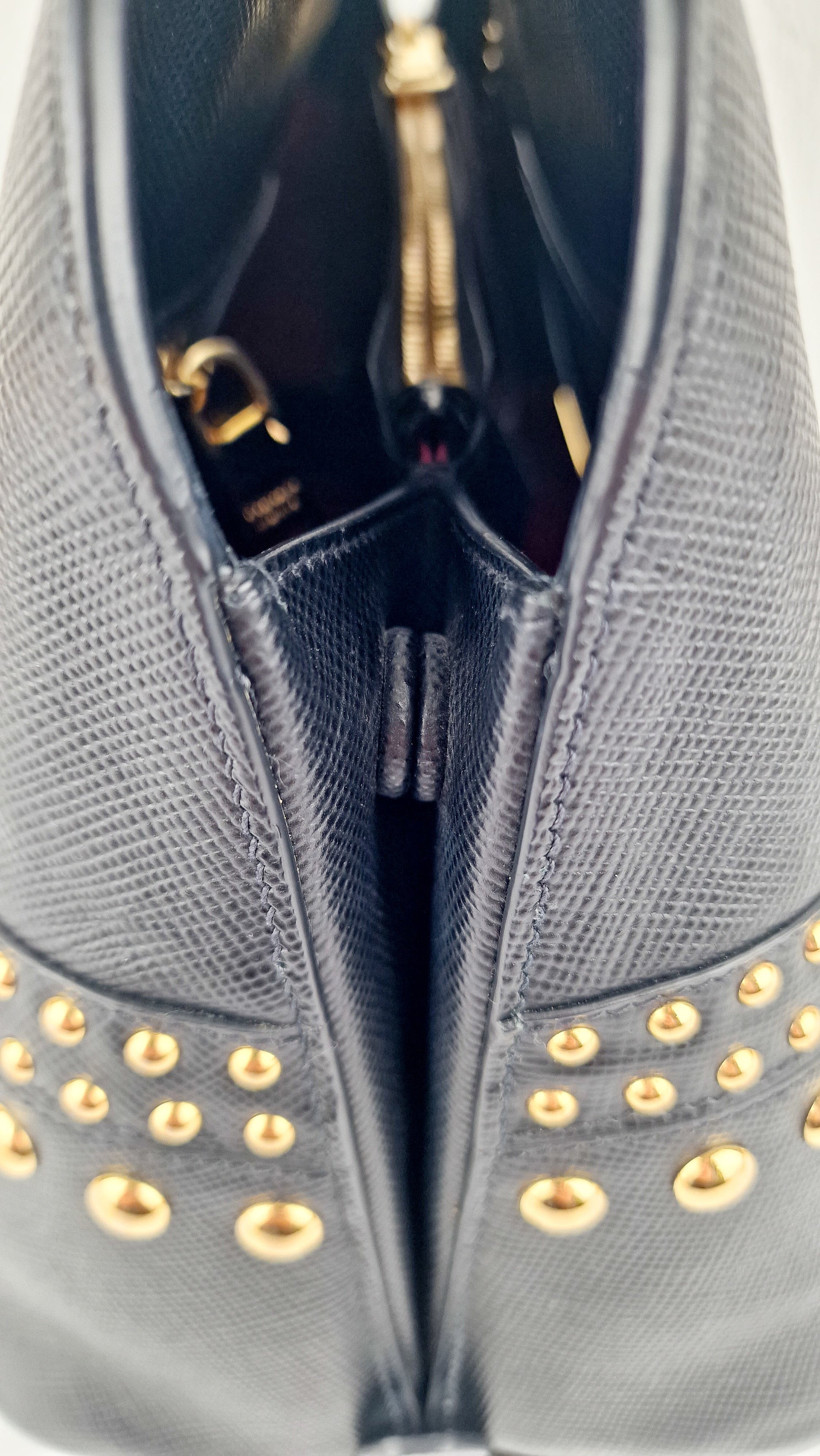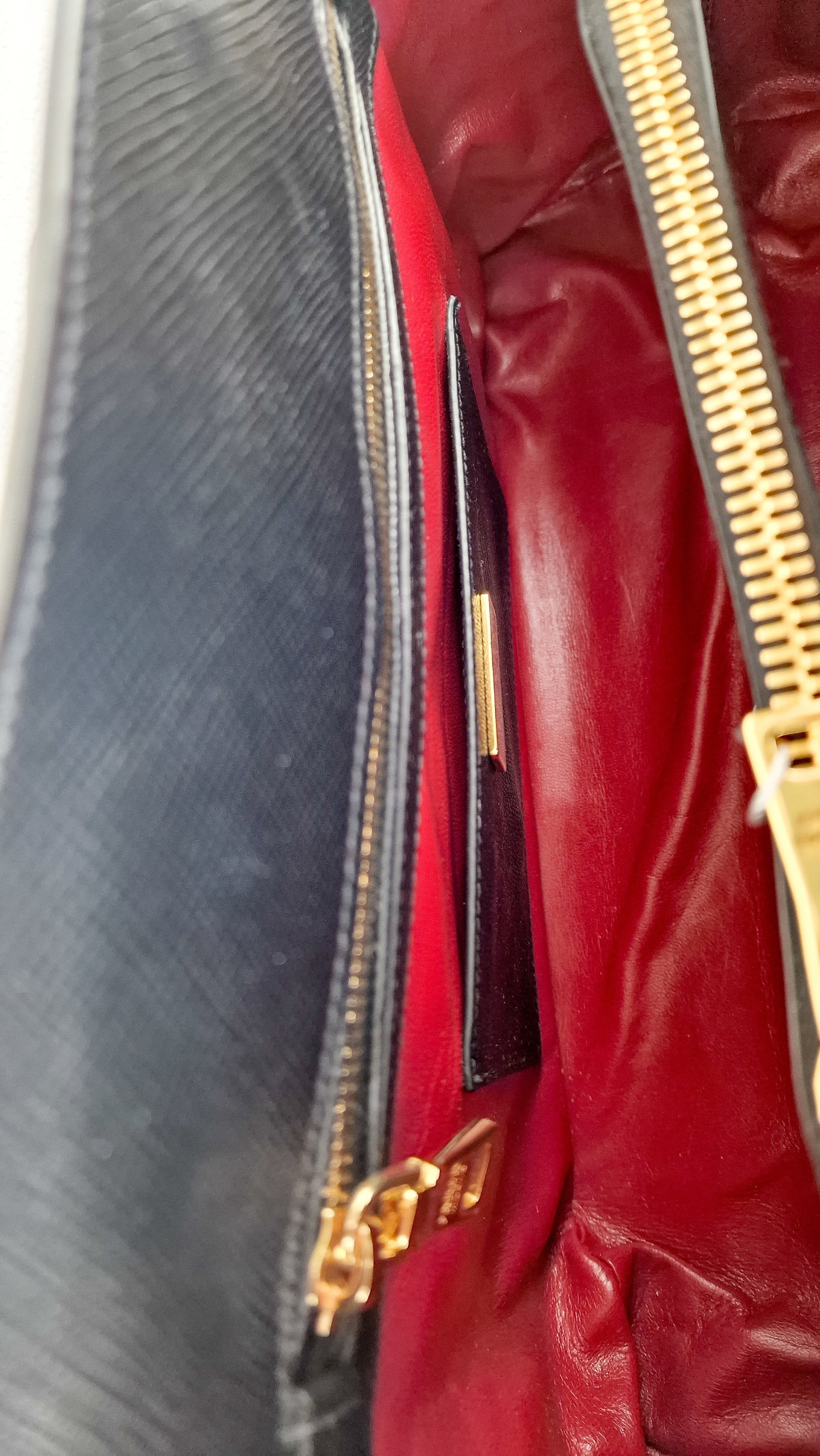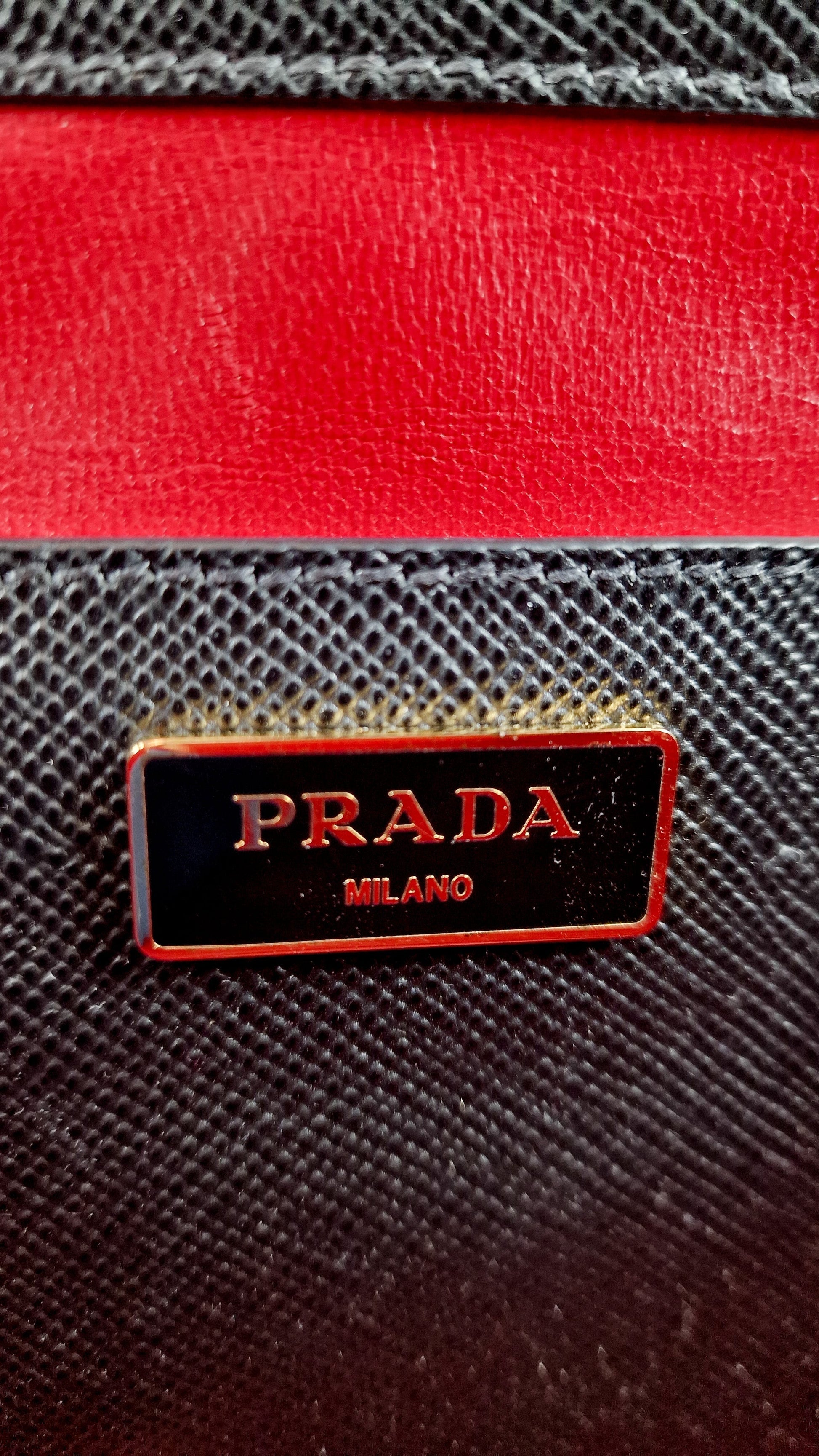 This is an absolutely beautiful Prada bag in classic black saffiano leather with gold hardware and rivets. It features red nappa leather lining giving a great pop of color! The bag consists of two good sized compartments divided by a zipped middle pocket and has both zipped and open flat pockets inside giving you lots of options for organization.