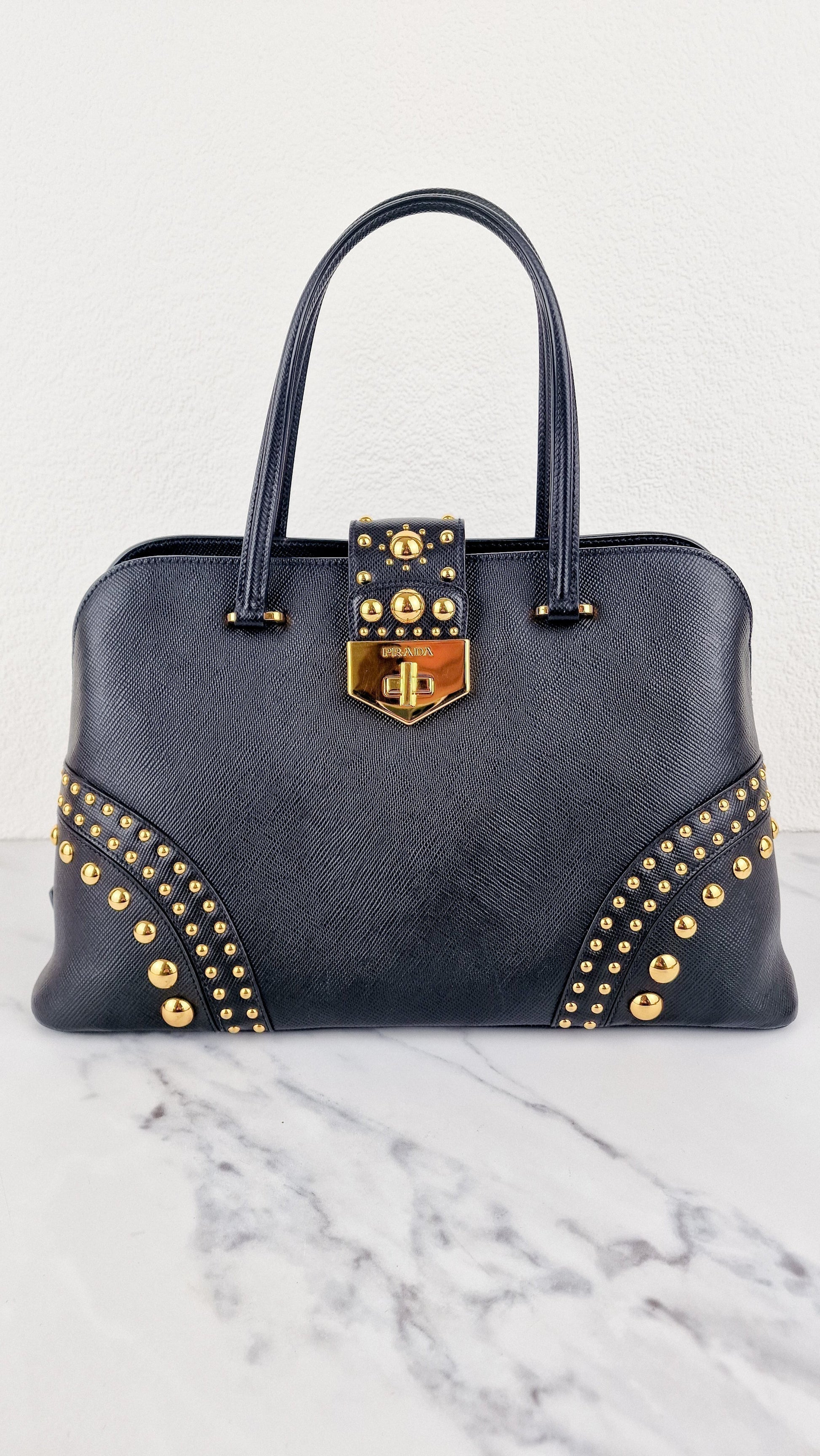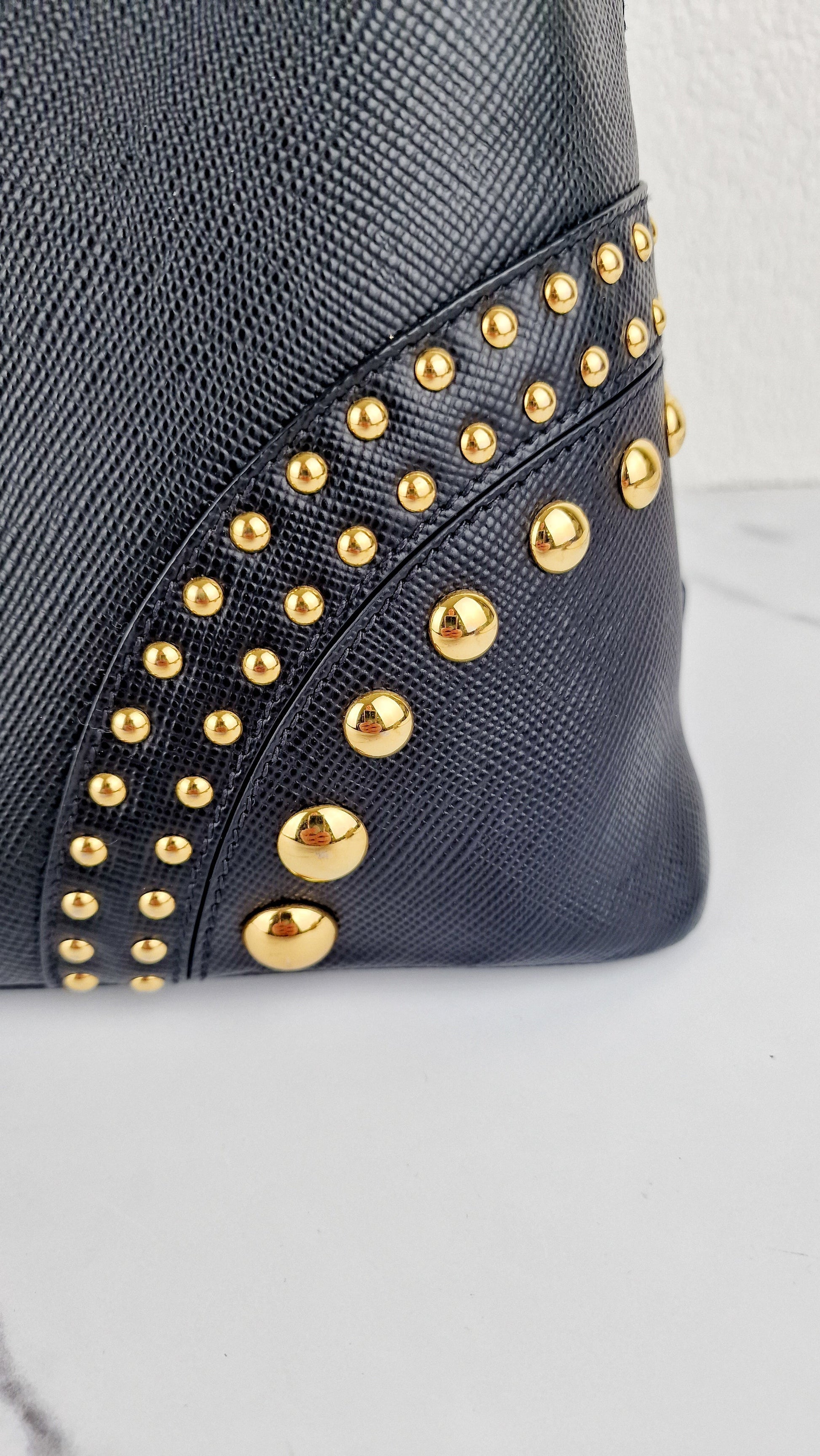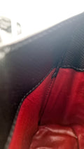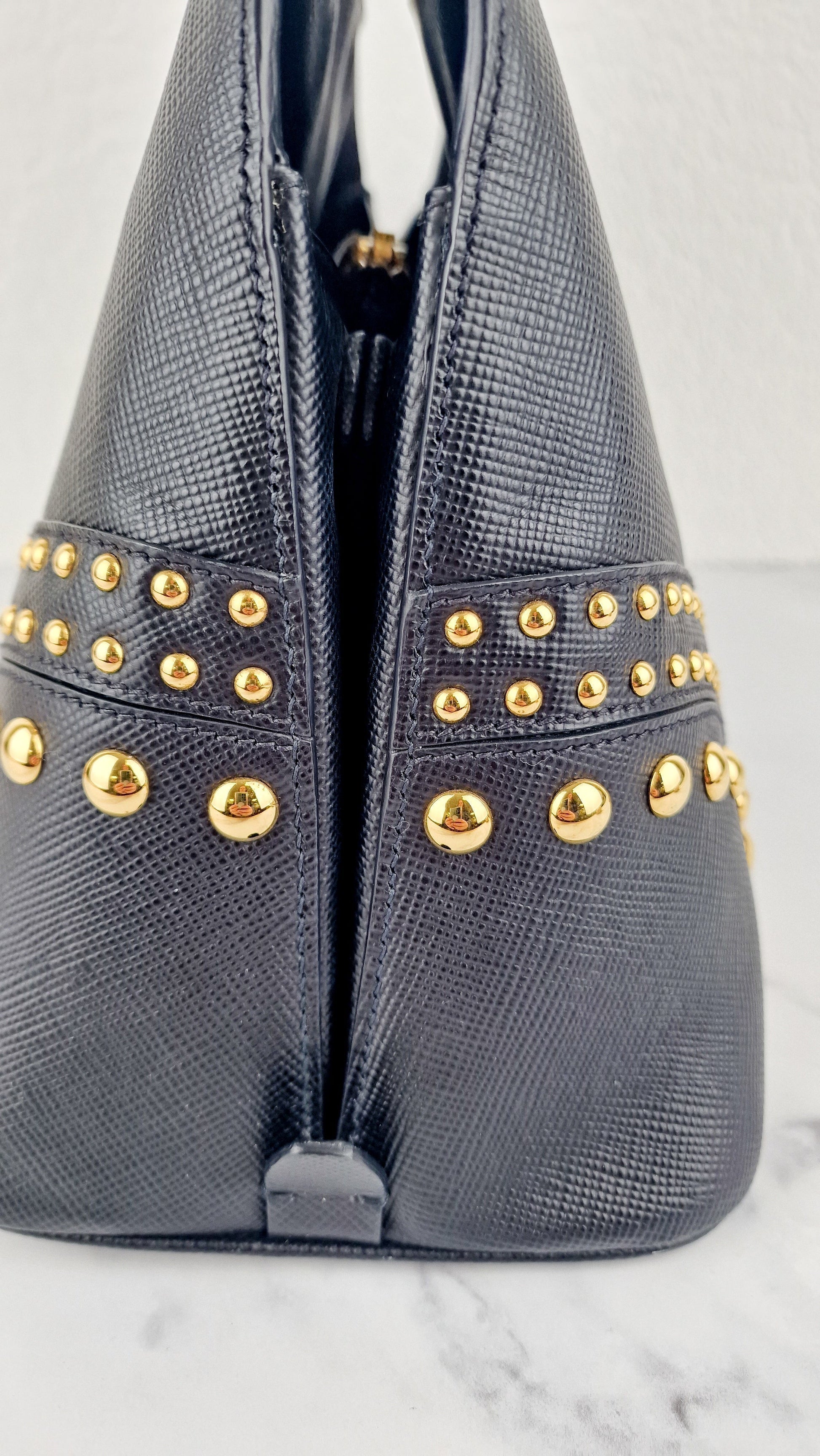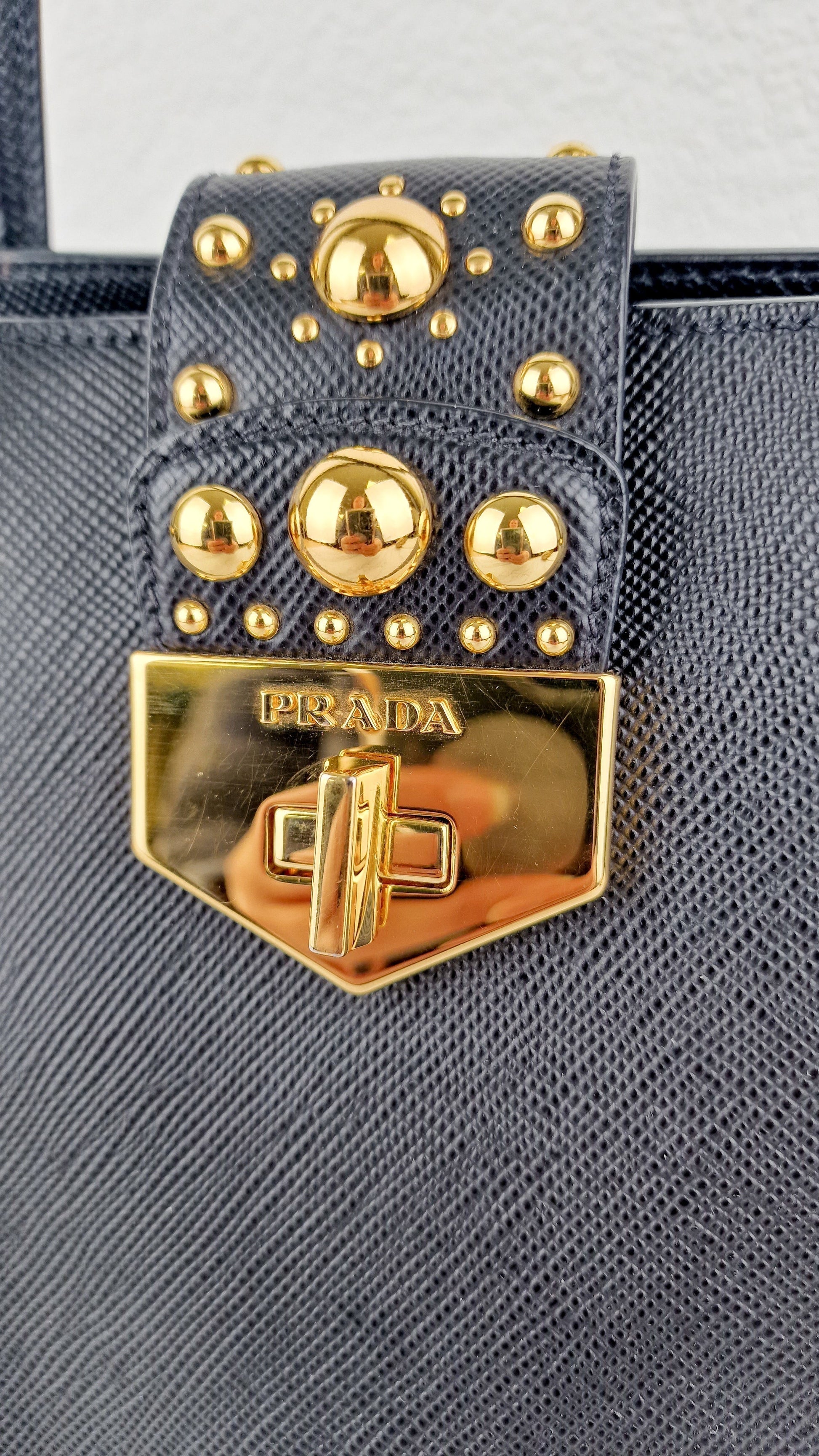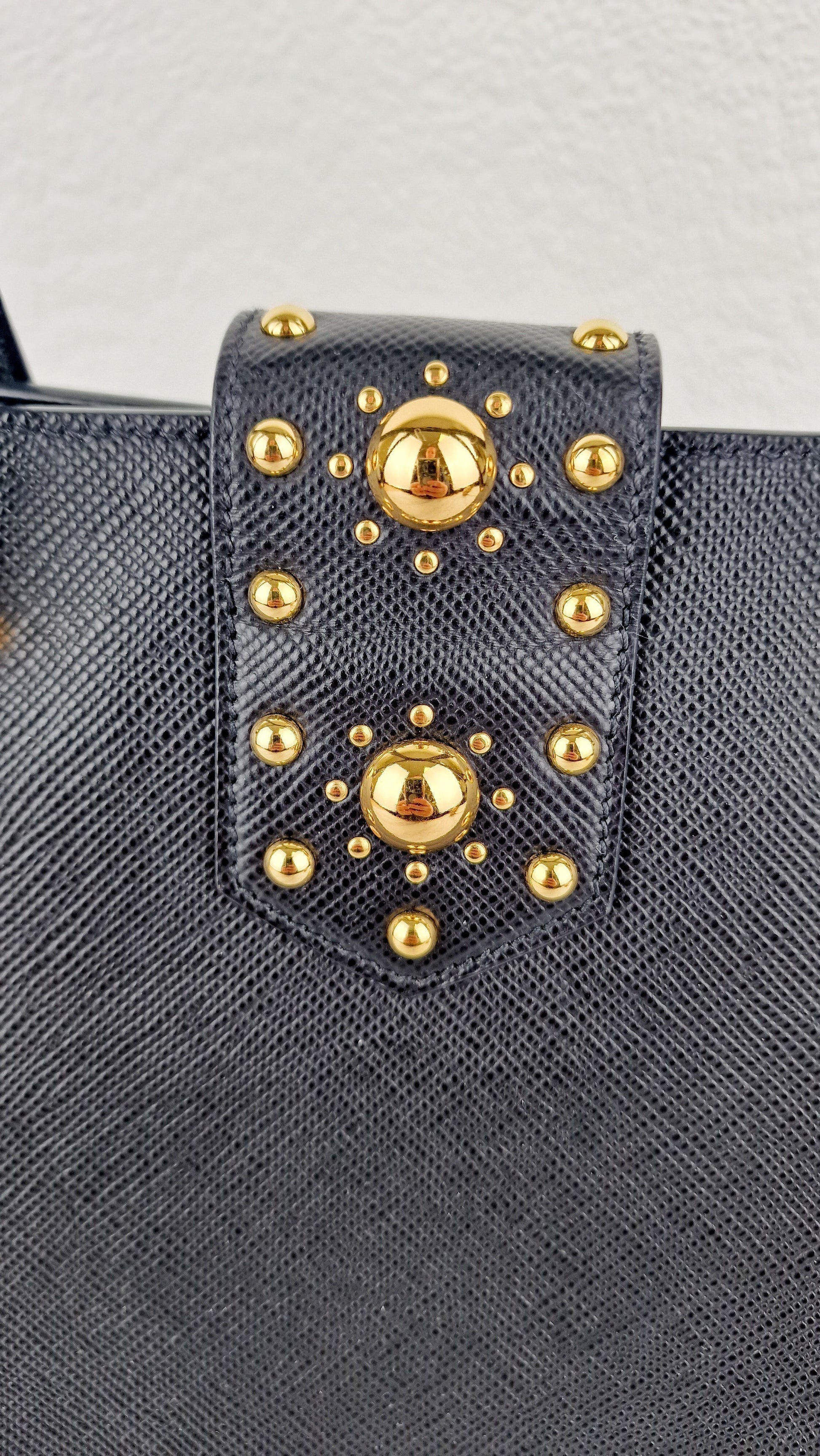 This is an absolutely beautiful Prada bag in classic black saffiano leather with gold hardware and rivets. It features red nappa leather lining giving a great pop of color! The bag consists of two good sized compartments divided by a zipped middle pocket and has both zipped and open flat pockets inside giving you lots of options for organization.