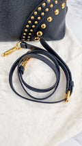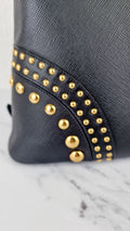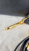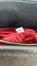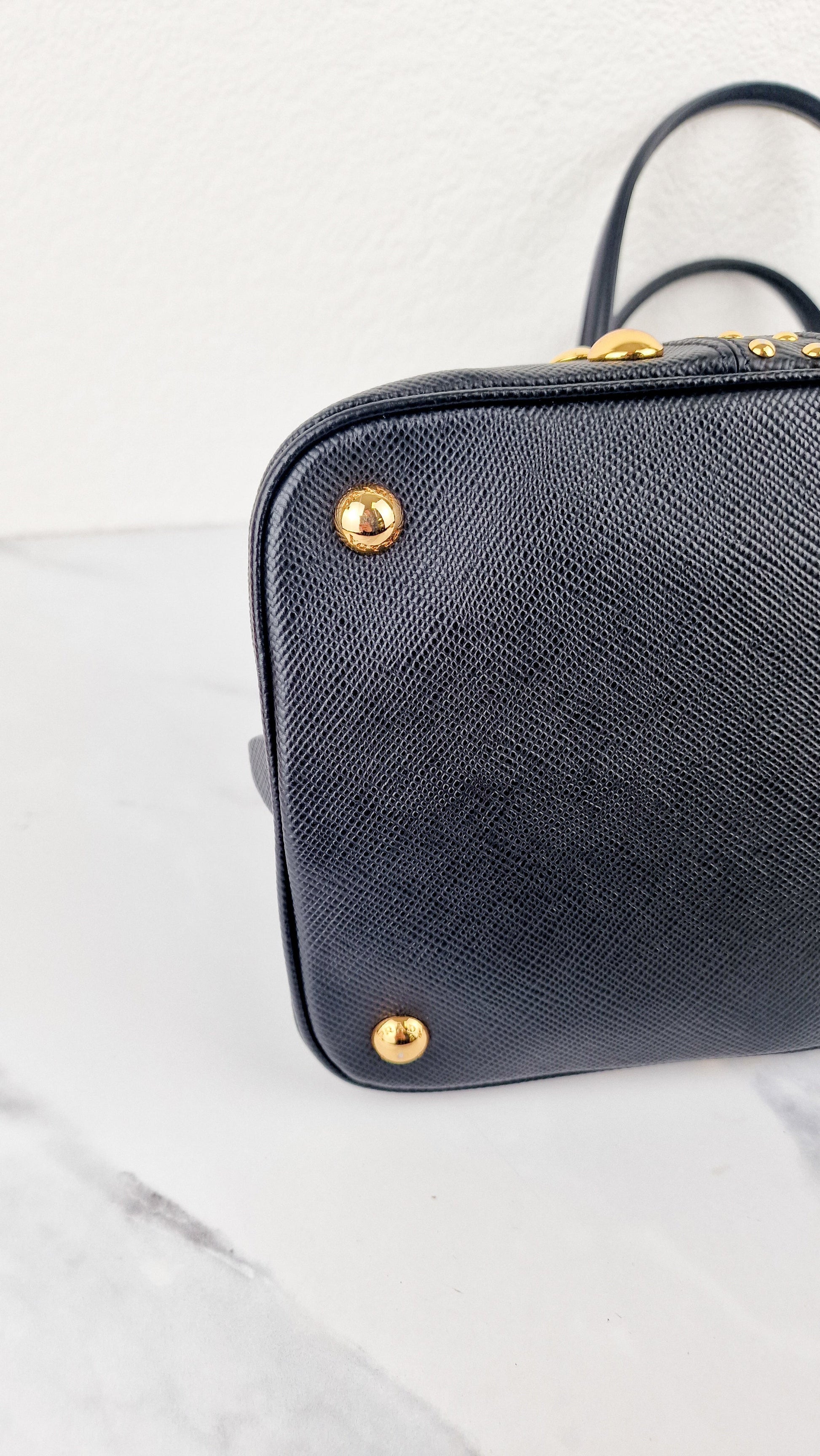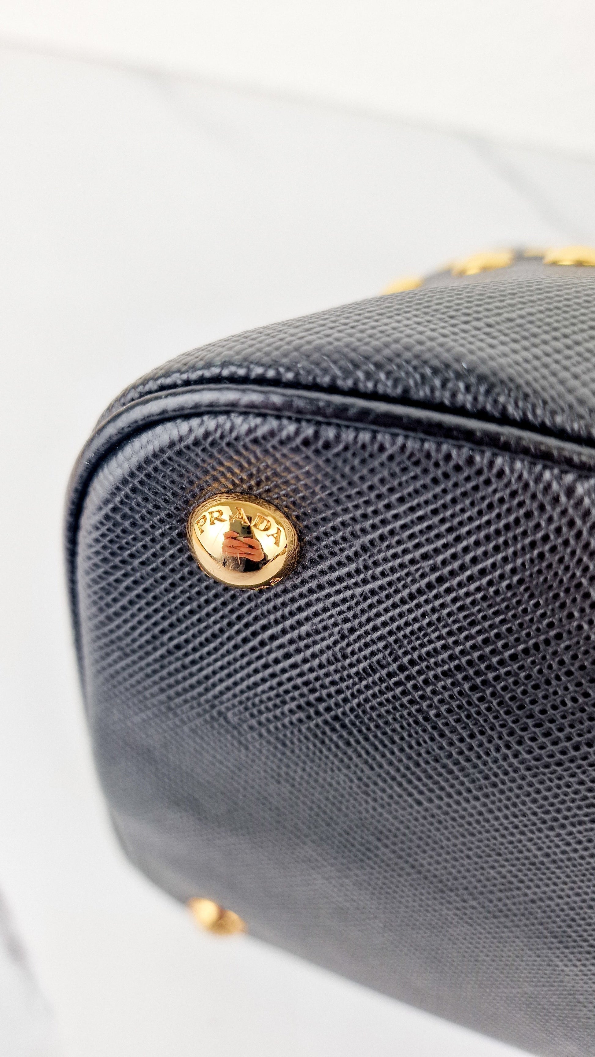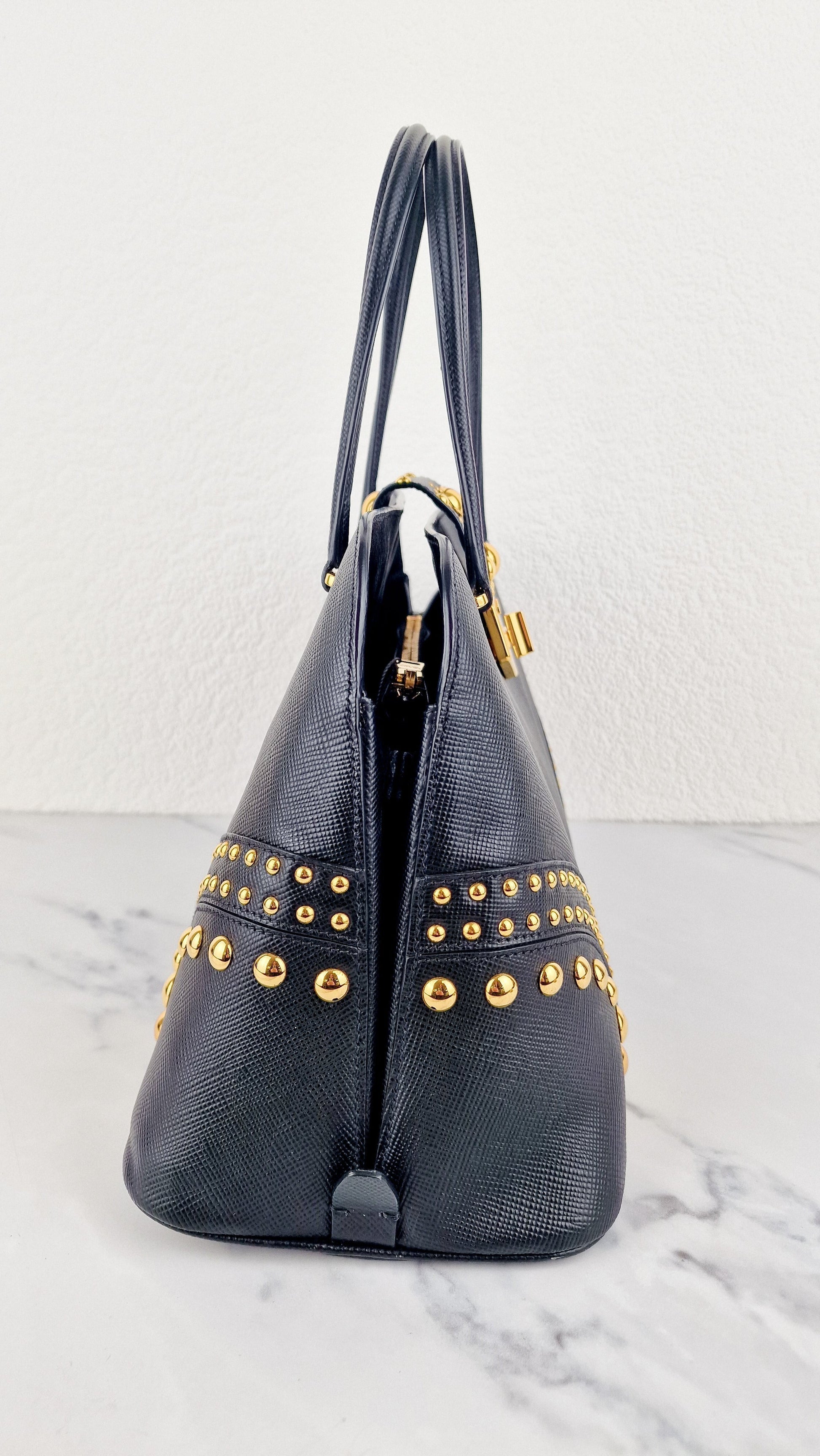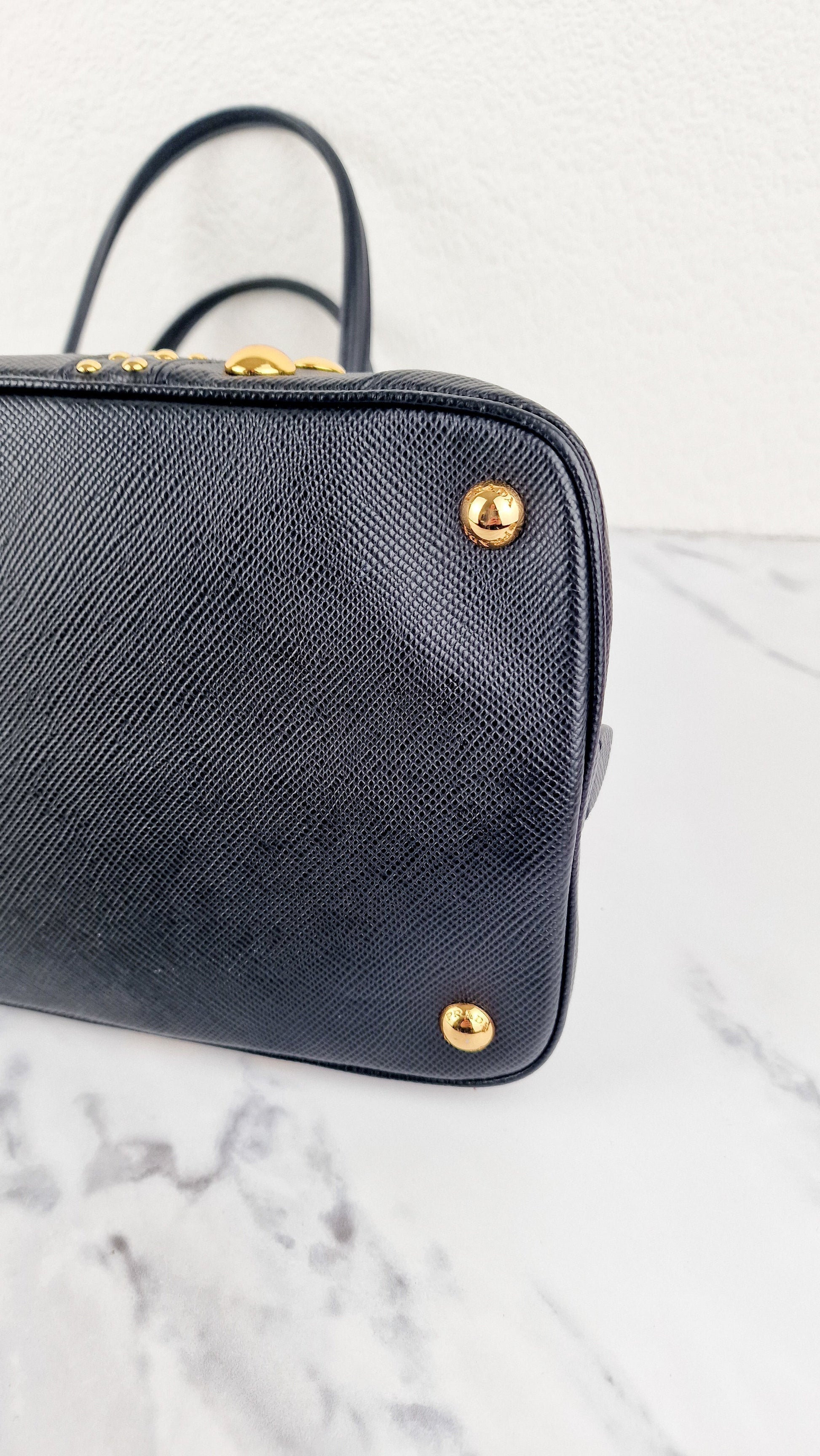 This is an absolutely beautiful Prada bag in classic black saffiano leather with gold hardware and rivets. It features red nappa leather lining giving a great pop of color! The bag consists of two good sized compartments divided by a zipped middle pocket and has both zipped and open flat pockets inside giving you lots of options for organization.