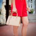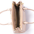 Details: Tan Saffiano Leather / Gold-Tone Hardware / Dual Rolled Top Handles / Beige Woven Lining / Dual Exterior Pockets With Zip Closure / One Large Compartment With Slit Pocket At One Wall And Zip Pocket At Opposite Wall / Detachable Shoulder Strap / Clasp Closure At Edges / Logo At Front Exterior / Key Chain Tethered At Handle