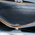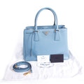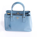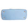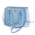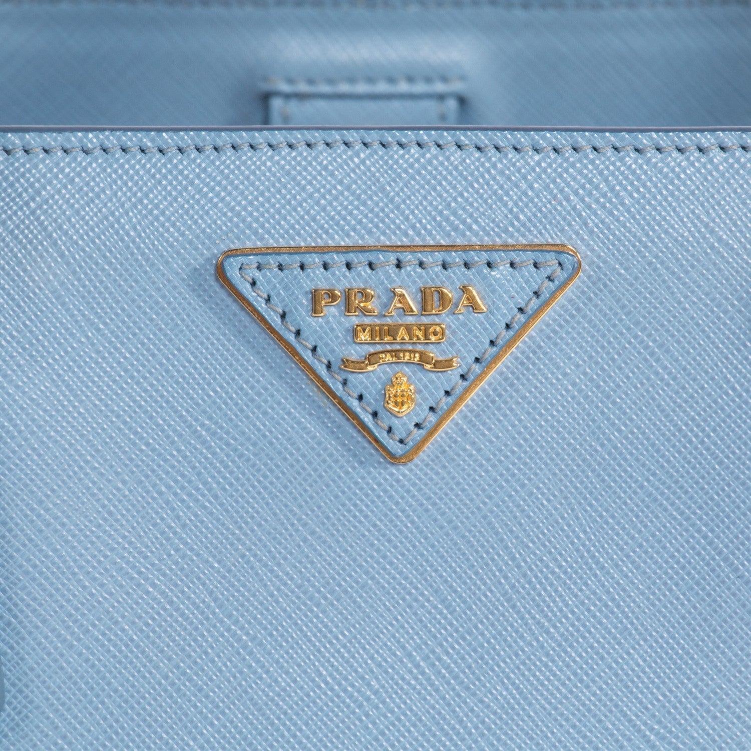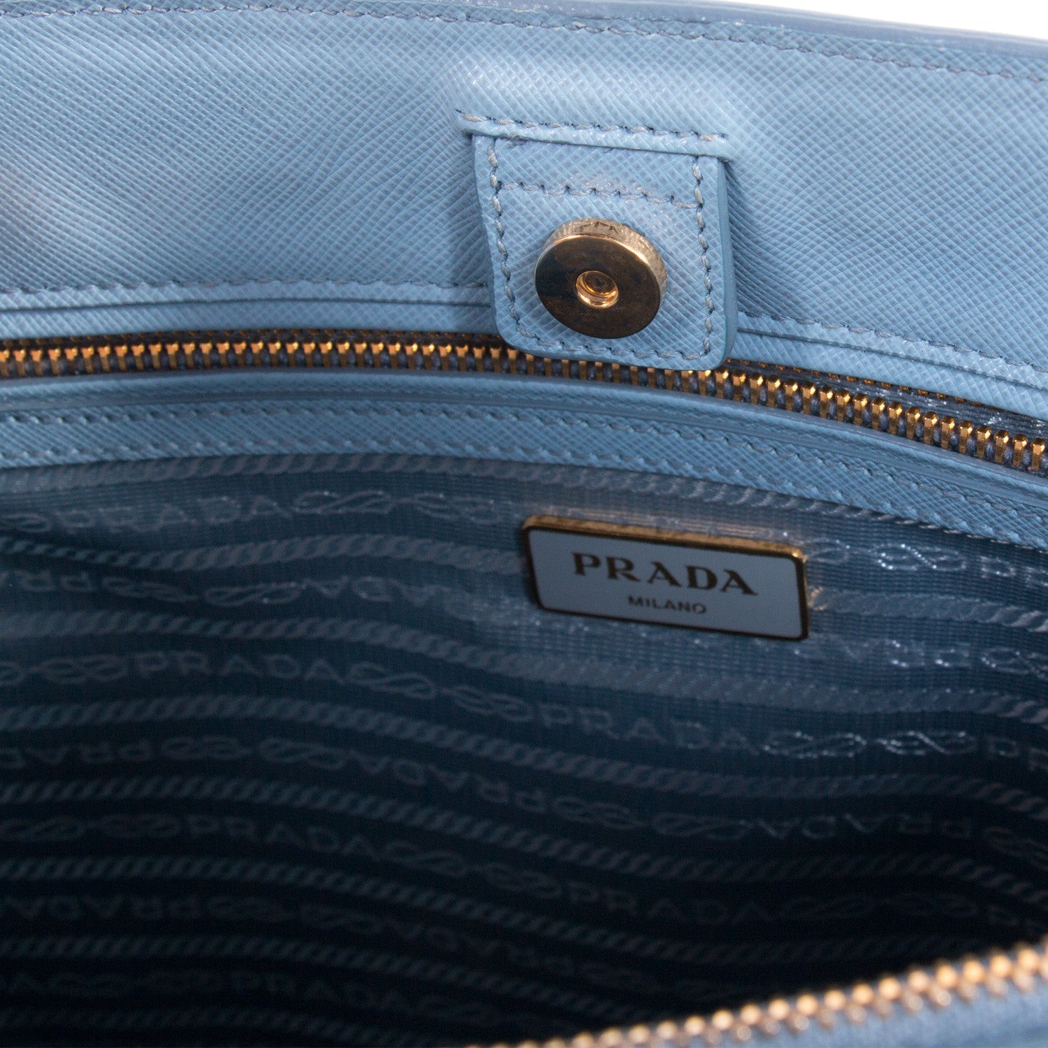 Details: Light Blue Saffiano Leather / Gold-Tone Hardware / Dual Rolled Top Handles / Adjustable Detachable Shoulder Strap / Tonal Stitching Throughout / Grey Interior Woven Lining / Three Large Compartments, One With Zip Closure / Dual Pockets At Interior Walls, One Slit Pocket And Another Zip Pocket / Magnetic Snap Closure On Top / Key Chain Tethered At Handle