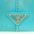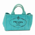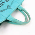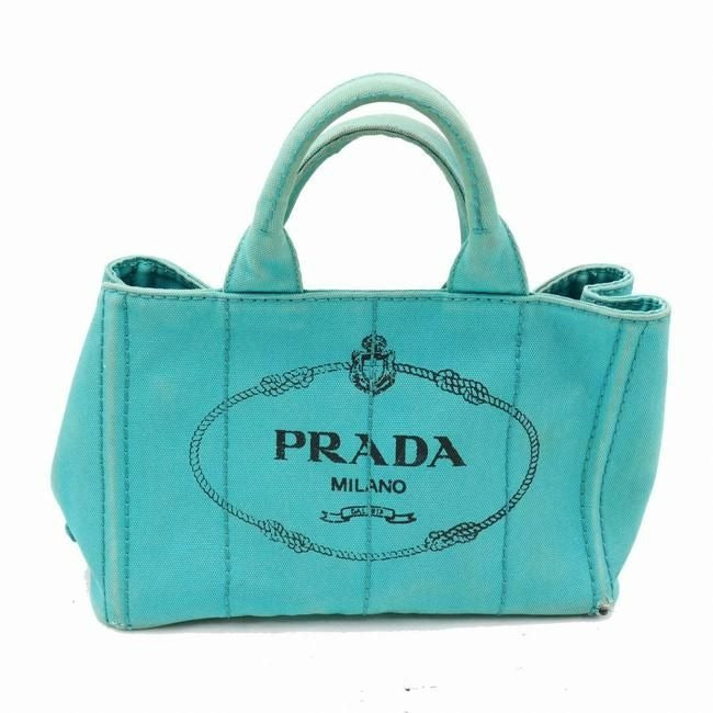 This is a fabulous, lightly used Prada 'Canapa' purse! The satchel has a tapered shape and is made of a turquoise bluish green heavy canvas with XL PRADA logo on one side in black. There are two hard handles, a footed bottom, gold hardware, and magnetic snaps on both sides to allow the purse to expand. It has two hooks on the interior to allow it to have a strap attached to become a cross body or shoulder bag! This limited edition, 'Canapa' two-way style purse was initially released in the 1990's and has been re-released by Prada- this is the new version!