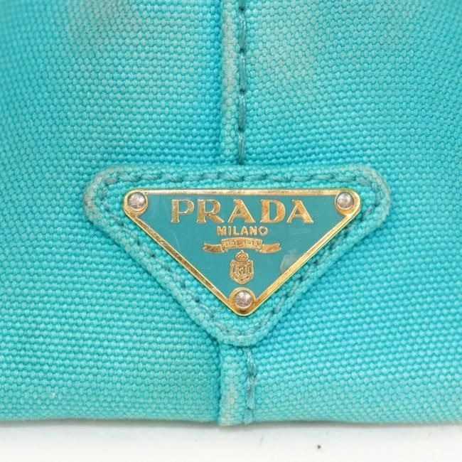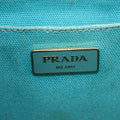 The interior is lined with the same turquoise canvas fabric and has one of the signature Prada logo plaques along the back with another one on the exterior side. Inside, there is one main compartment and several zip close and slot pockets to keep you organized. Inside the zip close pocket is the Prada, white authenticity tag with black ink with #204 on it.
