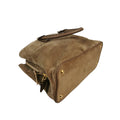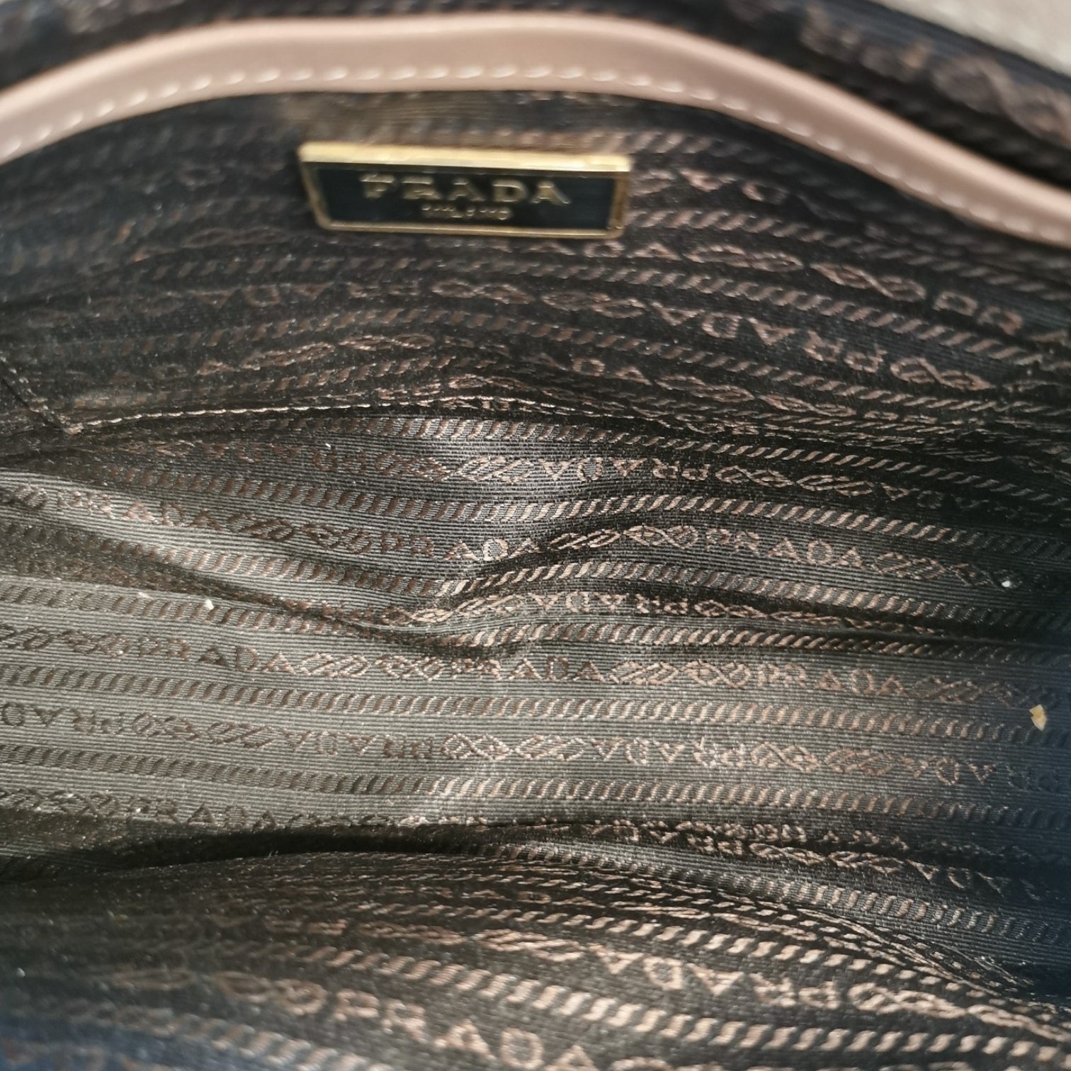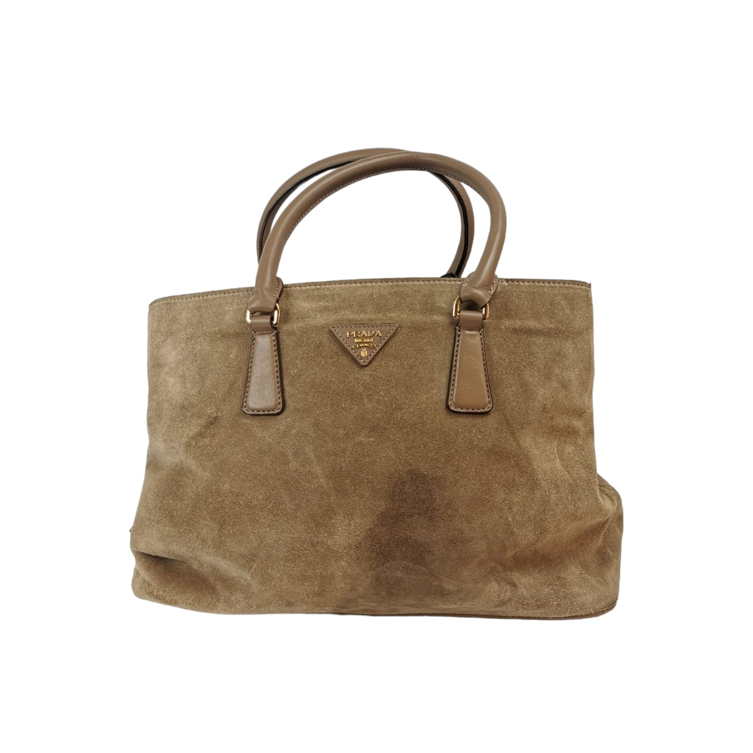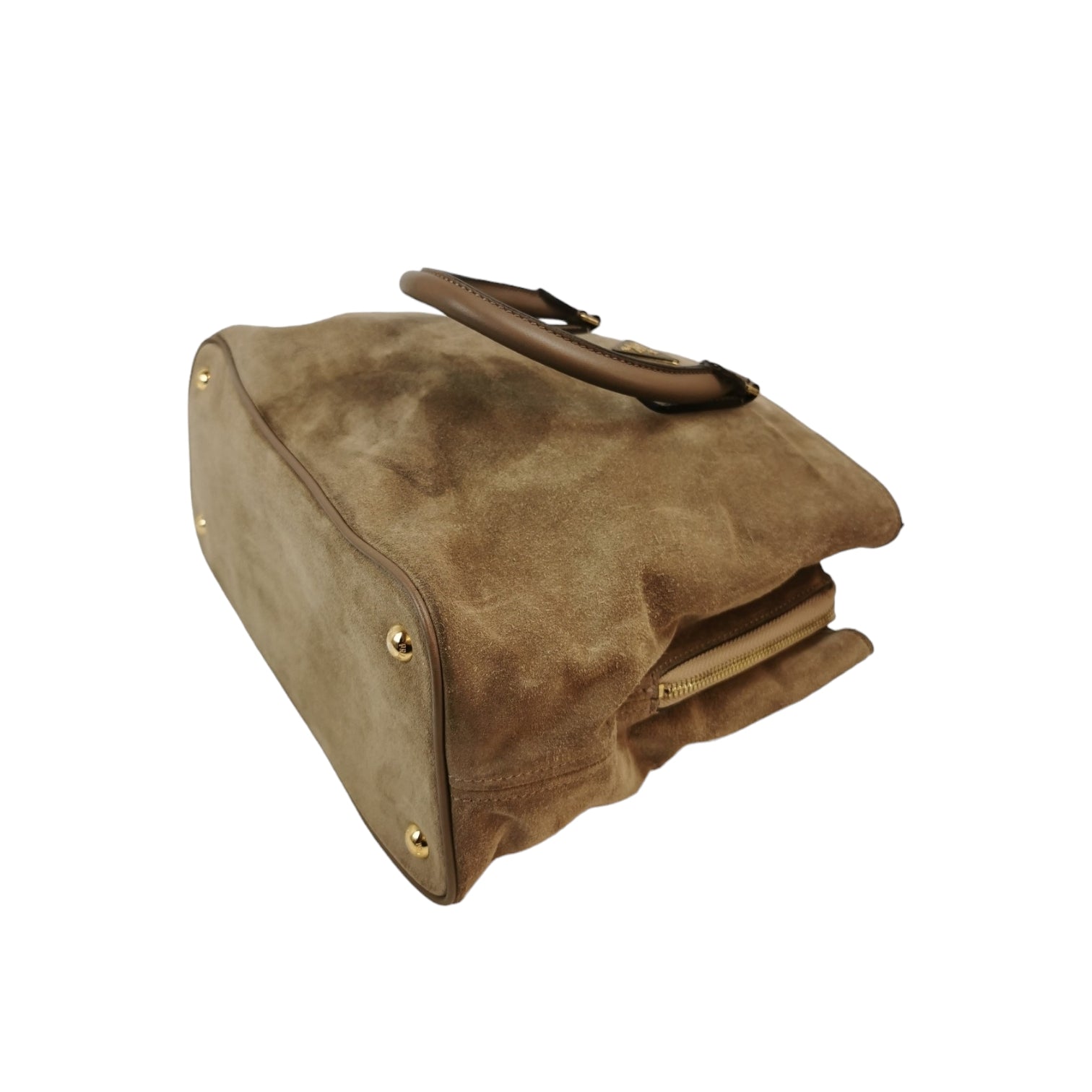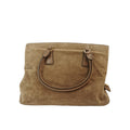 This Prada handbag was made of brown suede. The Bag features gold details. The Bag is in the hand or arm.