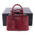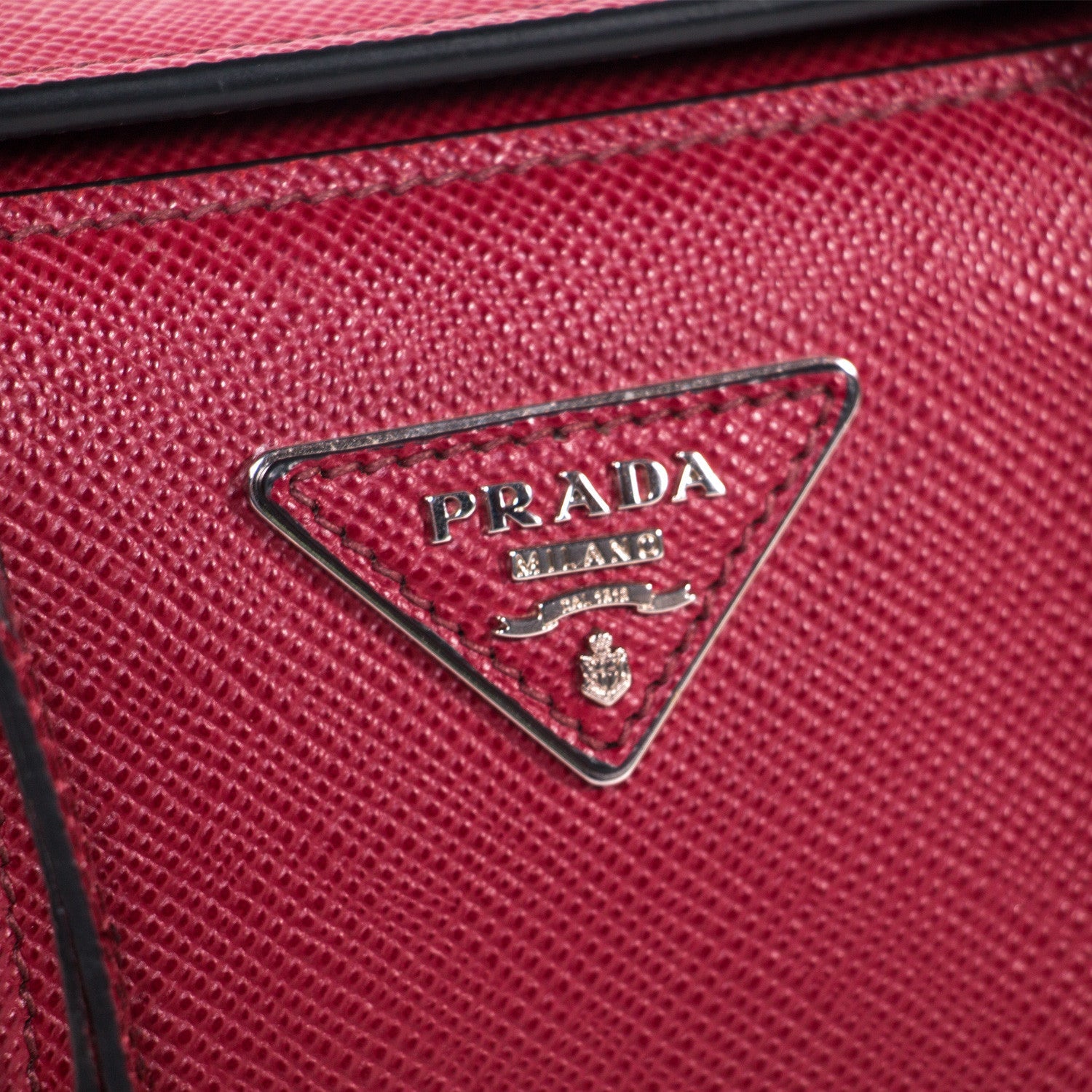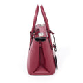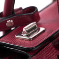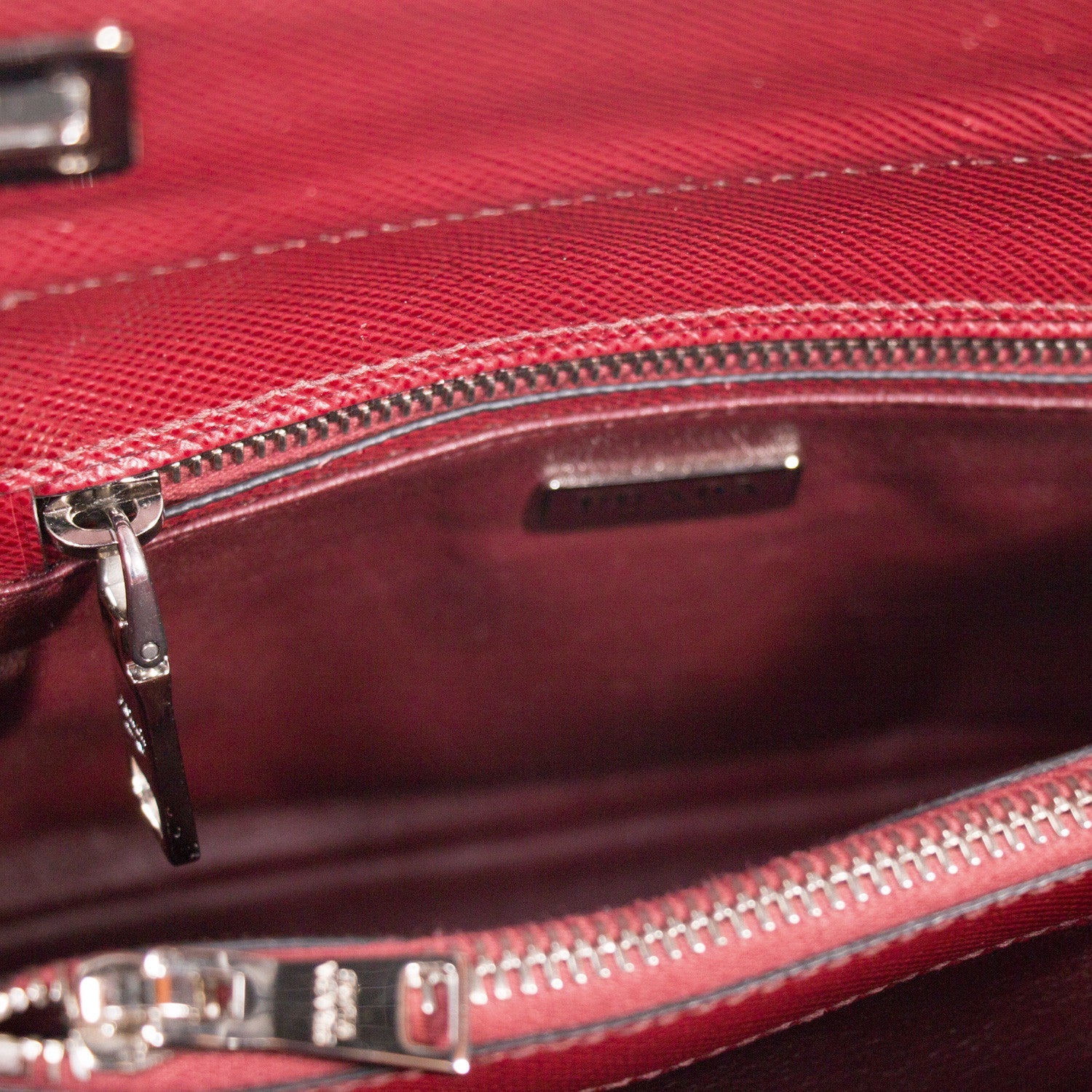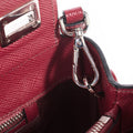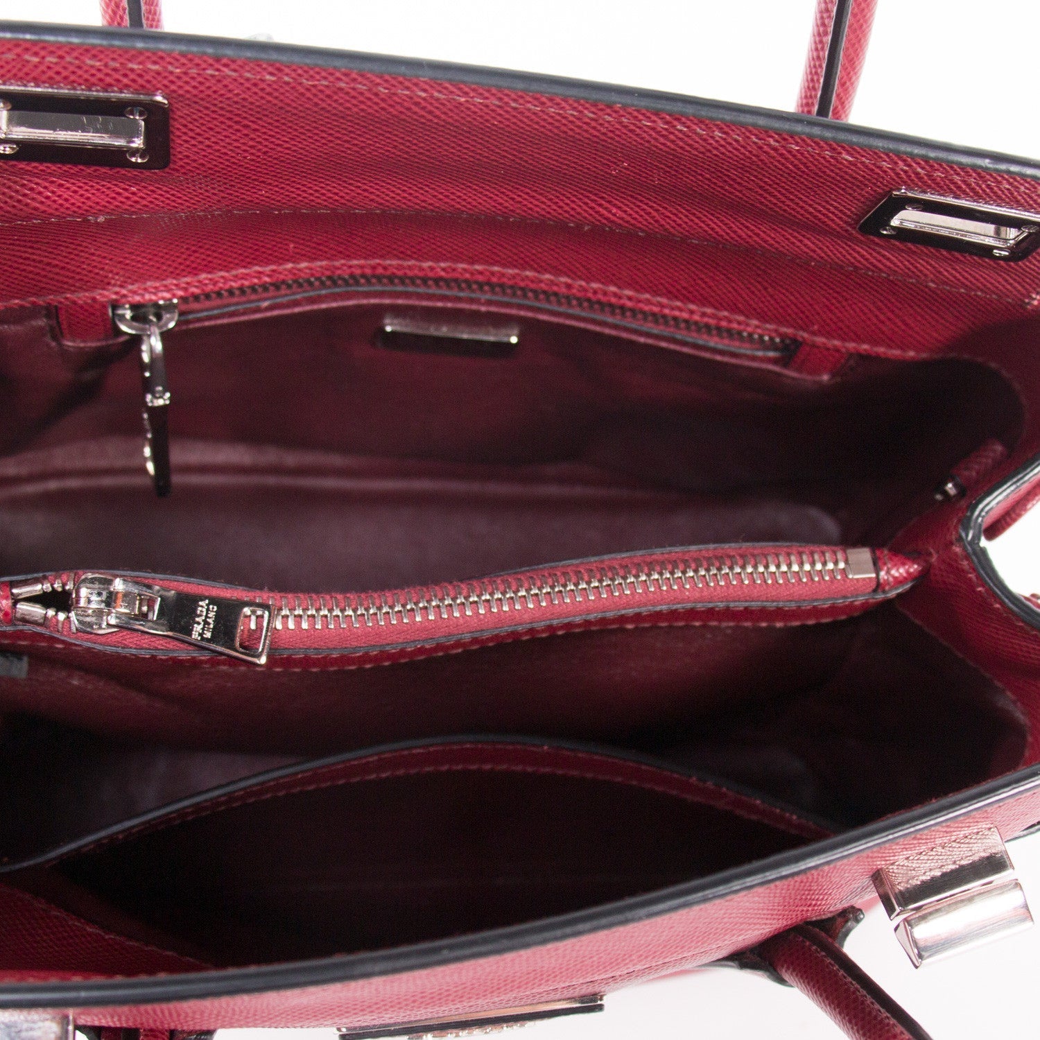 Details: Burgundy Saffiano Cuir Leather / Silver-Tone Hardware / Dual Rolled Handles / Adjustable Detachable Shoulder Strap / Marron Leather Lining / Three Compartments, One With Zip Closure / Zip Pocket And Slit Pocket At Interior / Dual Turn Lock Closure At Top / Protective Studs At Base