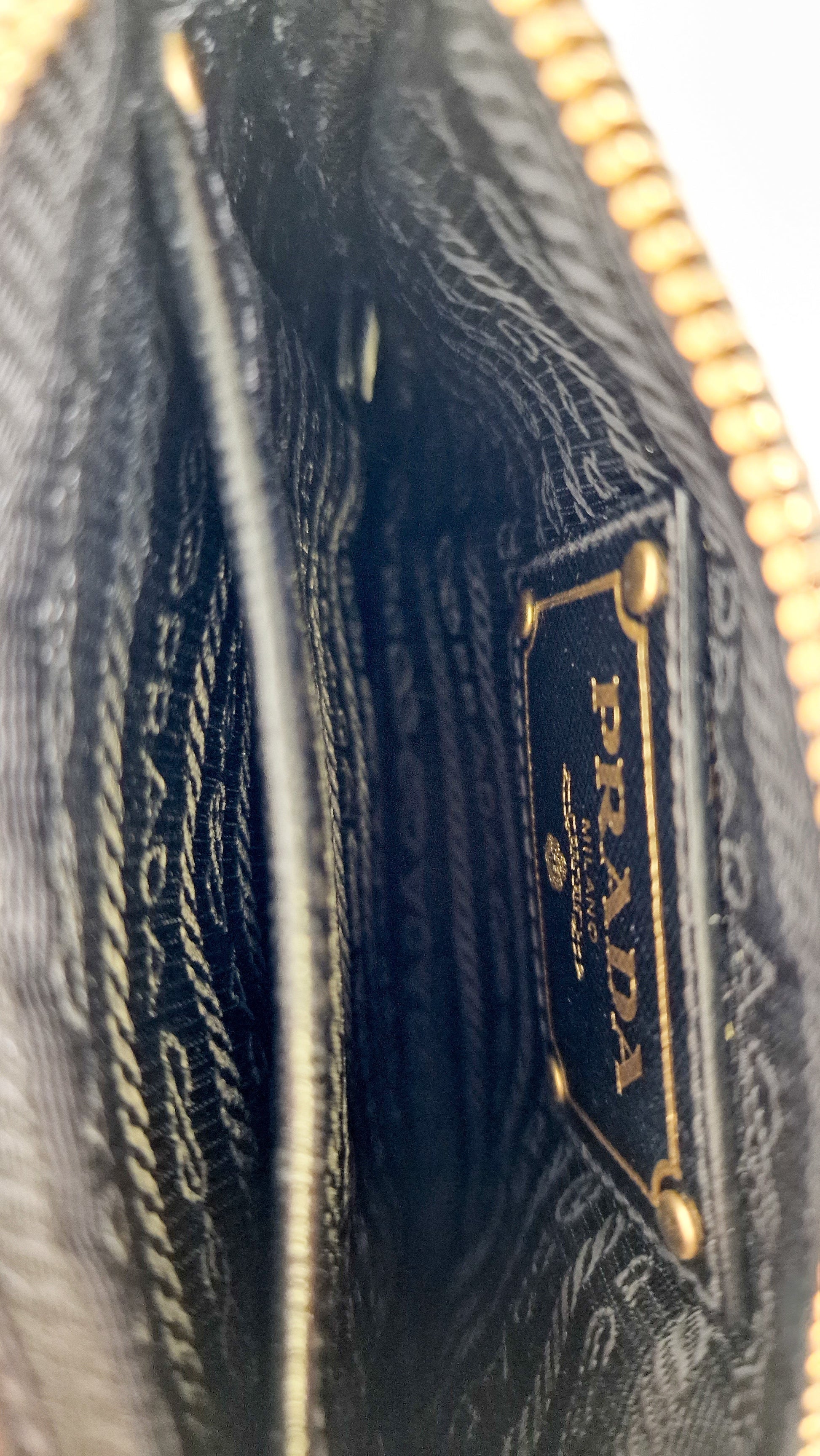 Inside, it features the classic Prada satin lining and has a small slip pocket and a saffiano leather Prada logo patch. It has zip top closure.