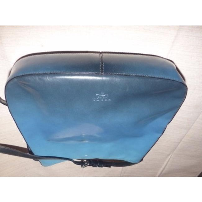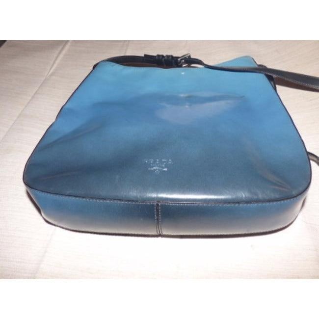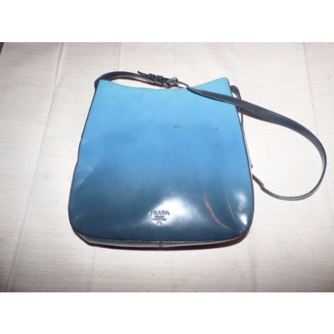 This is a fabulous, almost unused Prada purse! It is made of patent leather in beautiful condition! The color is amazing! It has a gradient of shades, starting darker at the bottom to a lighter sky blue at the top! There are two attached longer straps and a third that dictates the length! It is easily dressed up or worn with jeans. There is an open top and lots of room inside! The interior is the signature, Prada logo fabric. It is a unique style that will always be on trend!