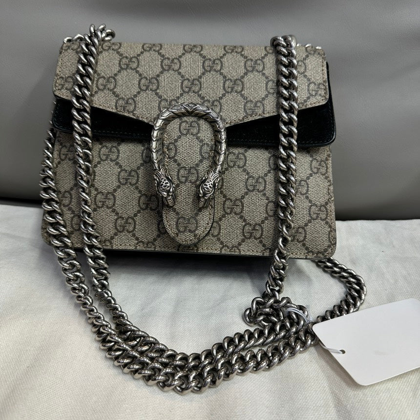 Gucci's Dionysus collection is inspired by the Greek God Dionysus, who is believed to have crossed the Tigris river on a tiger sent to him by Zeus.This work is made of GG Supreme canvas and suede luxury, perfectly blending the traditional and modern details of the house. The tiger head at the flip adds an artistic touch to the bag, and its internal dimensions are perfect, allowing for the dutiful storage of essential items. Show off this exquisite creativity with the help of chain links.